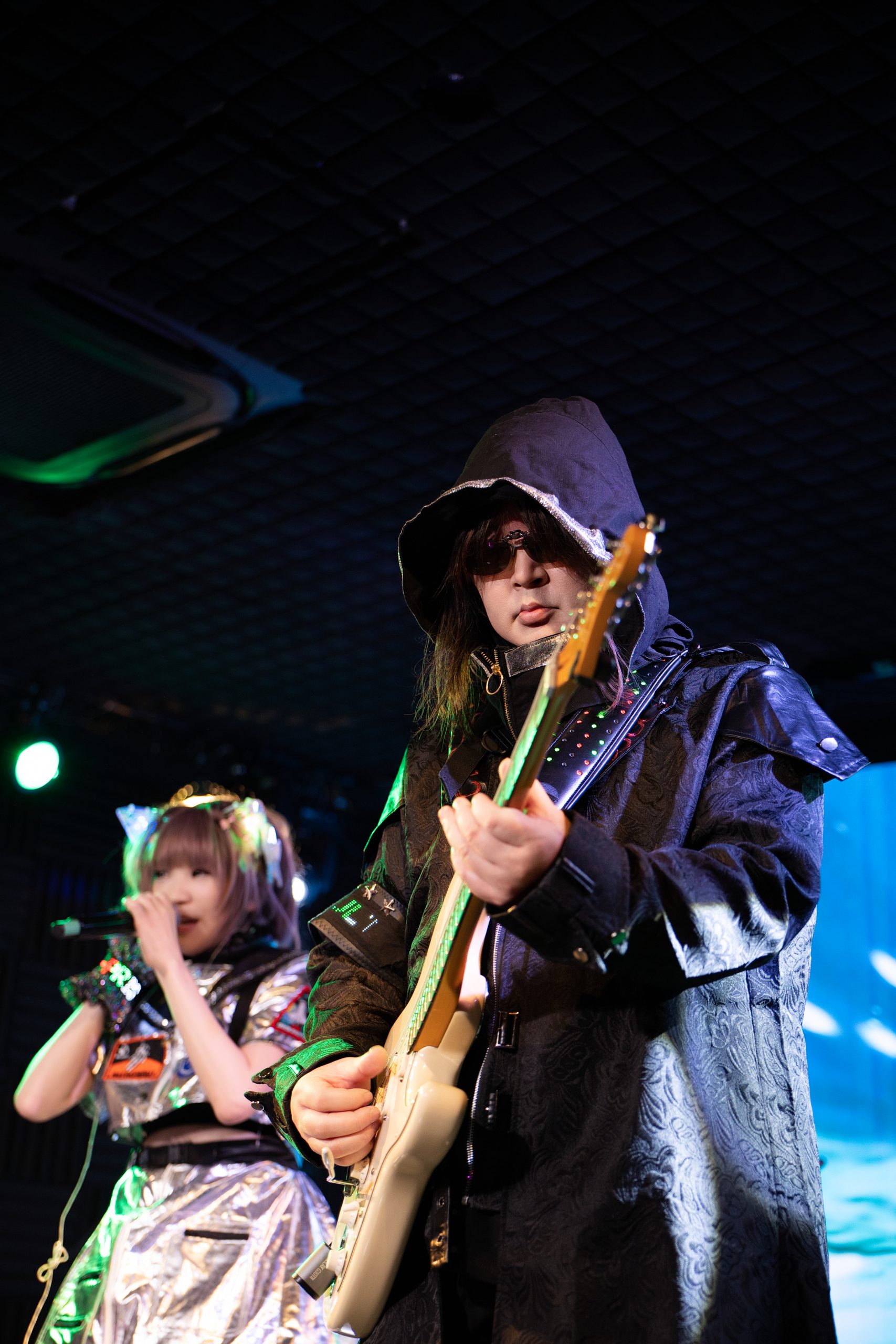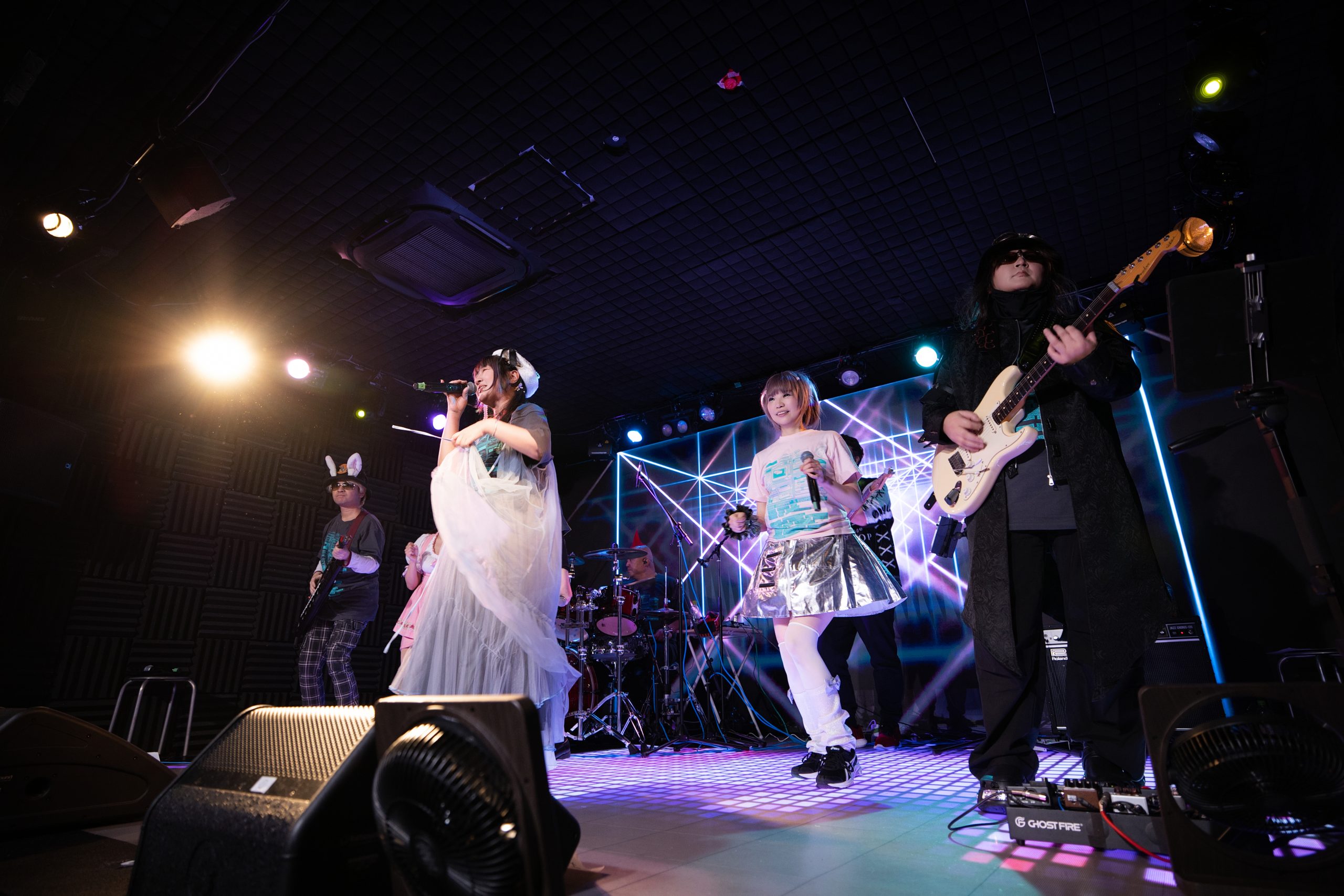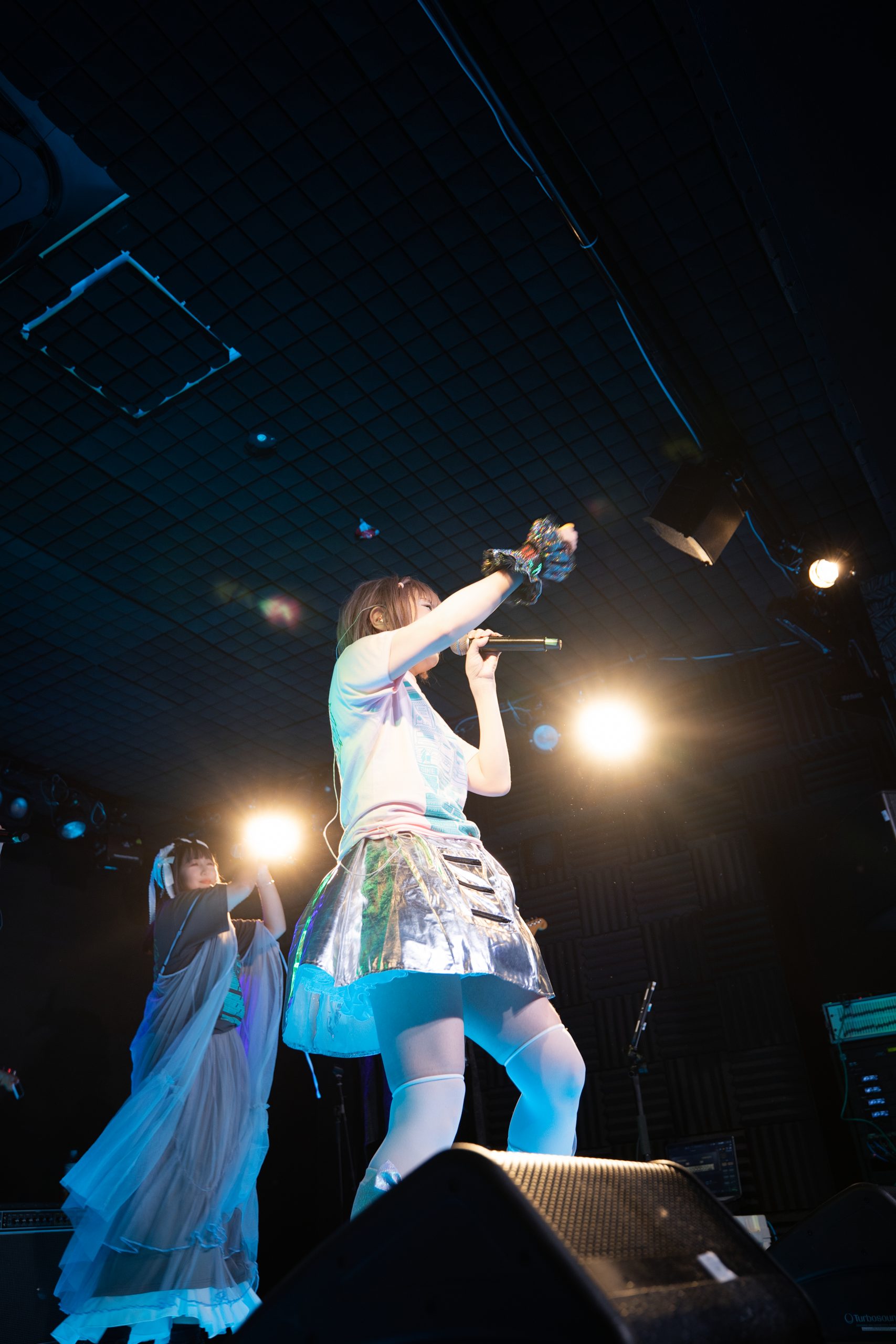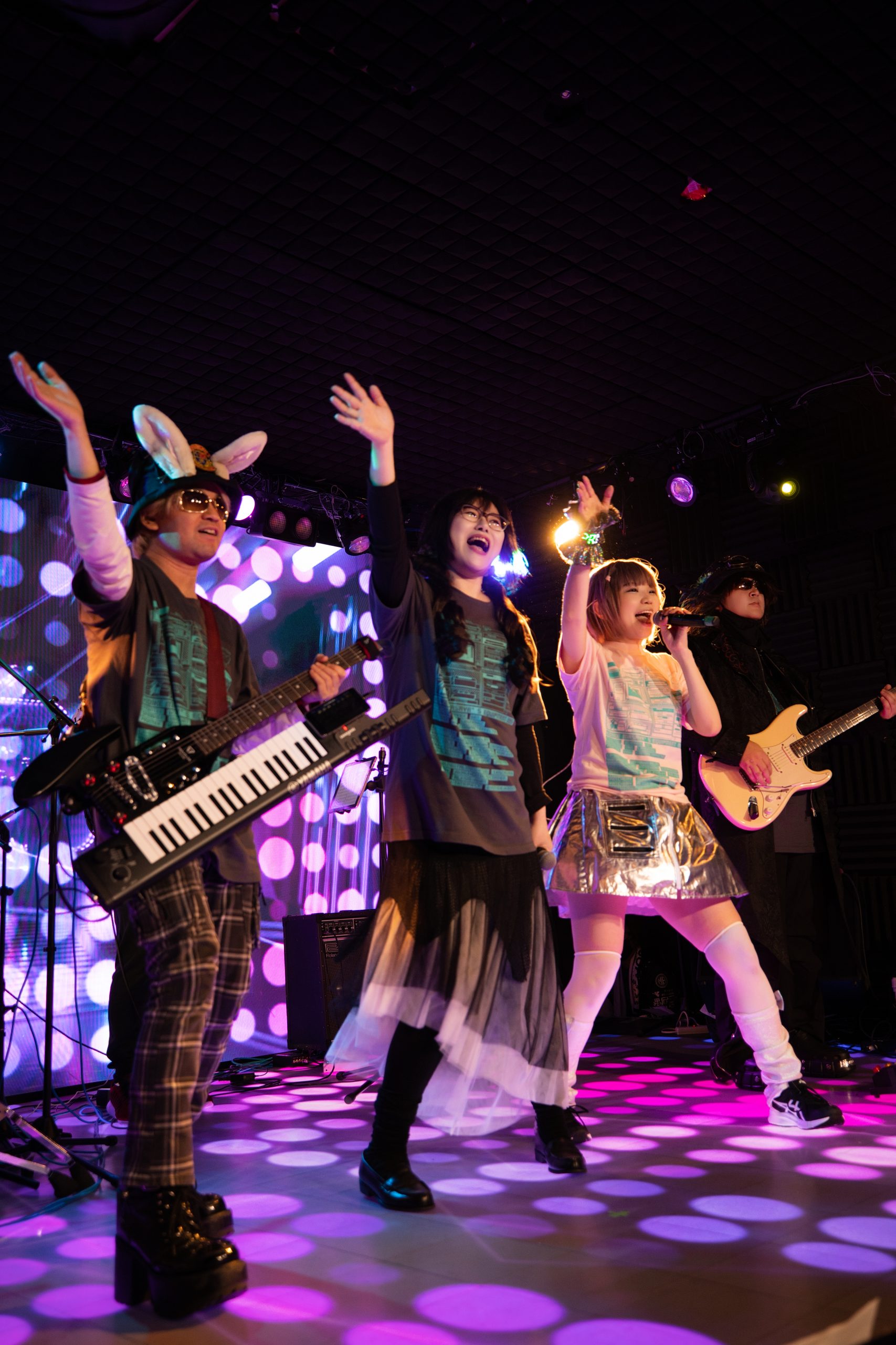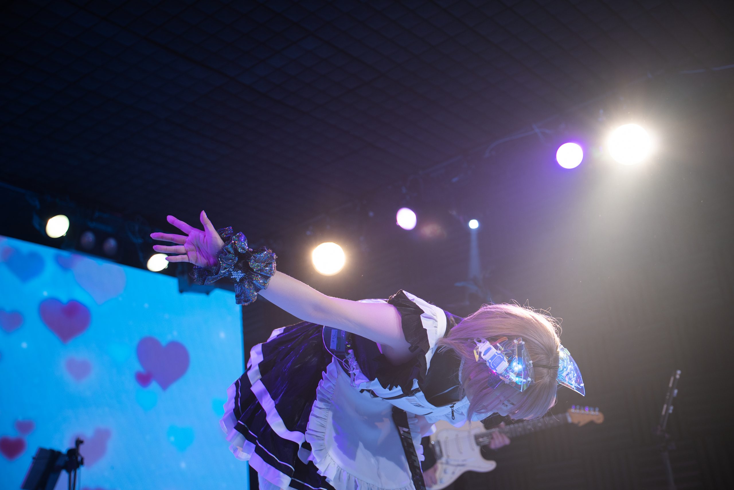 MOSAIC.WAV+ULTRA-PRISMとして最初に届けたのが、アニキが初めてMOSAIC.WAVと一緒に作った『君は何テラバイト?』。どこか懐かしさを覚えるレトロポップ/テクノチューンだ。理系電波ソングともいえる歌詞は2000年代から未来へのメッセージのようで、アニキの伸びやかなギターの音色も心地好い。月宮うさぎとみ〜こがマイクをリレーしながら歌う姿にも、キュンとしたときめきを感じ続けていた。サウンドはピコピコ弾けながらも、メロウで歌謡チックな歌に、ちょっとノスタルジーな気分も覚える。間奏では、アニキがフロントに立ってギターソロを披露。その横へ、さりげなくかやぴーが寄り添えば、フロア中から熱情した声が上がっていたのも印象深い景色だった。この曲で自由奔放にギターの音を響かせていたアニキの姿が、とにかく格好よかった。