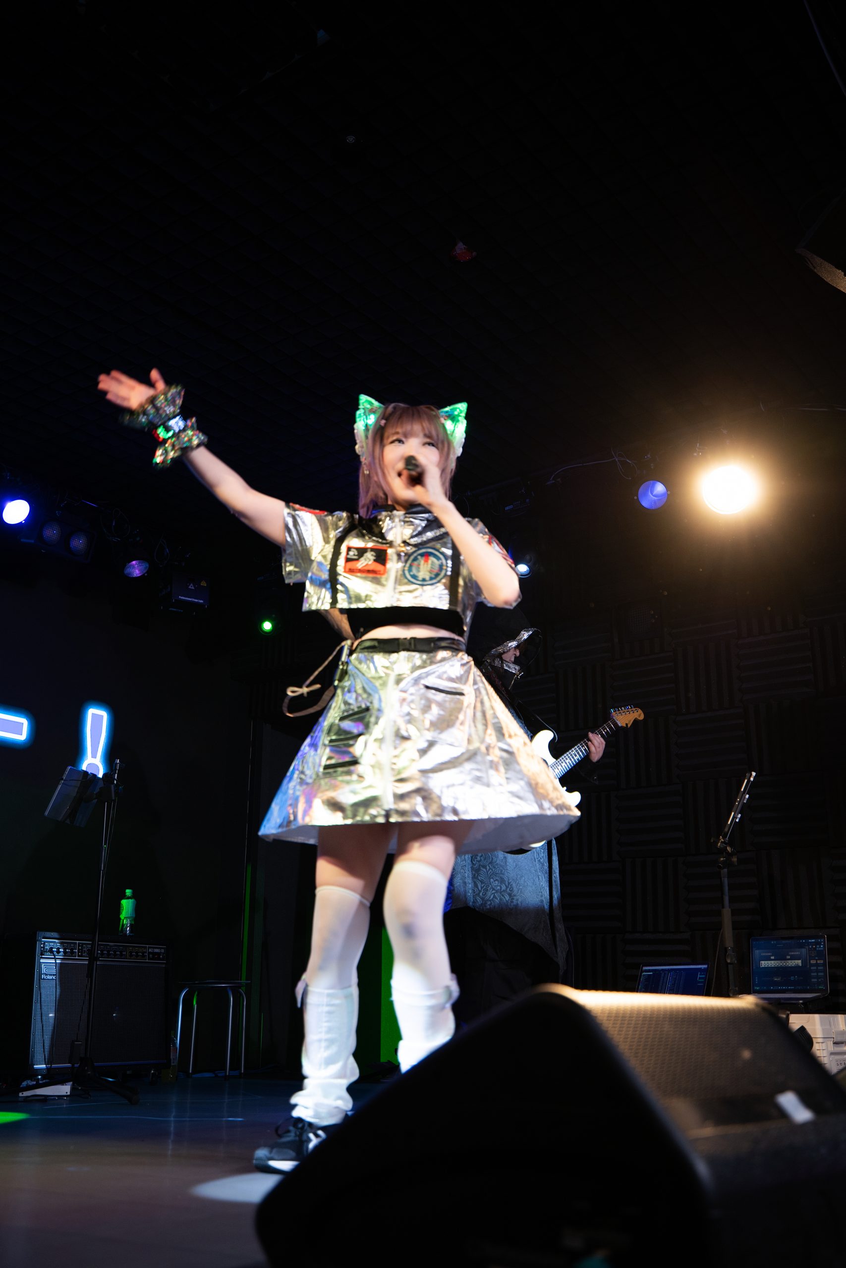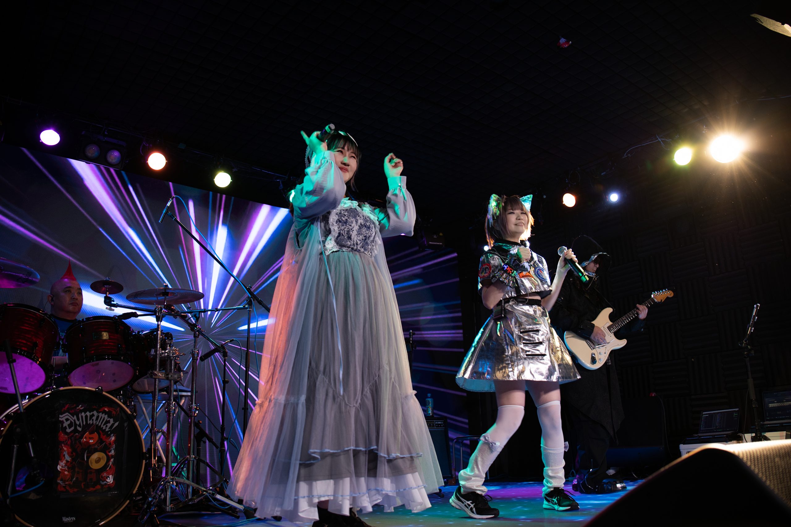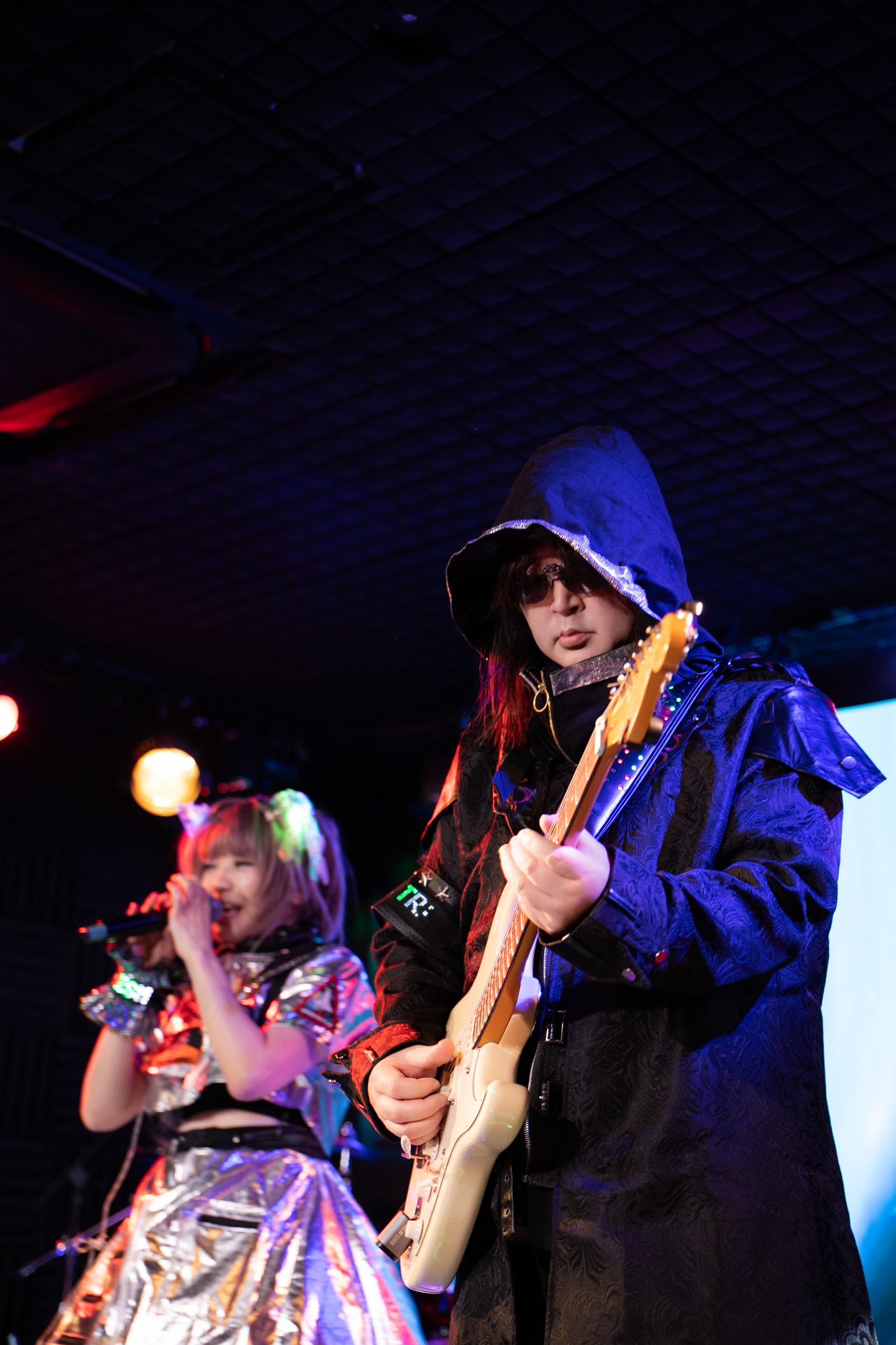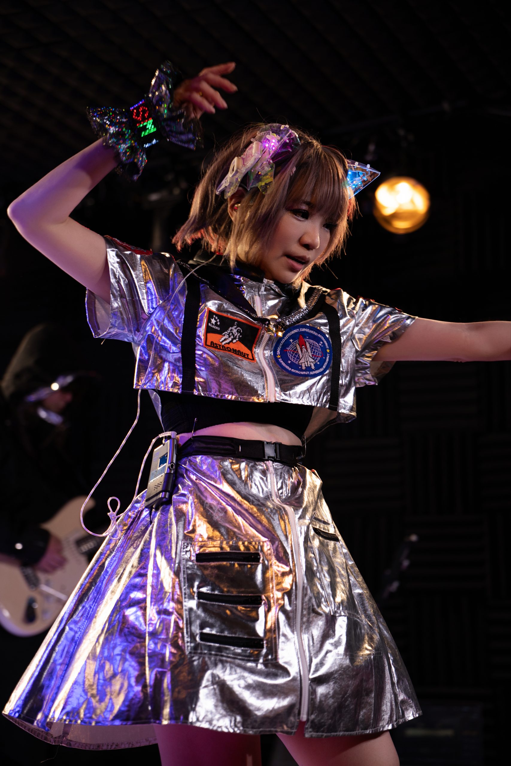 MOSAIC.WAV+ULTRA-PRISMとして最初に届けたのが、アニキが初めてMOSAIC.WAVと一緒に作った『君は何テラバイト?』。どこか懐かしさを覚えるレトロポップ/テクノチューンだ。理系電波ソングともいえる歌詞は2000年代から未来へのメッセージのようで、アニキの伸びやかなギターの音色も心地好い。月宮うさぎとみ〜こがマイクをリレーしながら歌う姿にも、キュンとしたときめきを感じ続けていた。サウンドはピコピコ弾けながらも、メロウで歌謡チックな歌に、ちょっとノスタルジーな気分も覚える。間奏では、アニキがフロントに立ってギターソロを披露。その横へ、さりげなくかやぴーが寄り添えば、フロア中から熱情した声が上がっていたのも印象深い景色だった。この曲で自由奔放にギターの音を響かせていたアニキの姿が、とにかく格好よかった。
