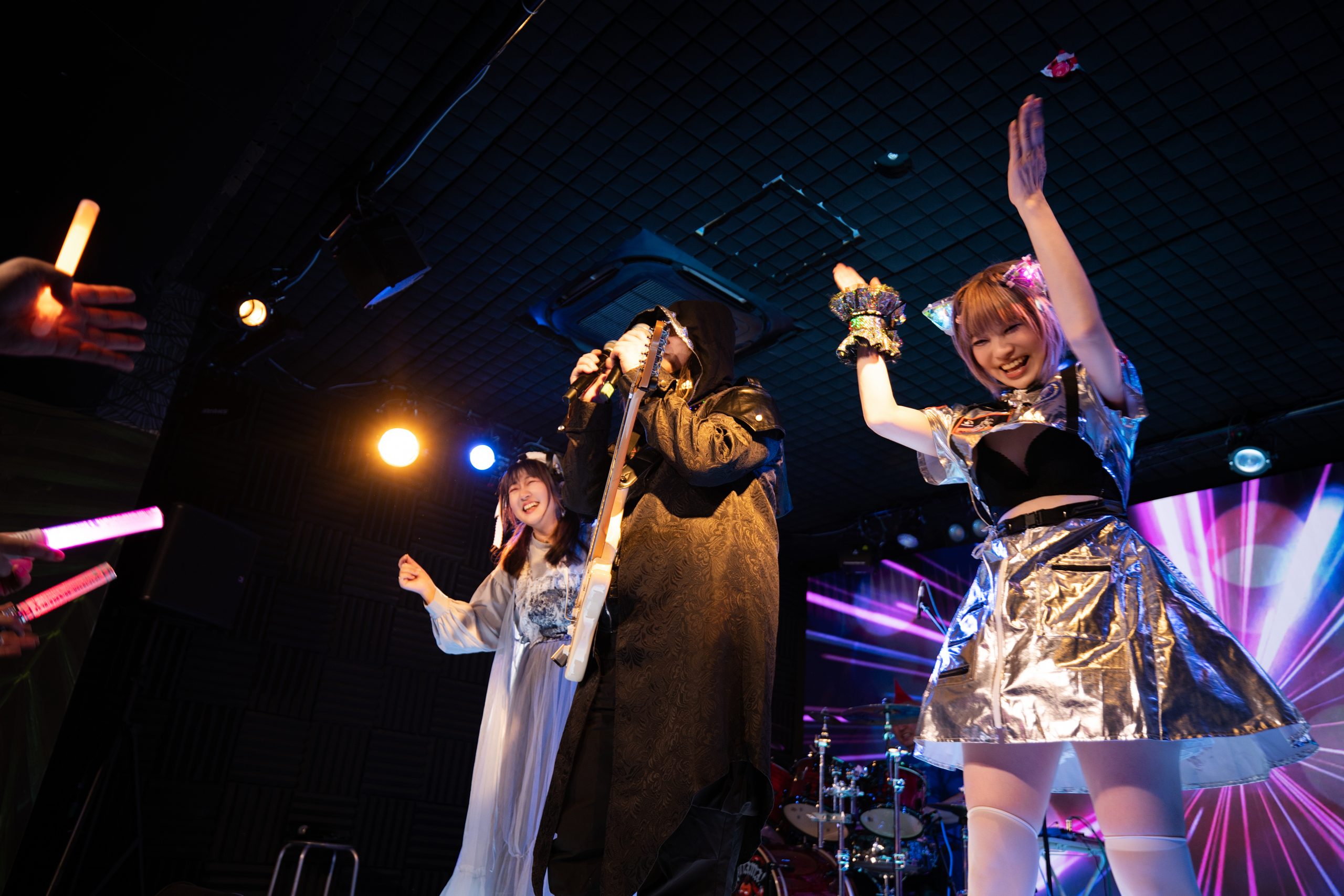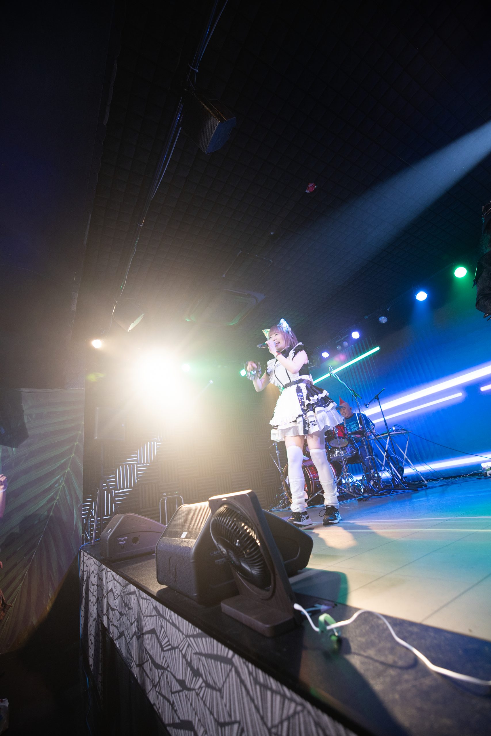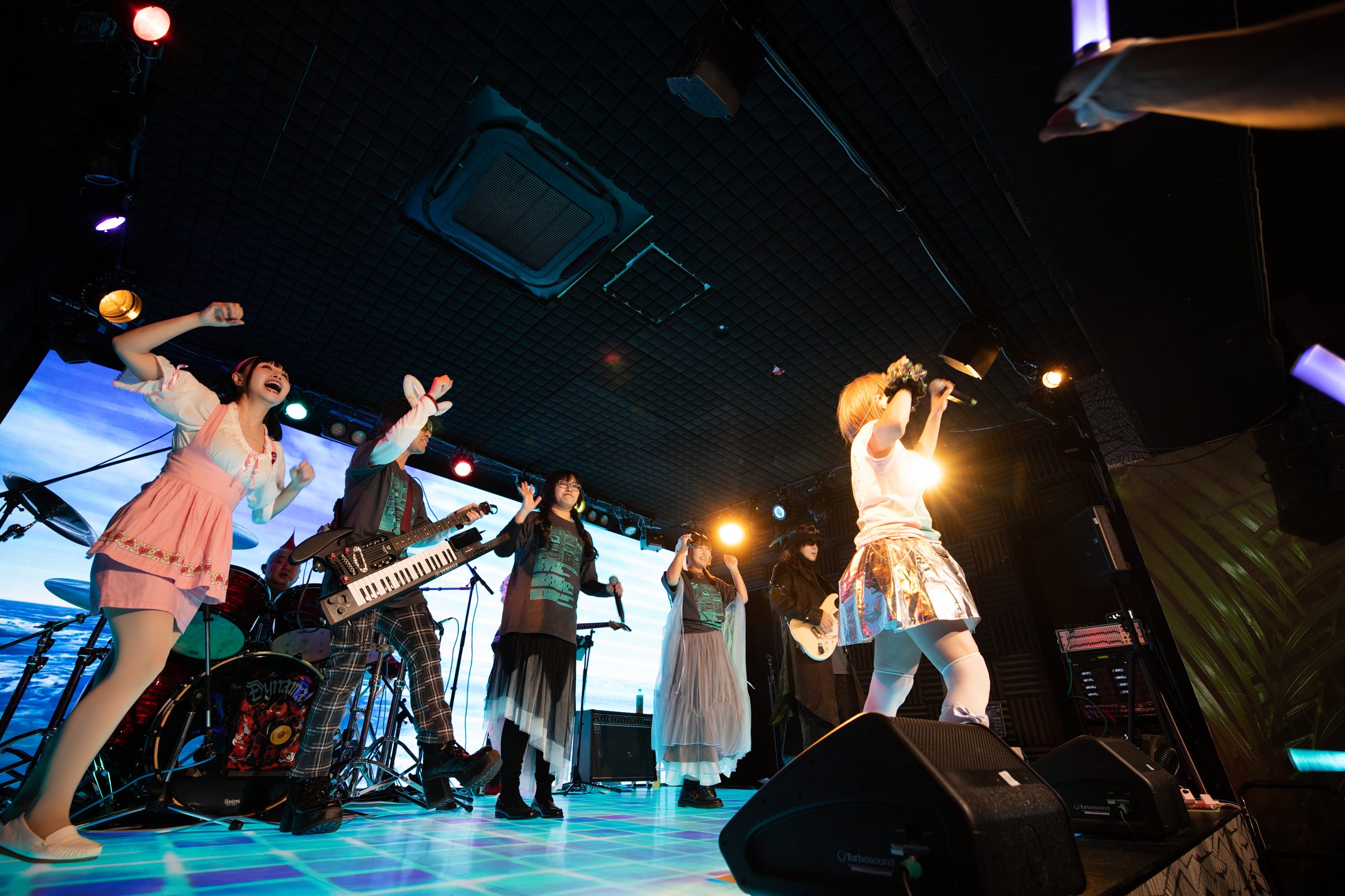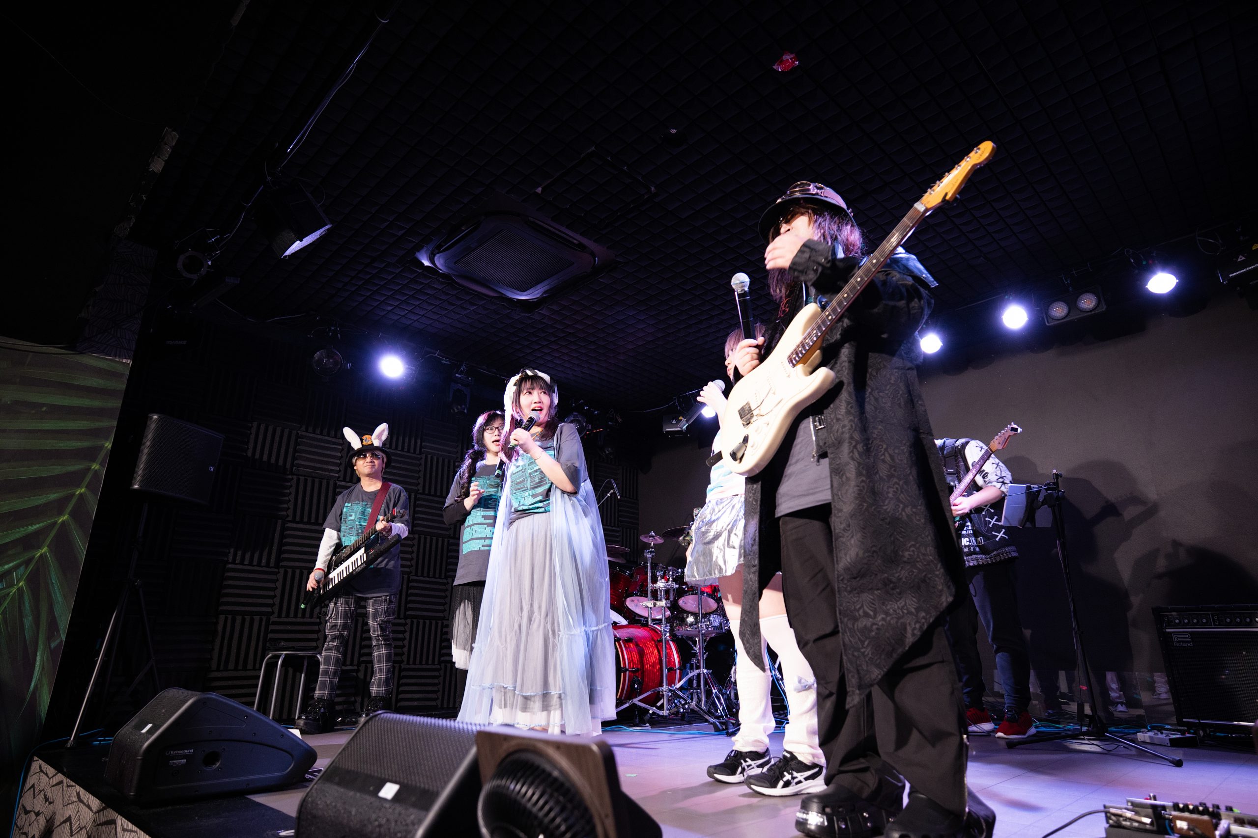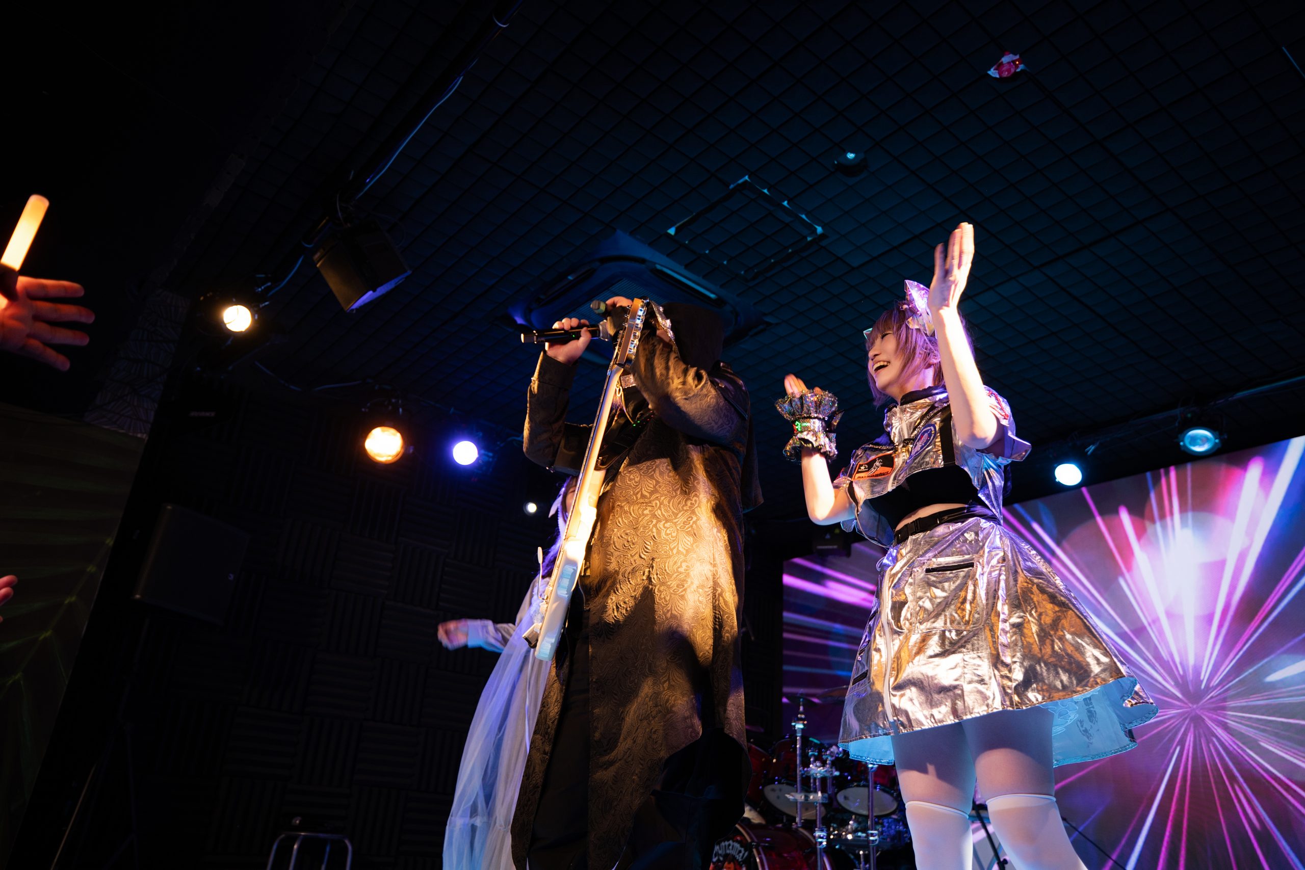 MOSAIC.WAV+ULTRA-PRISMとして最初に届けたのが、アニキが初めてMOSAIC.WAVと一緒に作った『君は何テラバイト?』。どこか懐かしさを覚えるレトロポップ/テクノチューンだ。理系電波ソングともいえる歌詞は2000年代から未来へのメッセージのようで、アニキの伸びやかなギターの音色も心地好い。月宮うさぎとみ〜こがマイクをリレーしながら歌う姿にも、キュンとしたときめきを感じ続けていた。サウンドはピコピコ弾けながらも、メロウで歌謡チックな歌に、ちょっとノスタルジーな気分も覚える。間奏では、アニキがフロントに立ってギターソロを披露。その横へ、さりげなくかやぴーが寄り添えば、フロア中から熱情した声が上がっていたのも印象深い景色だった。この曲で自由奔放にギターの音を響かせていたアニキの姿が、とにかく格好よかった。