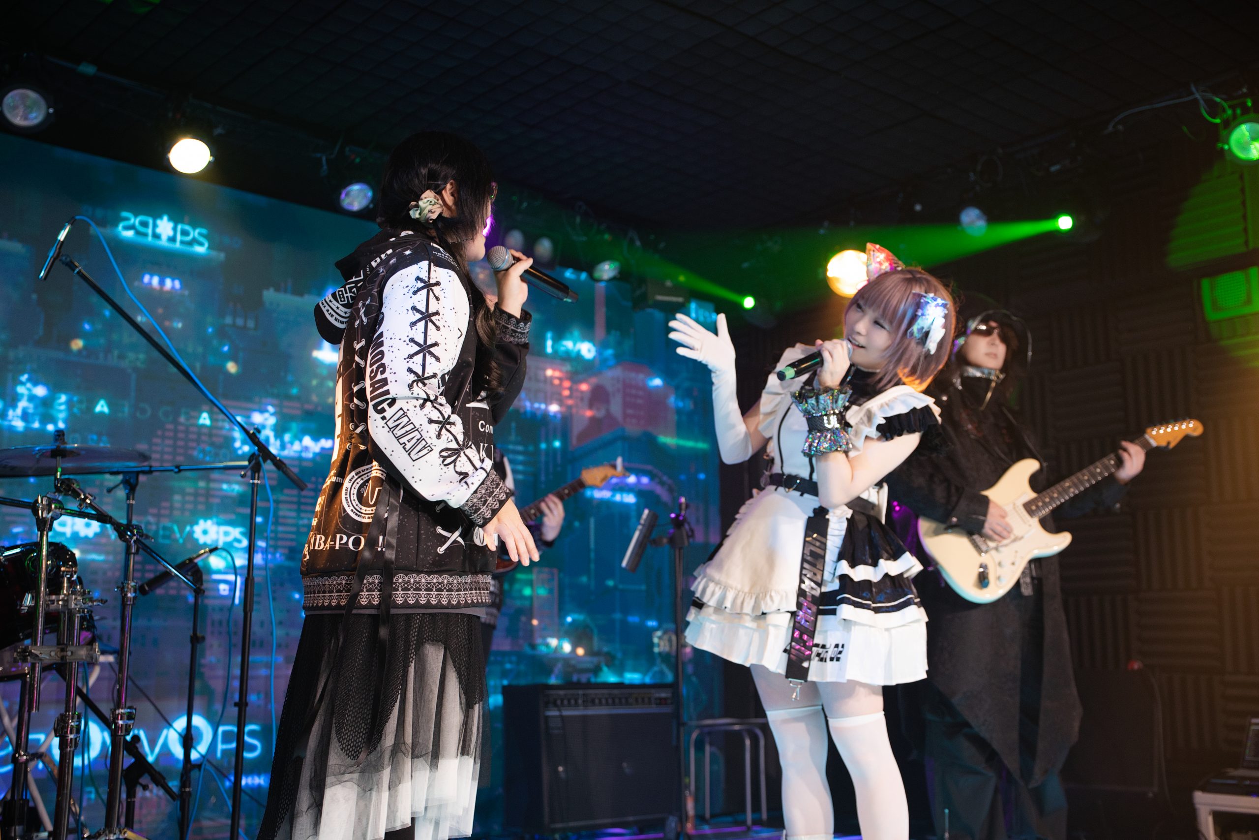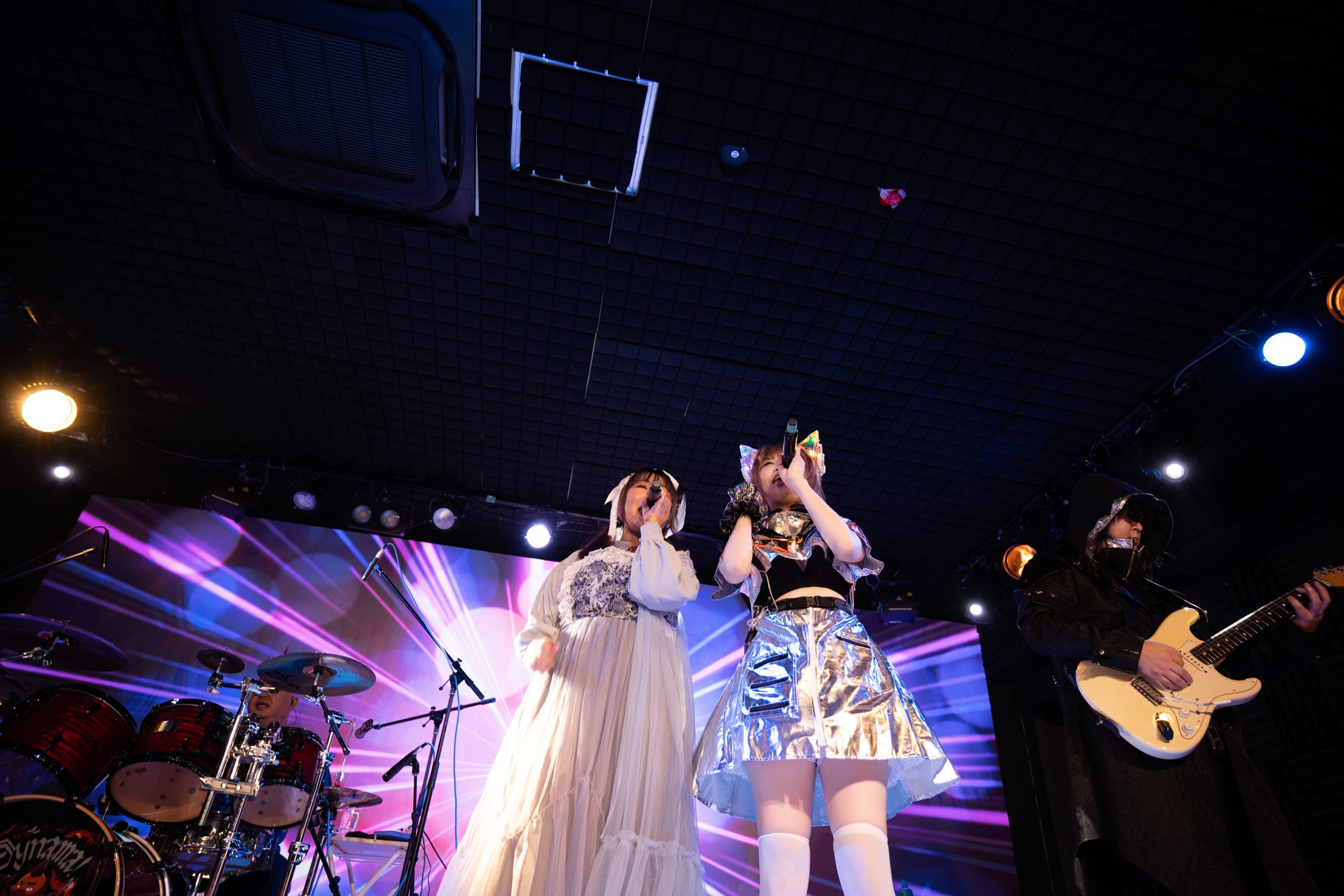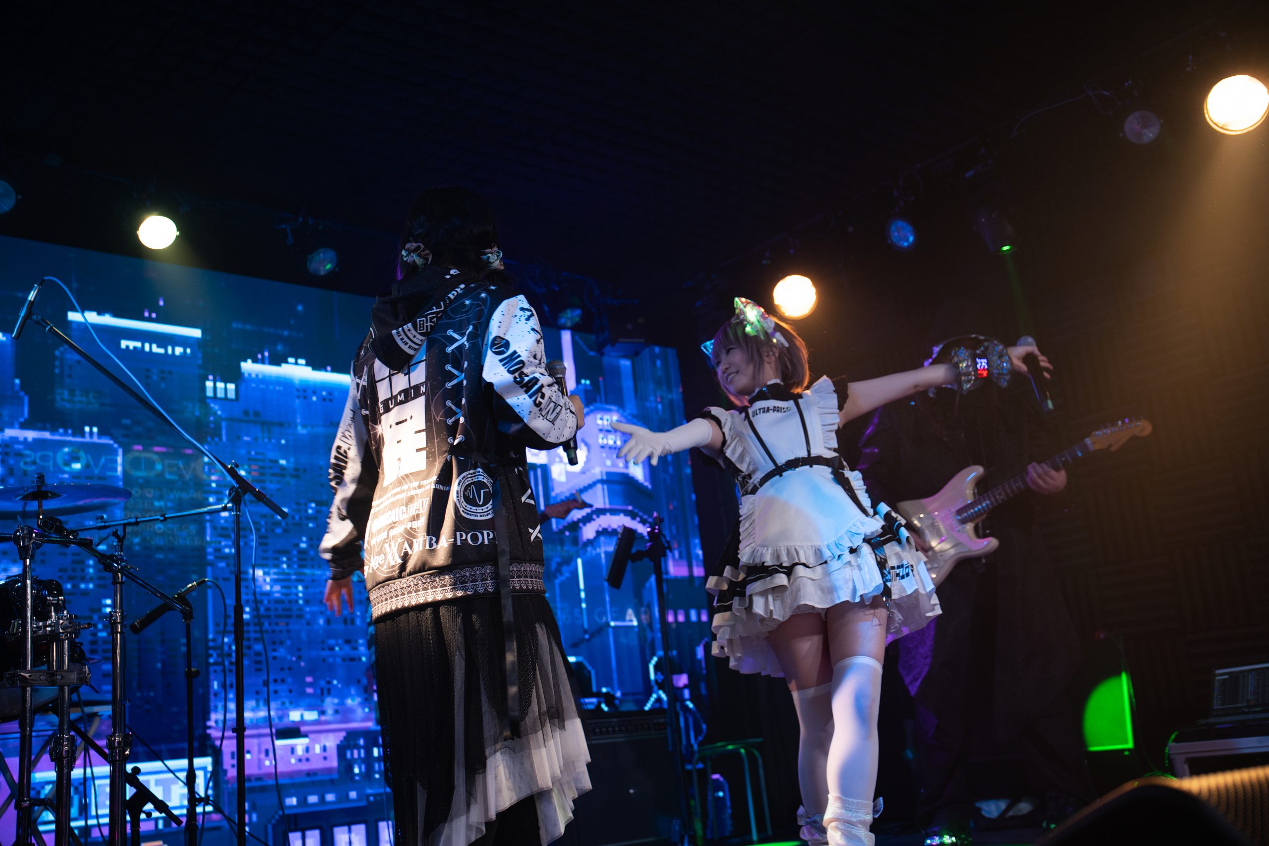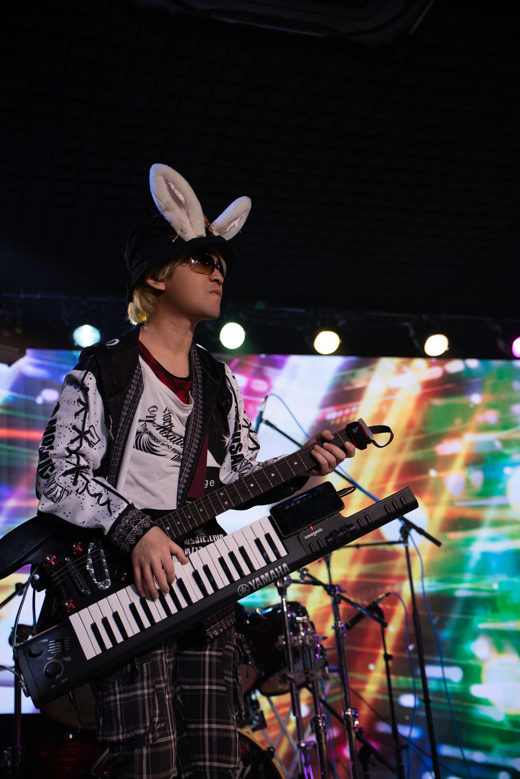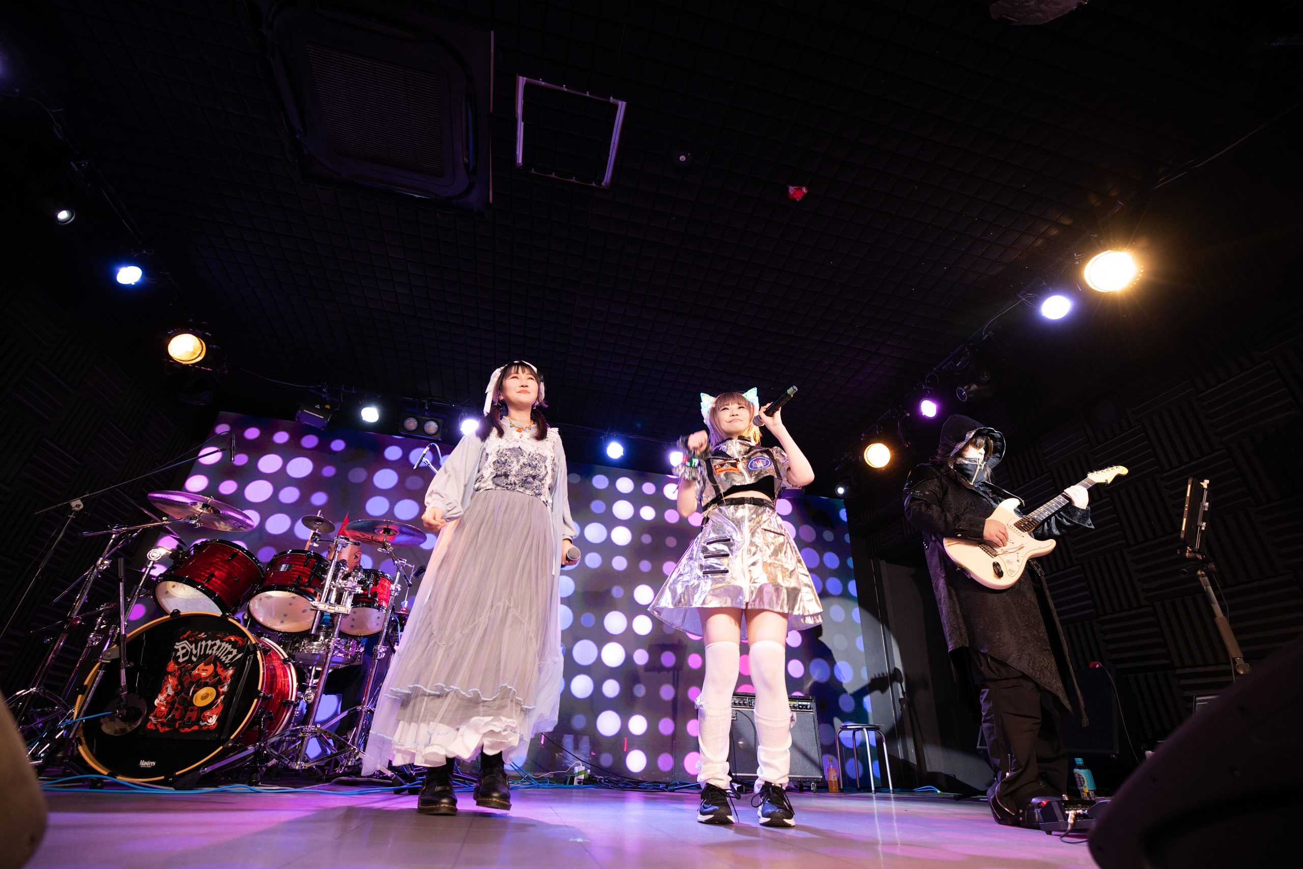 MOSAIC.WAV+ULTRA-PRISMとして最初に届けたのが、アニキが初めてMOSAIC.WAVと一緒に作った『君は何テラバイト?』。どこか懐かしさを覚えるレトロポップ/テクノチューンだ。理系電波ソングともいえる歌詞は2000年代から未来へのメッセージのようで、アニキの伸びやかなギターの音色も心地好い。月宮うさぎとみ〜こがマイクをリレーしながら歌う姿にも、キュンとしたときめきを感じ続けていた。サウンドはピコピコ弾けながらも、メロウで歌謡チックな歌に、ちょっとノスタルジーな気分も覚える。間奏では、アニキがフロントに立ってギターソロを披露。その横へ、さりげなくかやぴーが寄り添えば、フロア中から熱情した声が上がっていたのも印象深い景色だった。この曲で自由奔放にギターの音を響かせていたアニキの姿が、とにかく格好よかった。