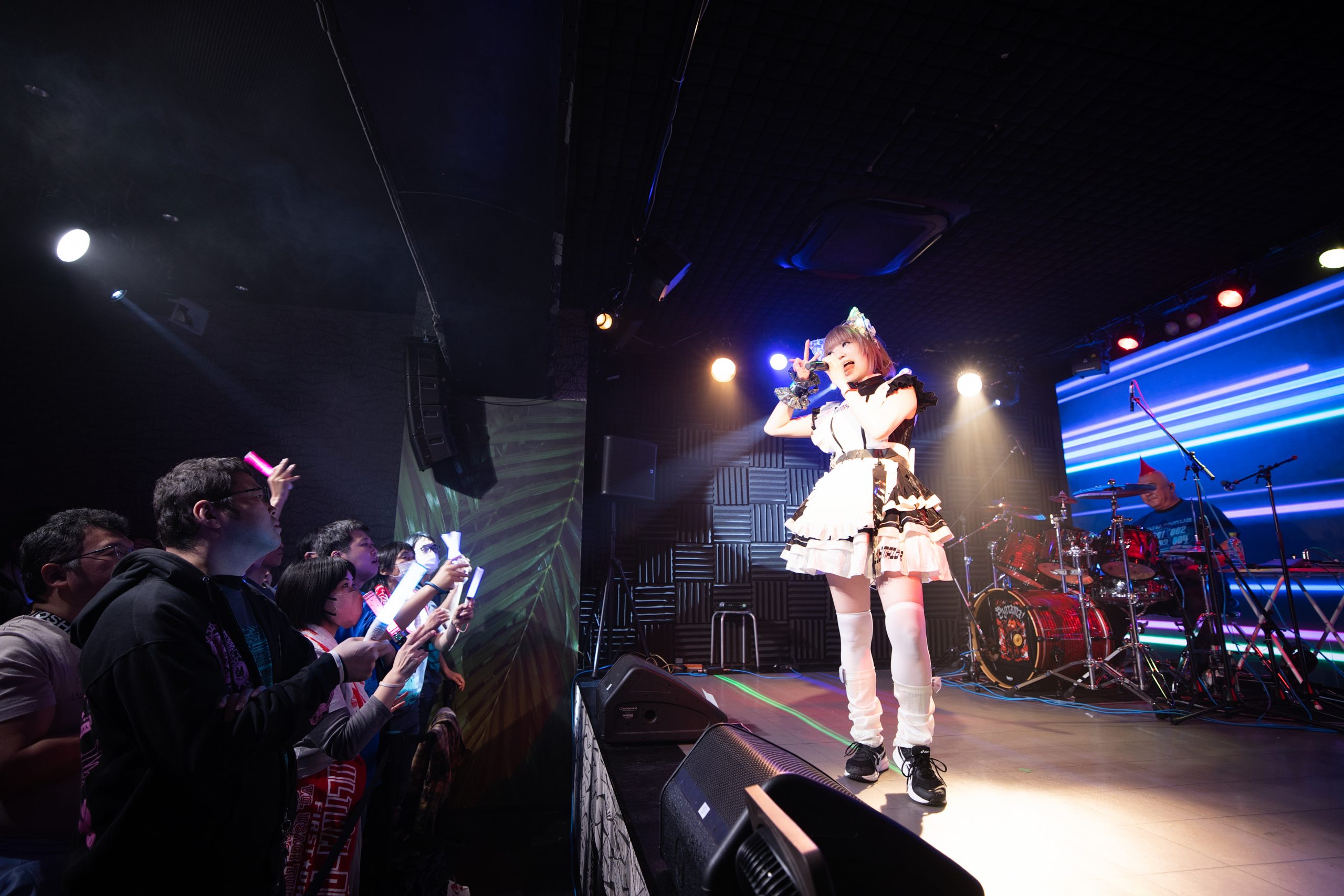 続いて桃井はるこが歌ったのが、この場の空気にめちゃめちゃ合う超萌えポップチューンの『ここだよ。』。秋葉原に2022年まで実店舗を構えていた「とらのあな」のイメージソングだ。曲が流れるたびに、フロア中の人たちが、しっかりと掛け声を上げて、在りし日の熱狂したライブ姿を現在に蘇らせていたこと。ここは、時間の止まった2000年代の世の中??と勘違いしてしまいそうなほど、あの時代の萌えに燃えたライブの空気がここに生まれていた。