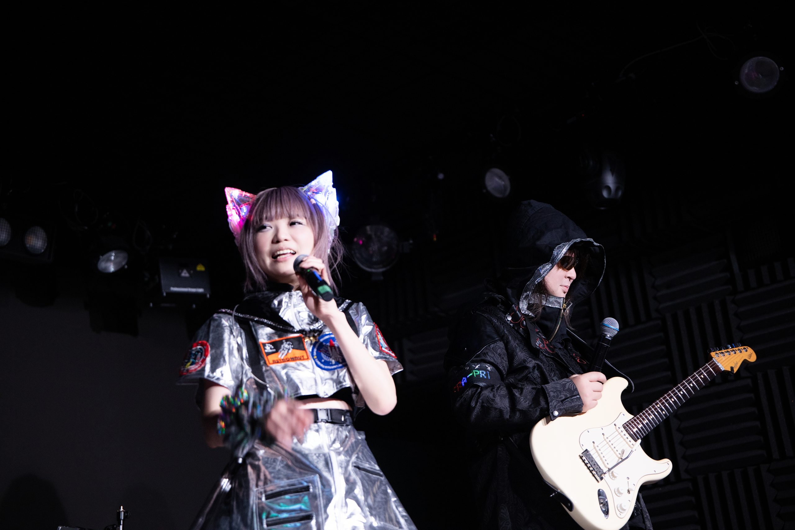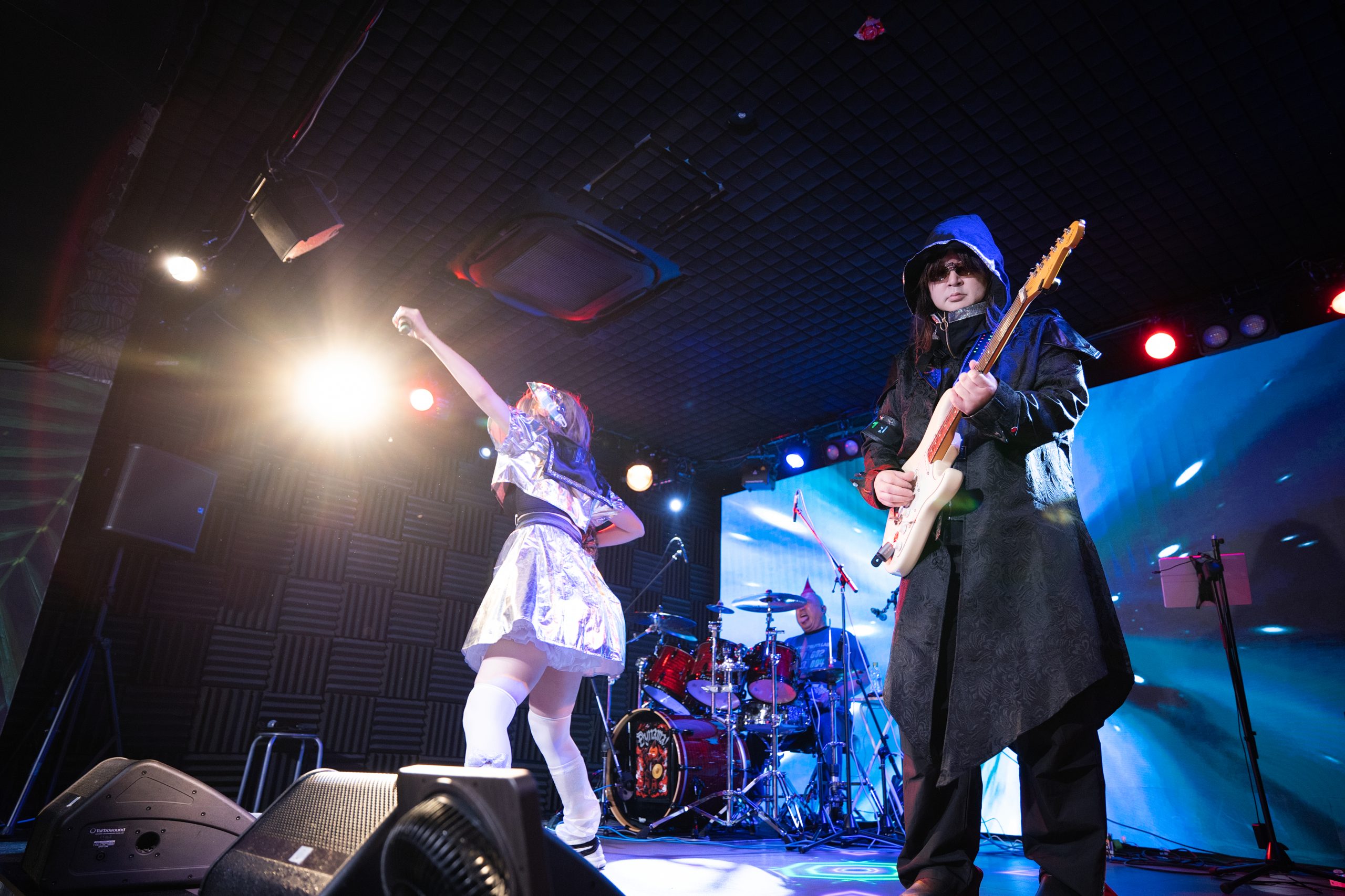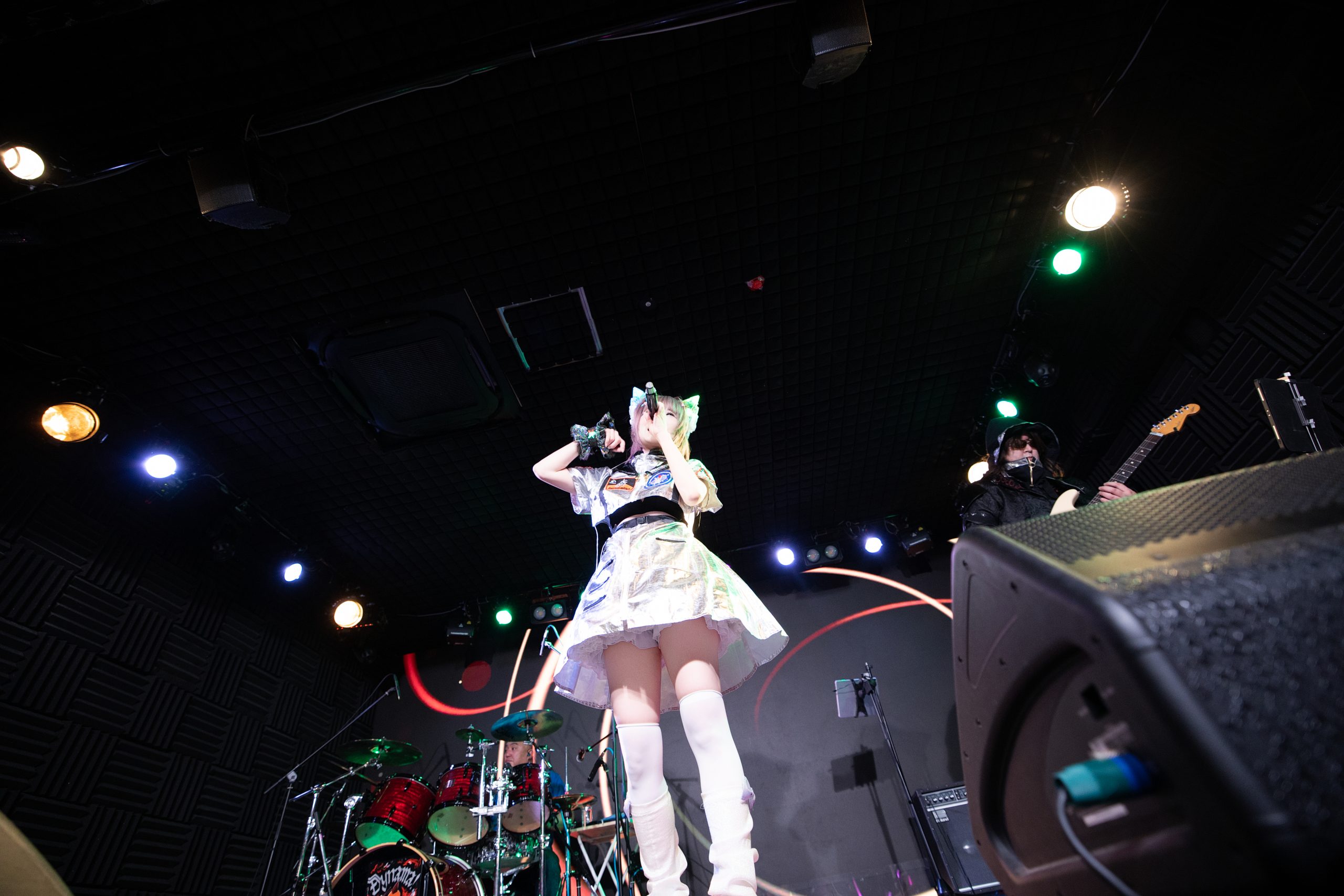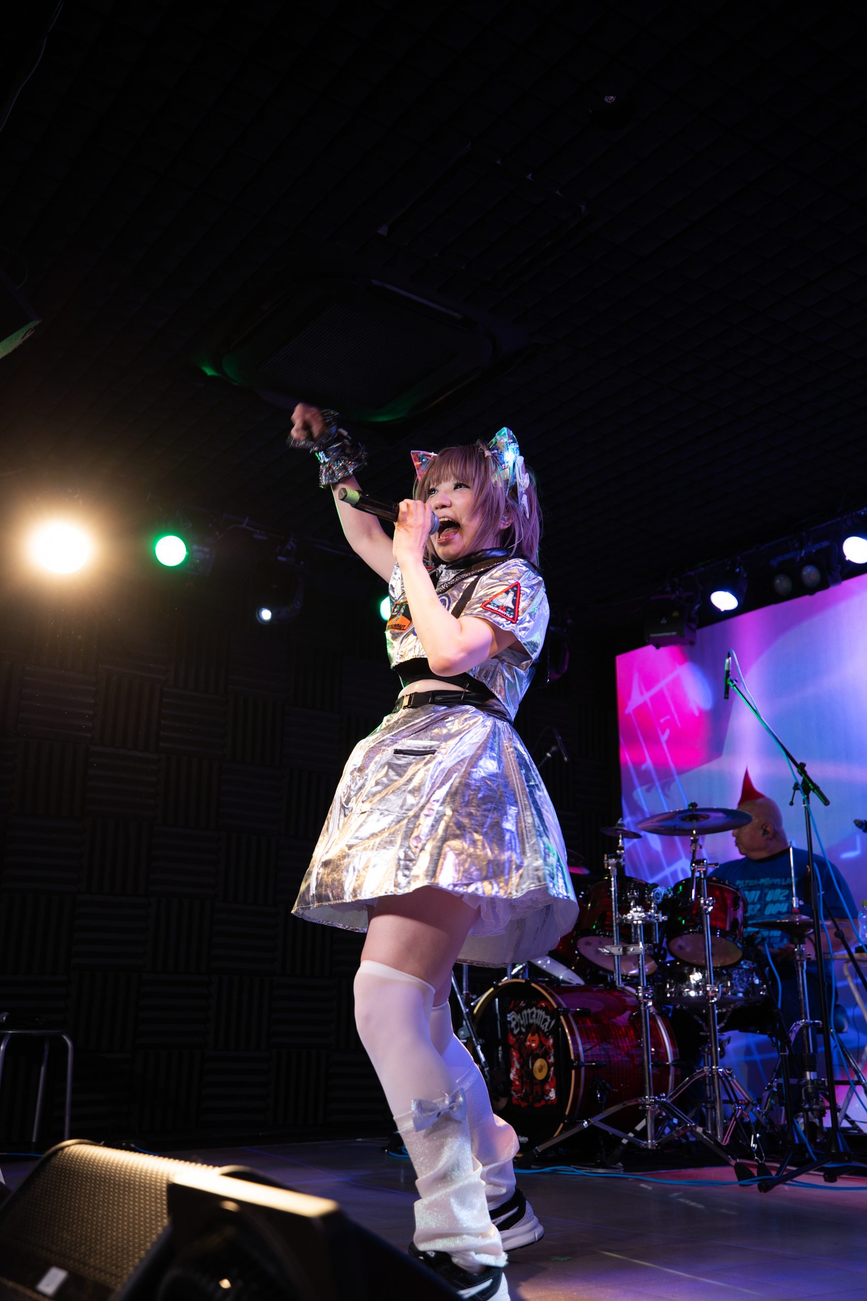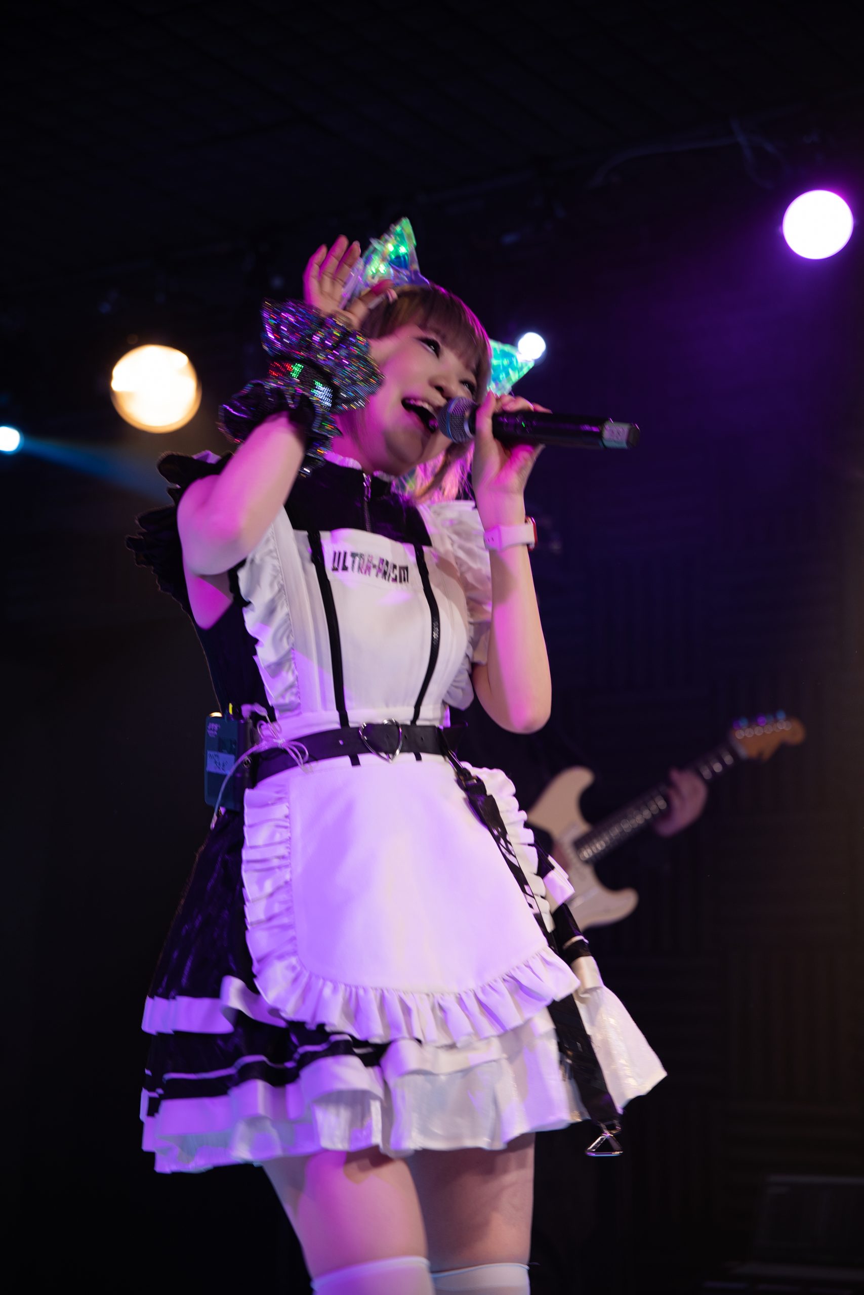 イベントの最後を、ふたたびULTRA-PRISMが担当。アニキのギターが唸りを上げるのを合図に、飛びだしたのが『ULTRA-DATE!』。熱を抱いて駆けだした楽曲に乗せ、フロア中の人たちが野太い声を上げて騒ぎだす。その様を見ながら、月宮うさぎが腕をくるくる回しながら、さらに胸をキュンキュン騒がせる電波を発信していた。ここでは、アニキも定位置を離れ、月宮うさぎの側で寄り添い演奏をすれば、間奏ではしっかりフロントに立ってアピール。小池アニキのロックンロールなギタープレイに胸が熱く騒ぐ。月宮うさぎが飛び跳ね歌うたび、高ぶる気持ちがさらにグングンとアガっていった。