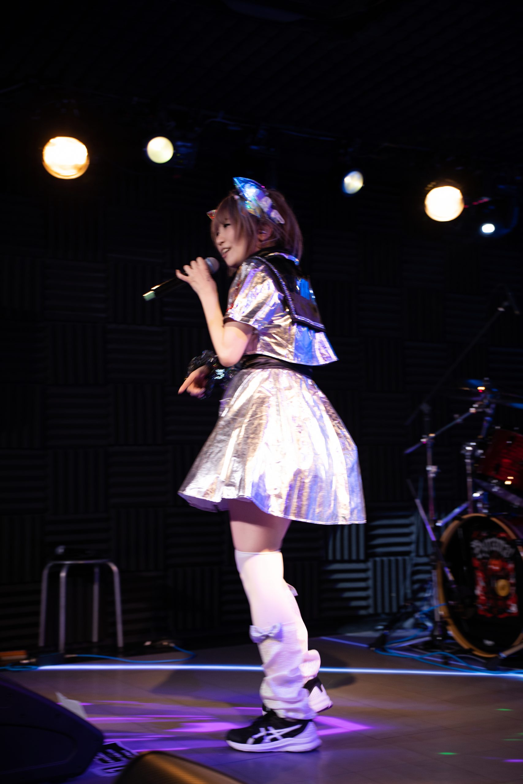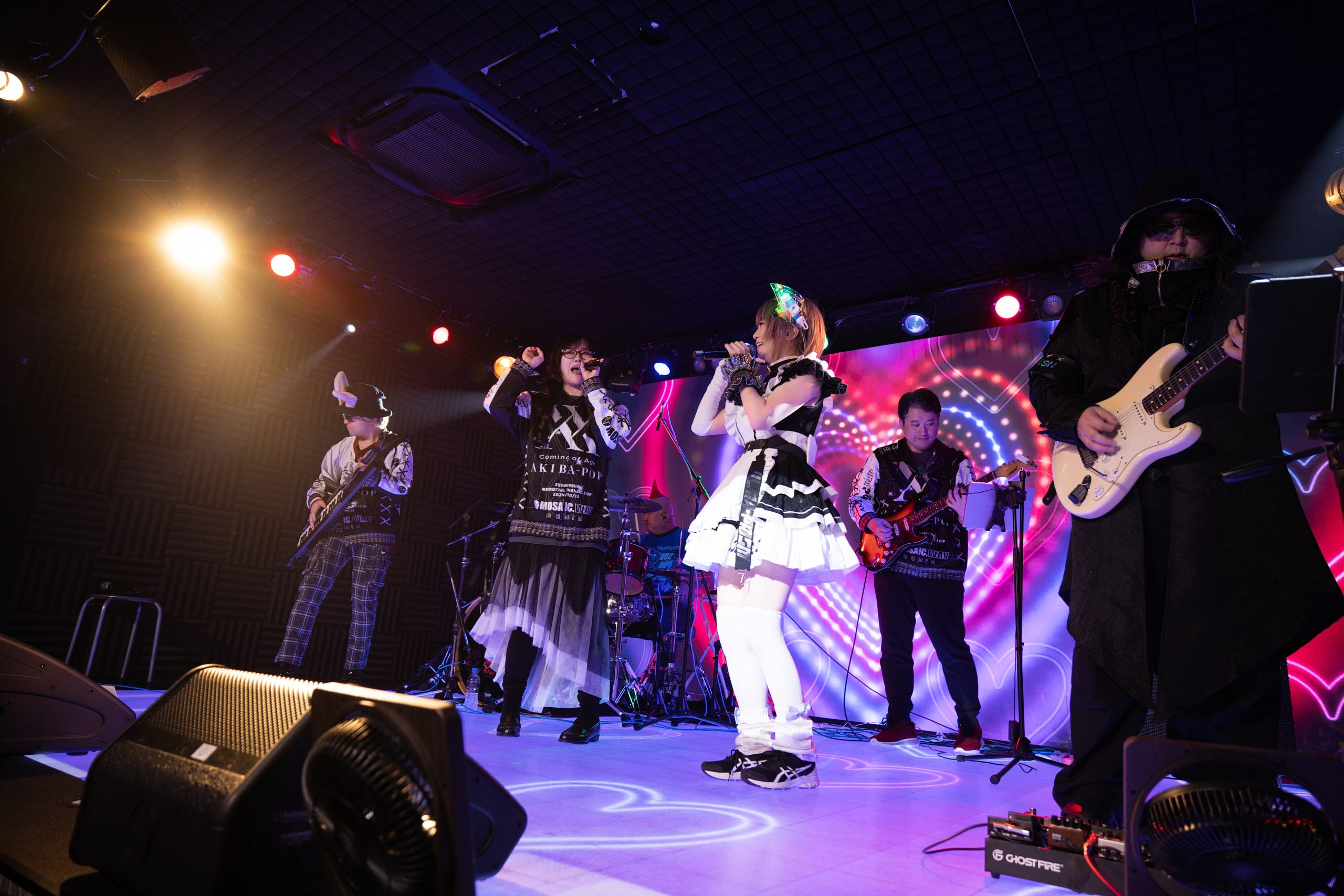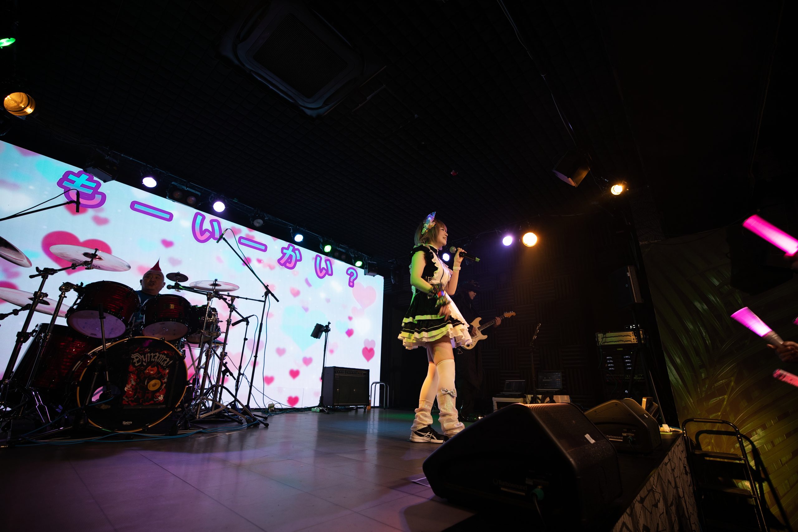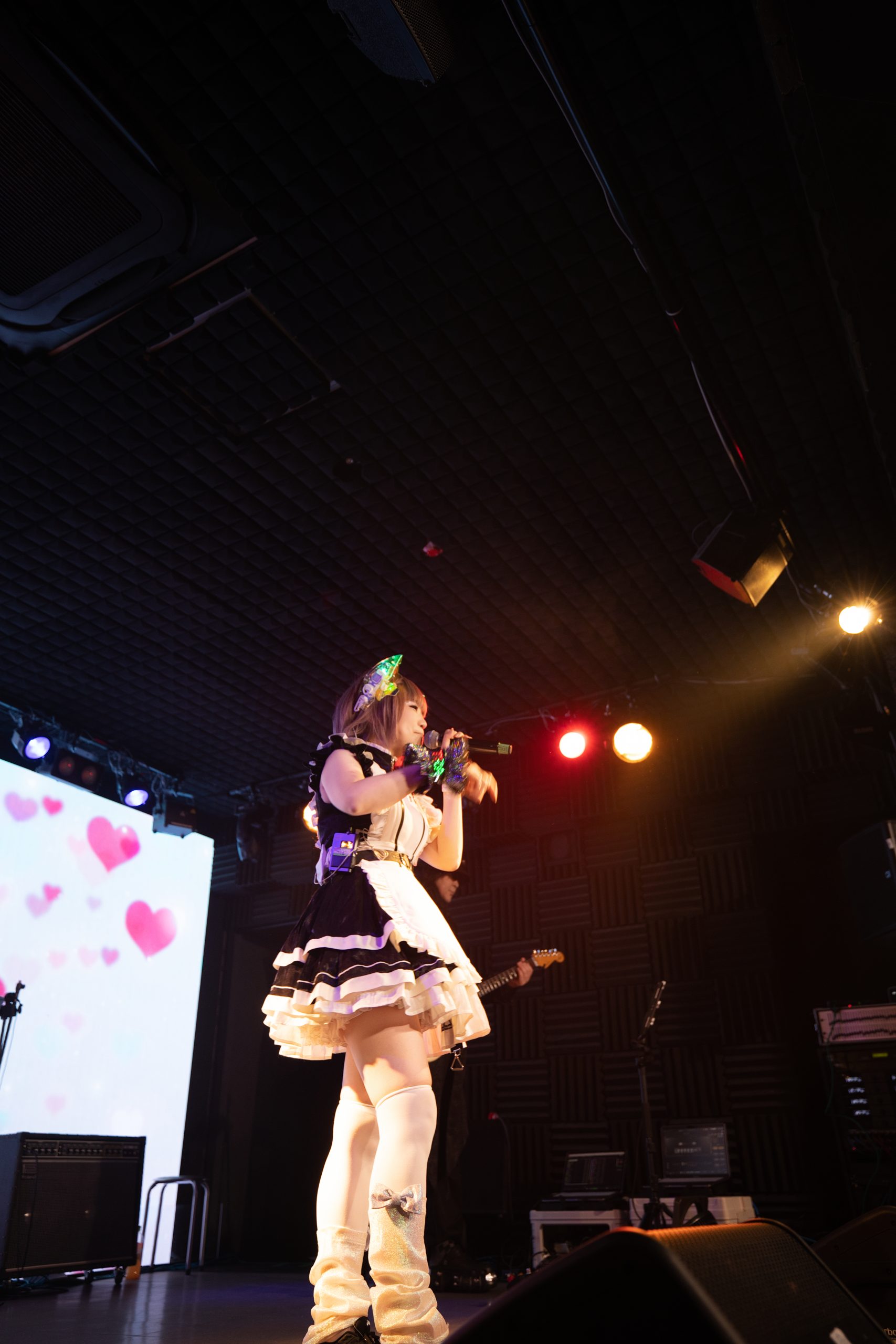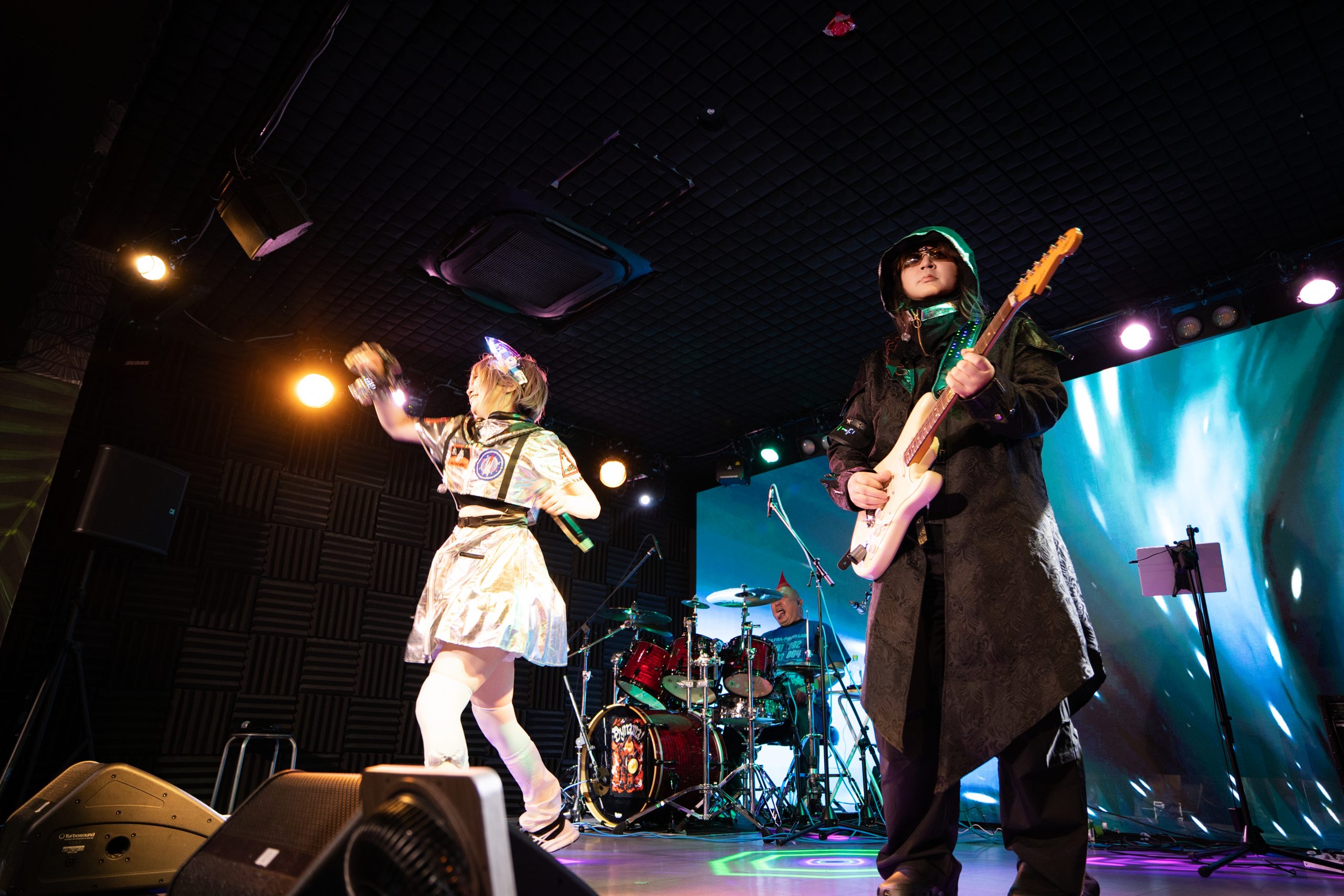 イベントの最後を、ふたたびULTRA-PRISMが担当。アニキのギターが唸りを上げるのを合図に、飛びだしたのが『ULTRA-DATE!』。熱を抱いて駆けだした楽曲に乗せ、フロア中の人たちが野太い声を上げて騒ぎだす。その様を見ながら、月宮うさぎが腕をくるくる回しながら、さらに胸をキュンキュン騒がせる電波を発信していた。ここでは、アニキも定位置を離れ、月宮うさぎの側で寄り添い演奏をすれば、間奏ではしっかりフロントに立ってアピール。小池アニキのロックンロールなギタープレイに胸が熱く騒ぐ。月宮うさぎが飛び跳ね歌うたび、高ぶる気持ちがさらにグングンとアガっていった。