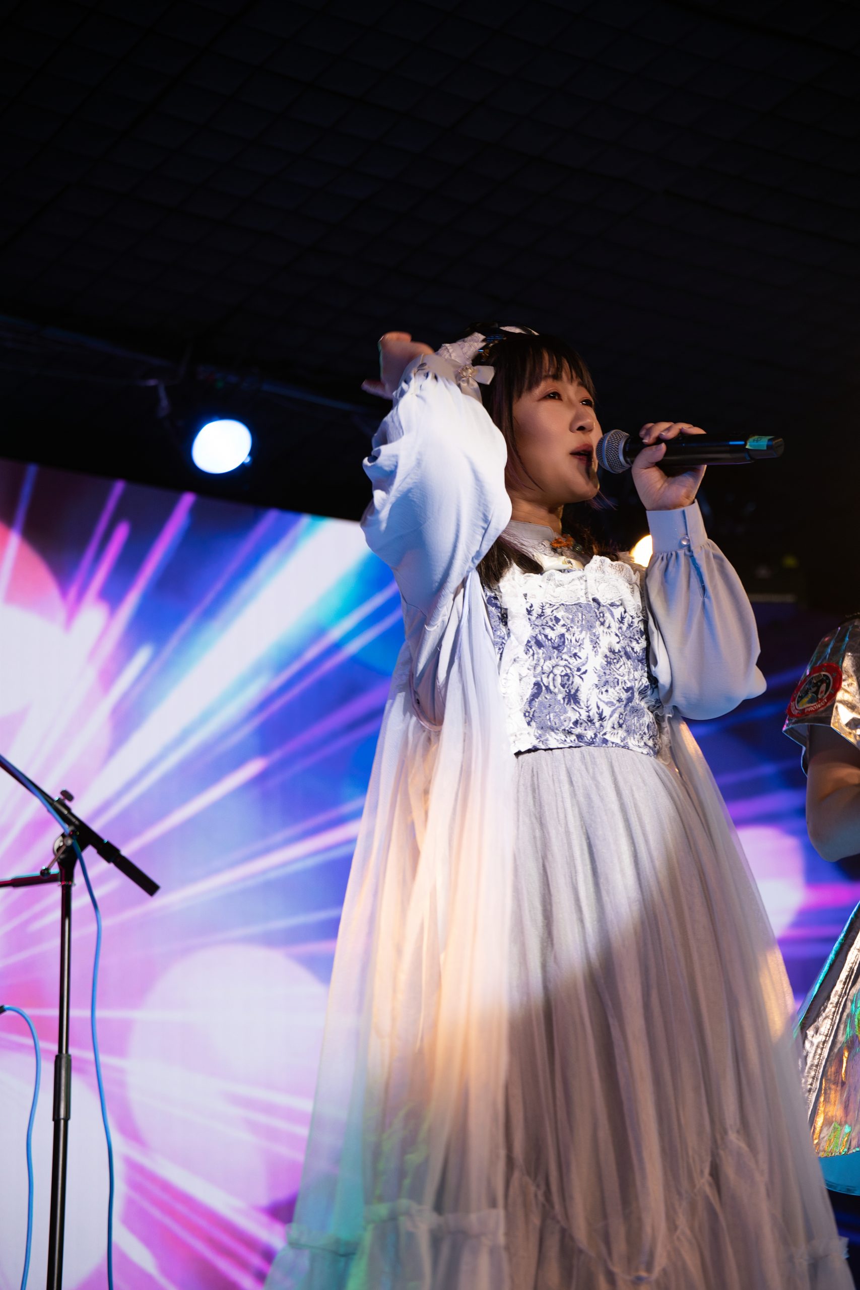 続いては、桃井はるこ+ULTRA-PRISMのコラボステージへ。本人らも語っていたが、すでに場内はコミケ雲ならぬコイケ雲が発生するほどのサウナ状態だ。最初に披露したのが、すでに音源が残っていなかったことから、主催の月宮うさぎの依頼でアニキが新たに音源を作りあげた、ものすごく懐かしい、アニキと桃井はるこの出会いの曲『GURA GURA』。桃井はるこも、アニキも、あの頃の空気を懐かしむように当時へ気持ちを戻しながらキラキラした思いで、そこへ月宮うさぎも加える形で歌い奏でれば、フロアからも熱い声やクラップが鳴り響く。歌謡チックでポップなノリも、あの頃の空気が甦ってくる嬉しい要素。1997年当時のゲームタイトルの要素をたっぷりと詰め込んだ、青春の香りも滲ませたこの雰囲気が最高に胸キュンだ。