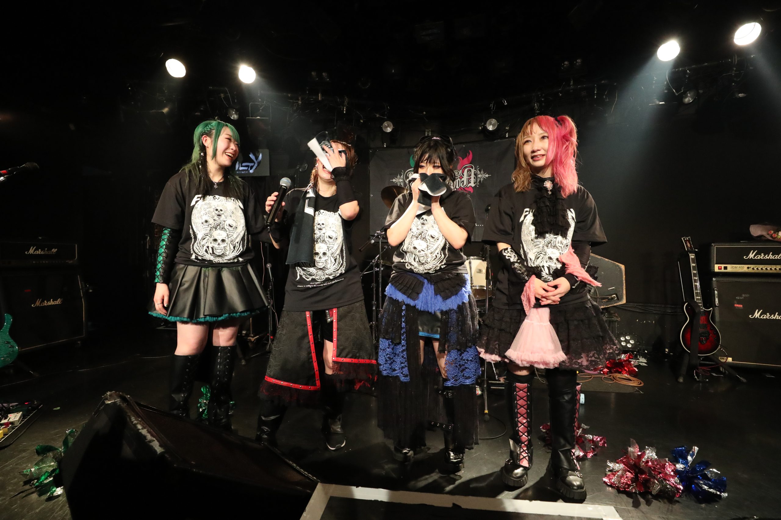 3日目に、すべての曲を歌い終わったときに、ヴォーカルのねねが号泣。じつは、2日間の公演を終えた時点で喉が限界を覚え、3日目の公演の直前まで声がかすれた状態だった。でも、3日目の公演は、最初から、そんな境地に追い込まれていたことなど感じさせない、いつも通りの姿で歌っていた。だからこそ、不安を乗り越え、3日間全70曲を歌い終えたときに、気丈な心を緩め、涙ぐむどころかボロボロに泣いてしまったのもわかる気がする。