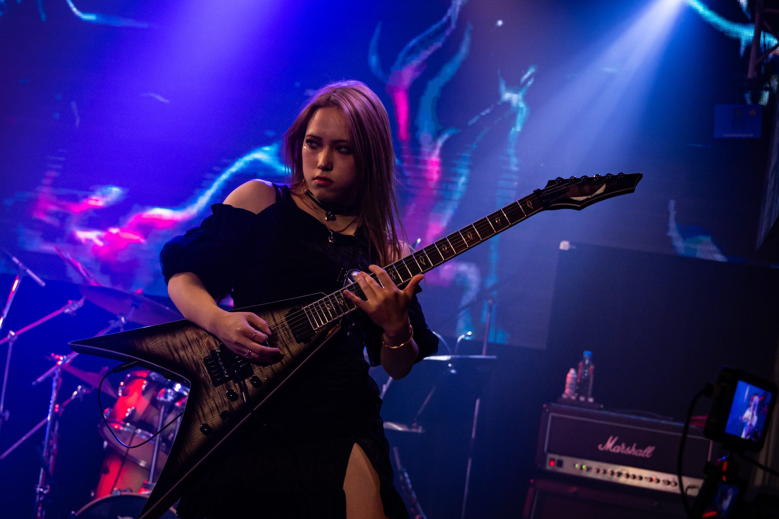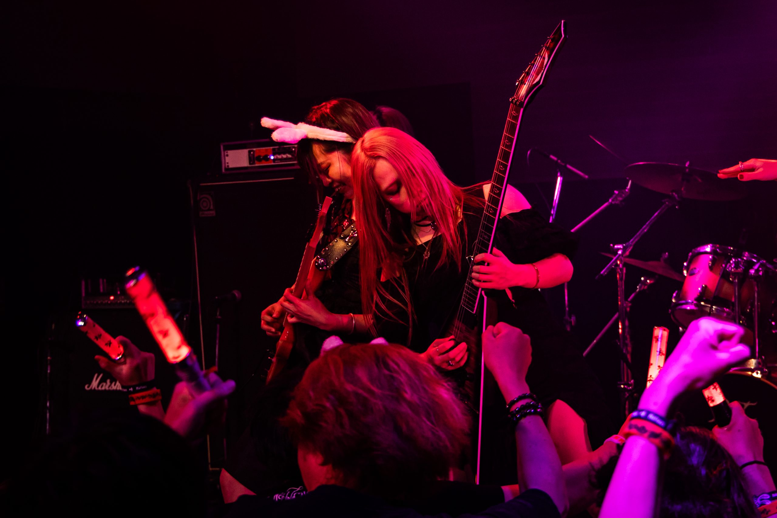 GINA 活動を始めたばかりの頃は、各々が自分好みの音を出し、それをMellowsの掲げるCUTE METALというコンセプトに当てはめていく形を取っていたわけですけど。そこからCUTE METALを追求していくうえで、いろんな要素を増やせば、逆に削ったりもしてきました。それを突き詰めていく中、今度はMellowsらしいスタイルの中へ、自分の心地好い音や弾き方が足されてゆく。Mioちゃんの歌声も、2人の音の中でどんどん聴こえやすくなってと、それぞれの音のまとまり方にもいろんな変化が出てきたのが、ここまでの日々。1周年公演の時と比べても、Mellows全体のまとまりというか、バンドの音としての届きやすさはだいぶ進化してきたと思うから、そこを2周年公演では届けたいです。衣装については、Mioちゃんから「Metal Rebellion」というタイトルにちなみ、反乱しやすそうな衣装を考えていると聞いていたから、そこは楽しみにしています。Mellowsって、泥くさいゴリゴリのメタルバンドとやっても、ロック系のアイドルと対バンをしても似合うんだけど。でも、どのシーンでやっても色物でもある。そうやって、いろんなシーンで反抗や反乱を起こしながら進んできたMellowsだからこそ、2周年公演は、内容はもちろん、これから発表する新曲や衣装も含め、Mellowsらしい新しい反抗のスタイルを示せたらなと思っています。