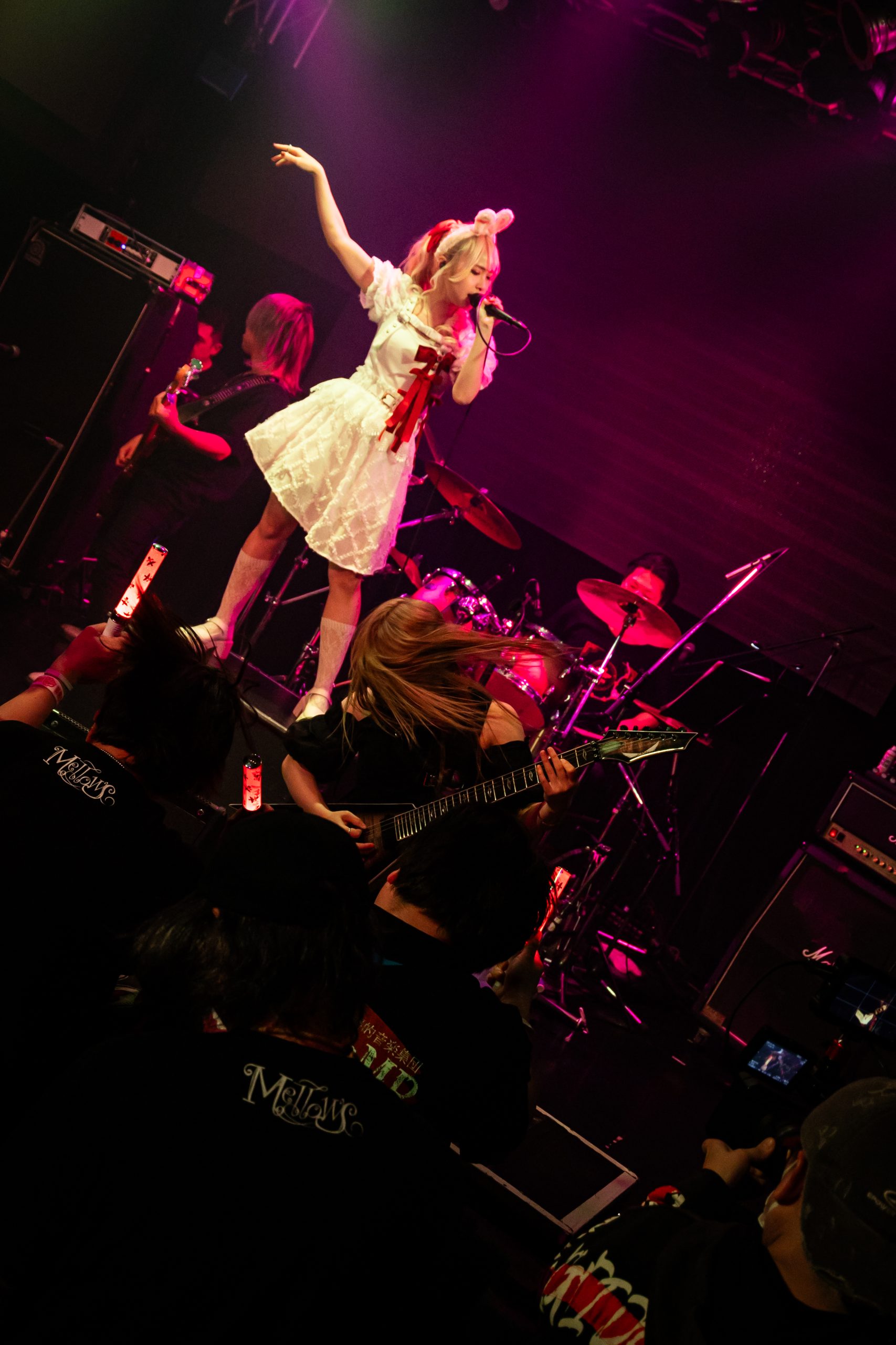 ルバム『alloy』であり、1周年を記念したワンマン公演でした。そこでつかんだ手応えをさらに確立し、より進化してきたのが2年目のMellowsになります。個人的にも、自分の歌い方をより明瞭に打ち出せるようにもなりました。それは、2人のギター陣にも言えること。Mellowsの中での自分の役割をしっかりとつかむのはもちろん、技術面での進化が本当にハンパなく高いからこそ、ここ1年で確実に新たなステップを踏みだしたMellowsの姿を、2周年公演を通してしっかり見せたいなと思っています。しかも、2周年公演では、わたしがデザインした新衣装のお披露目もします。2周年公演へ向けて今、次々と発表し続けている新曲たちも成長させたうえでお届けしようと思っているので、ぜひMellowsが打ち出した「Metal Rebellion」。つまり、”Mellows流のヘヴィメタルシーンへの反乱”となる姿を、みなさんにぜひ見ていただきたいです。