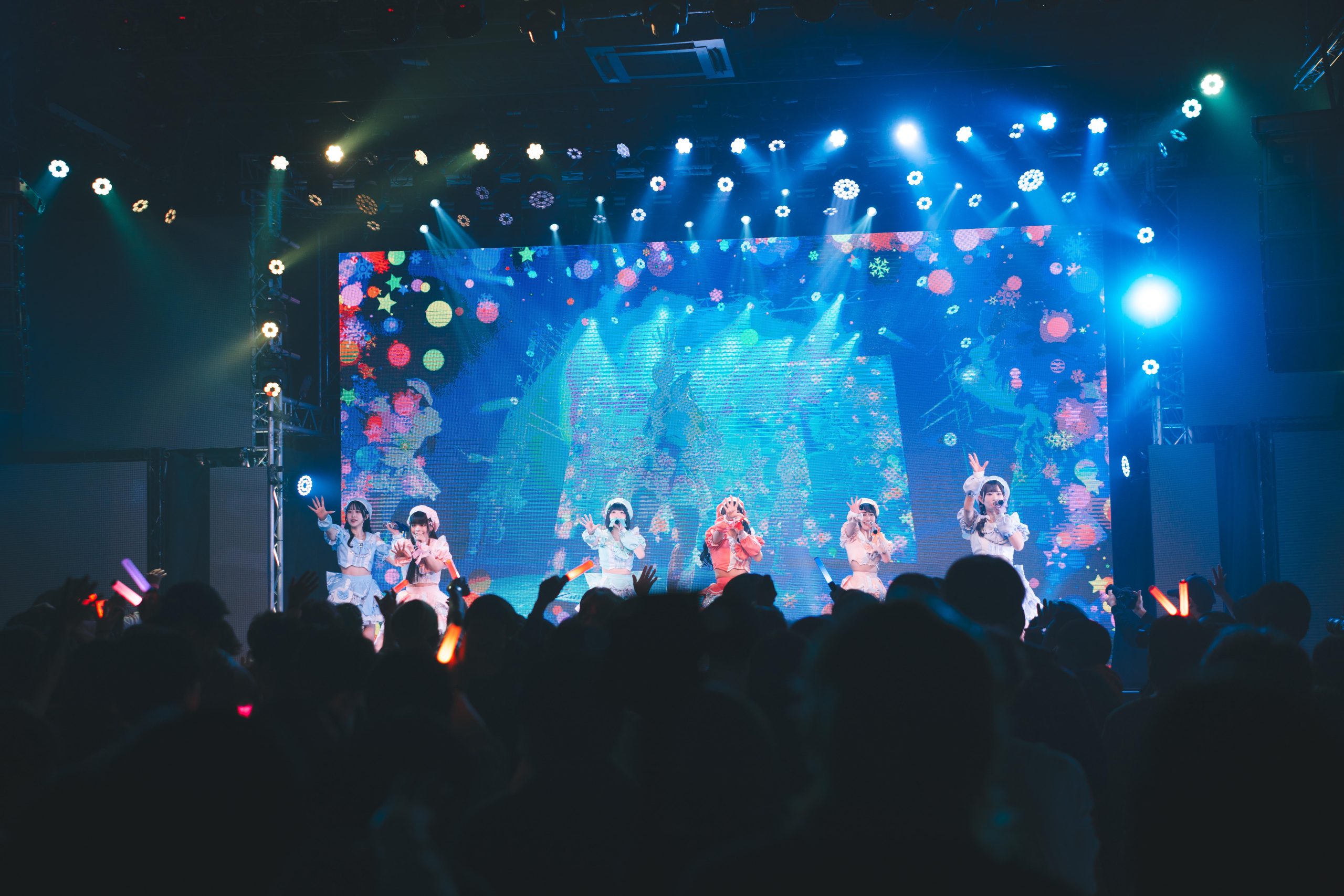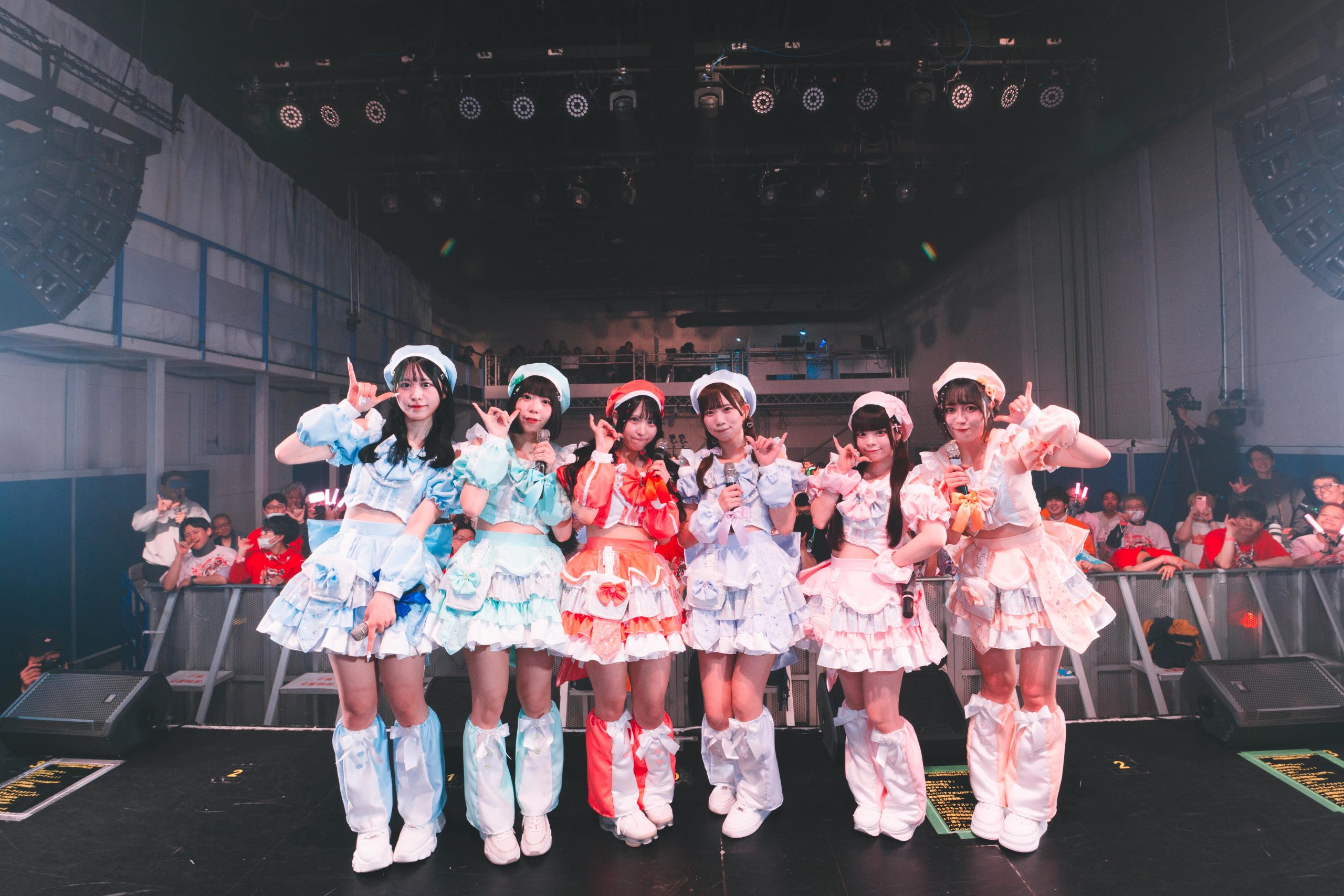 フロアには、大勢の観客たちのざわめく声が広がっていた。突然、暗くなった場内へ、カラフルに煌めく無数の光が瞬きだした。SEに乗せてメンバーらが舞台へ登場。ステージ後方で後ろ姿になった彼女たちが、自己紹介の声に合わせて振り向き、チャーミングな姿をアピール。そのたびに、フロア中からメンバーを呼ぶ声が飛び交う。やがて6人が前を向いてクラップを始めれば、場内中からも手を叩く熱い音が響きだす。