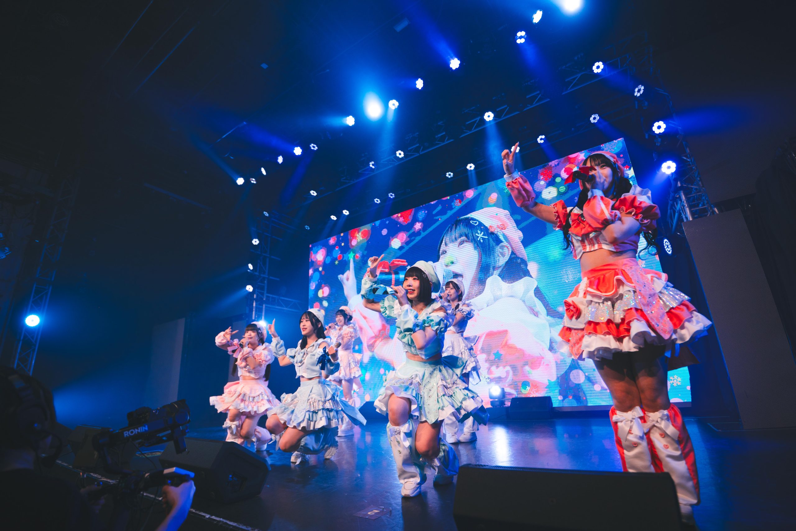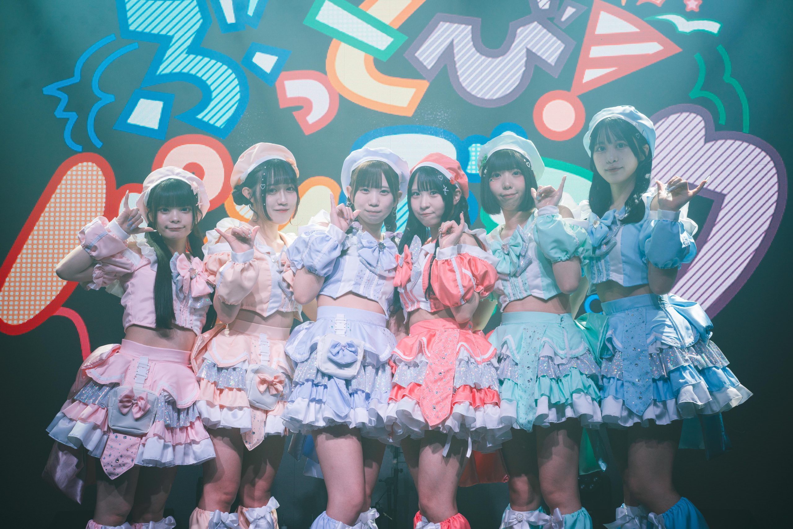 「君を攻略!RPG」の声を合図に、『君を攻略♡RPG』へ。さらにBPMを上げたダンスビートの上で、彼女たちが愛らしさを振りまきながらハイテンションで歌うたびに、フロア中の人たちの感情も大炎上。キュンキュンかわいくお尻を振りながら歌うメンバーらへ向け、フロア中から野太い声がガンガン飛び交っていた。この日のライブ、彼女たちと一緒に熱狂を更新するたびに、6人との心の距離を縮める勇者としてのレベルが上がってゆく。