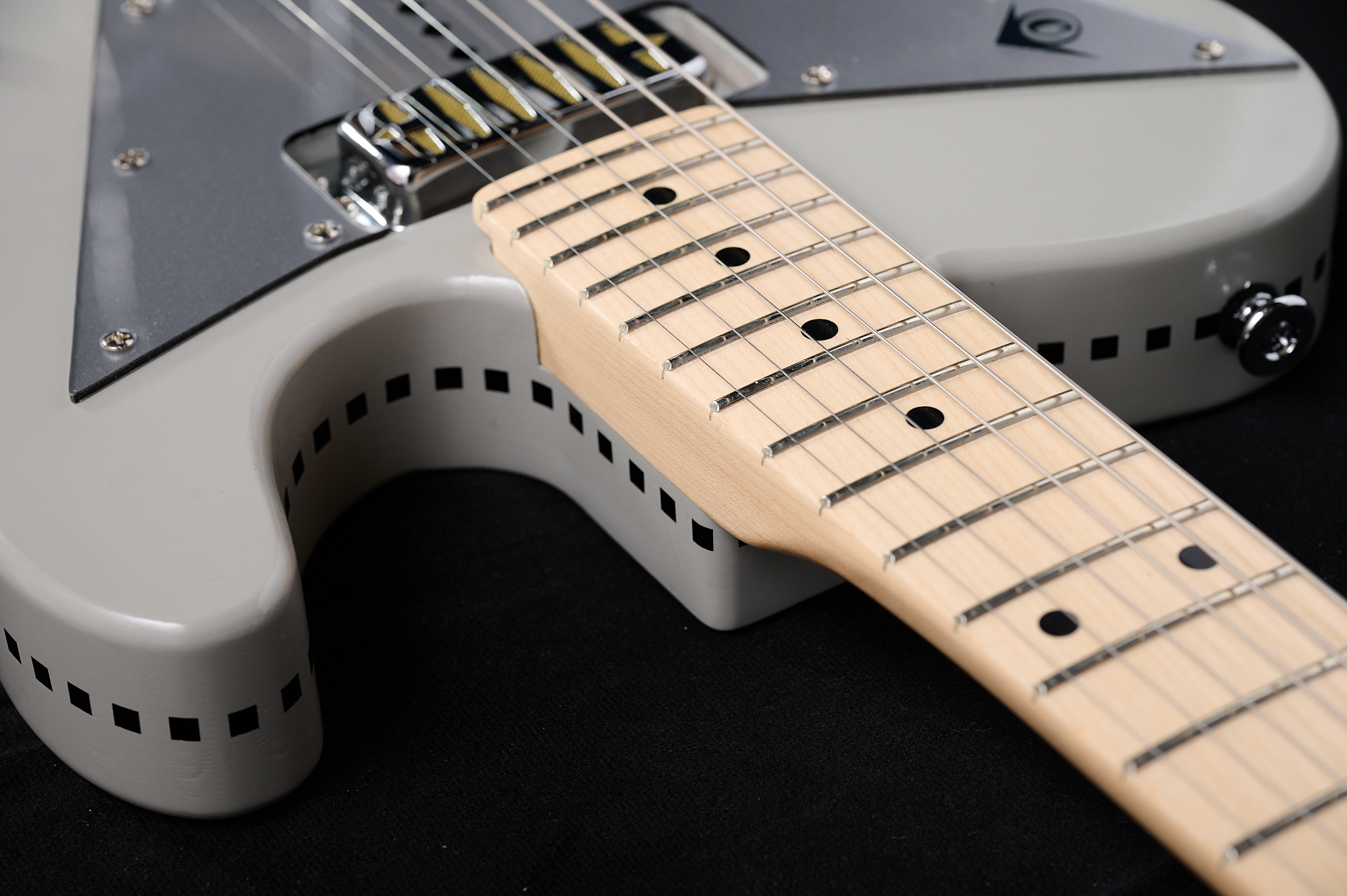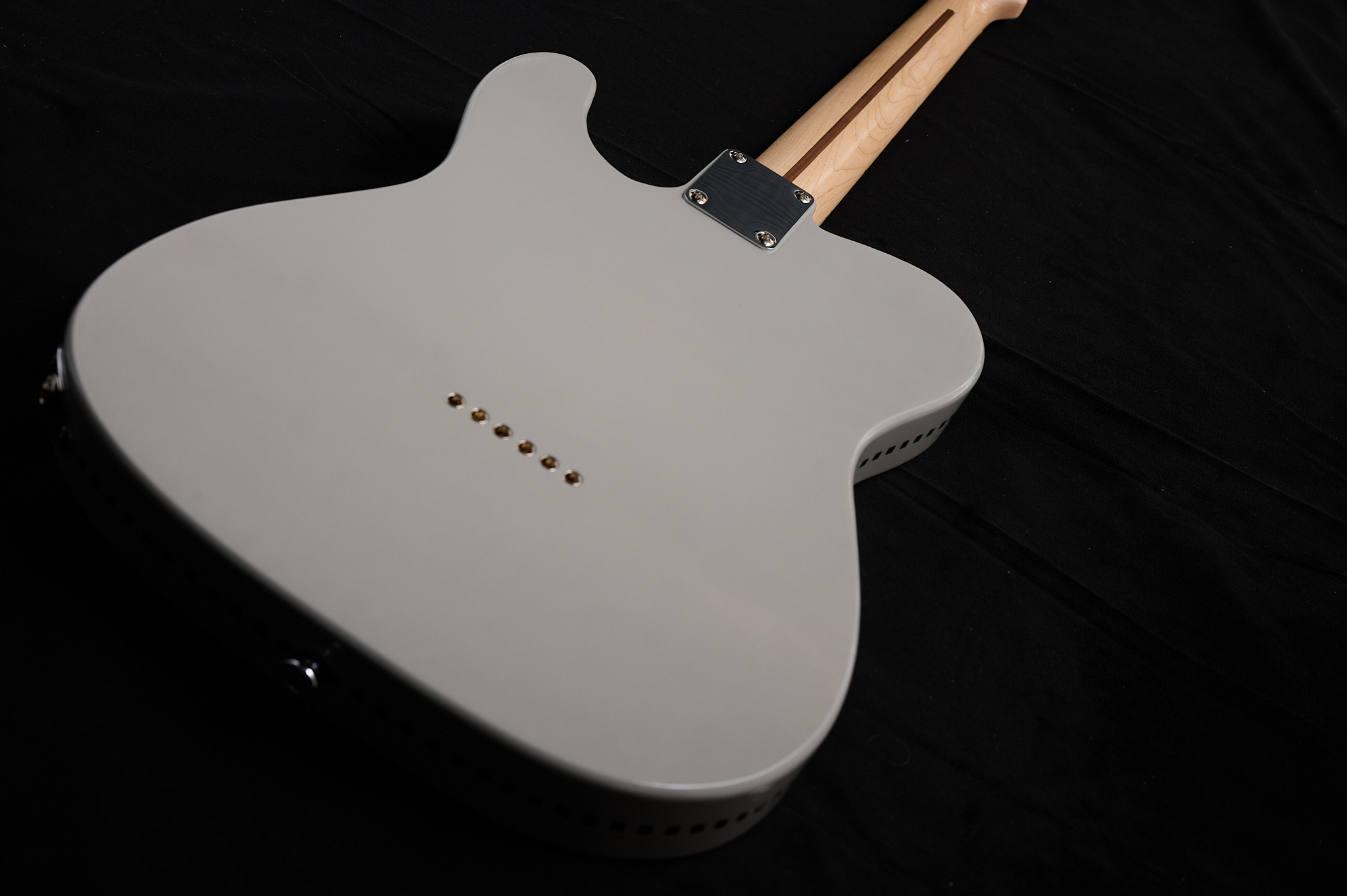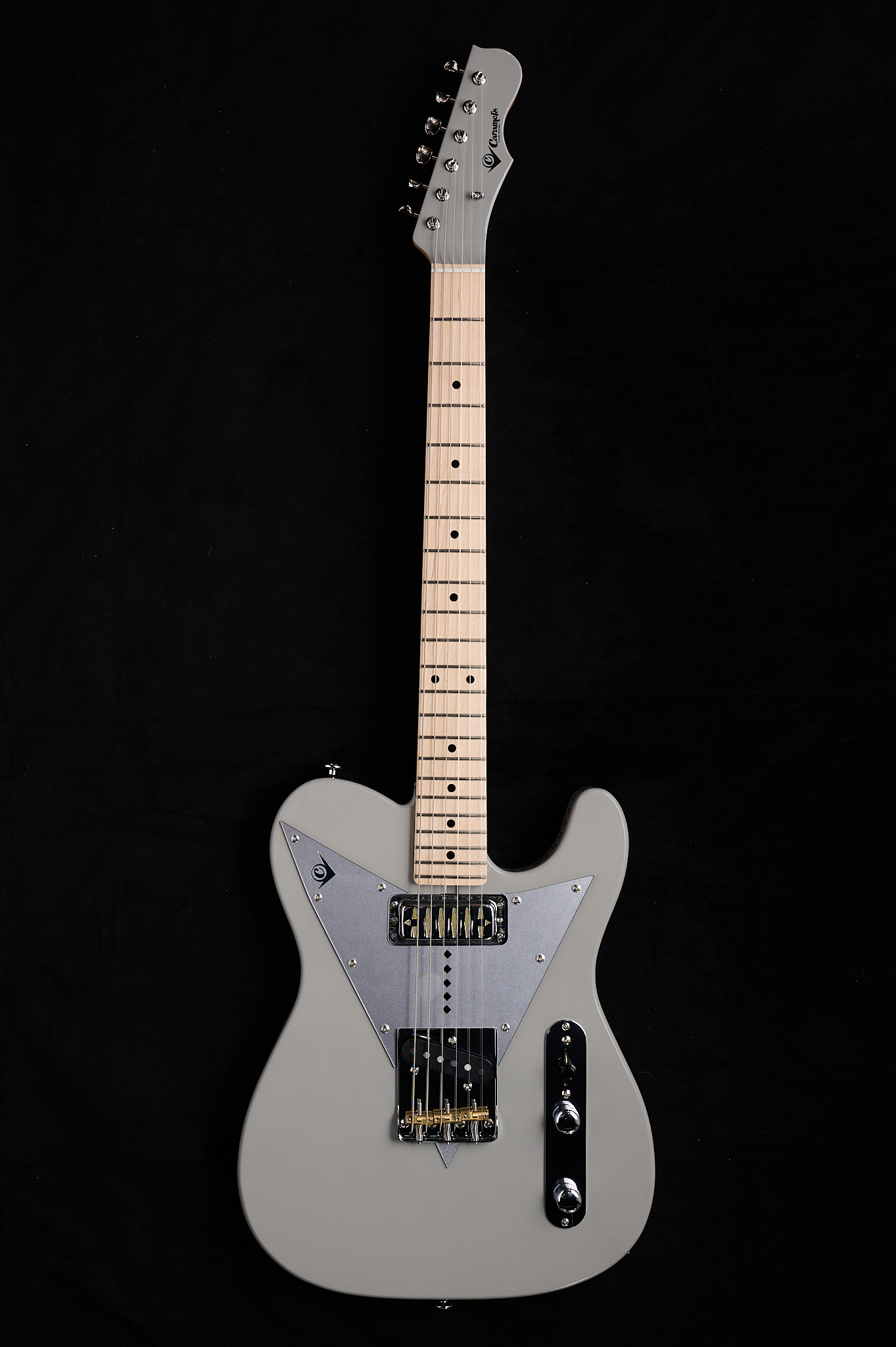 今回のギターは、世の中に意外と少ないグレイカラーのエレキギターを作りたかったという発想のもと制作に取り掛かった。シンプルなテレタイプで、グレイカラーをより目立たせるように、CGKの特徴でもあるチェッカードステッチをボディの側面に施したNEWデザイン。