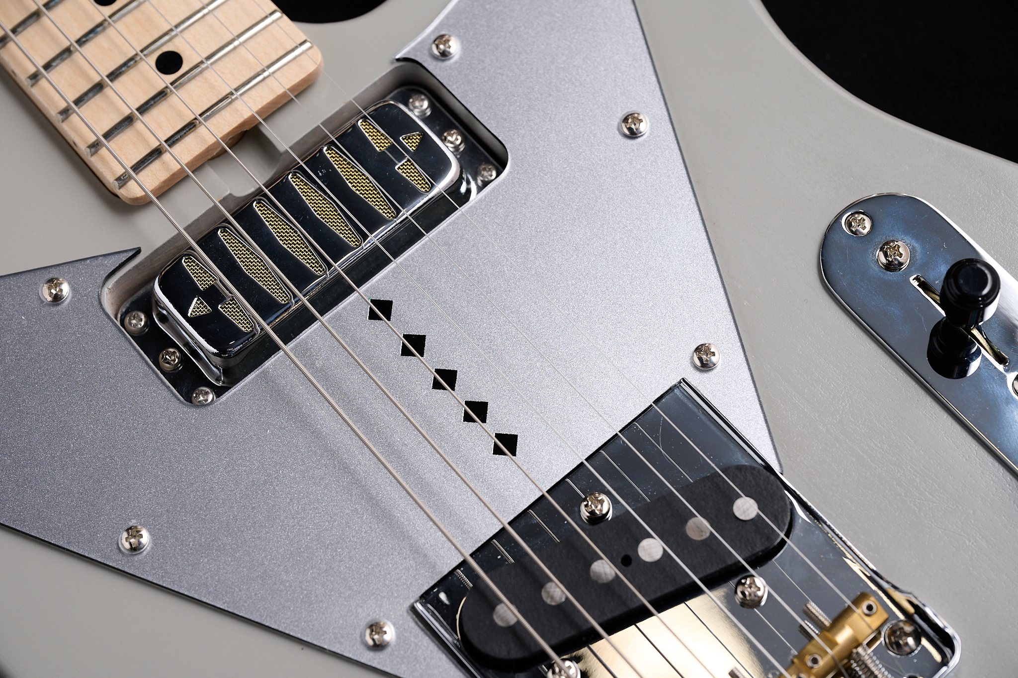 また、シンプルなグレイをより一層引き立たせるためにピックガードはシルバーラメでアクセントを付け、ピックガードのセンターに走るダイヤ柄のステッチもポイント。