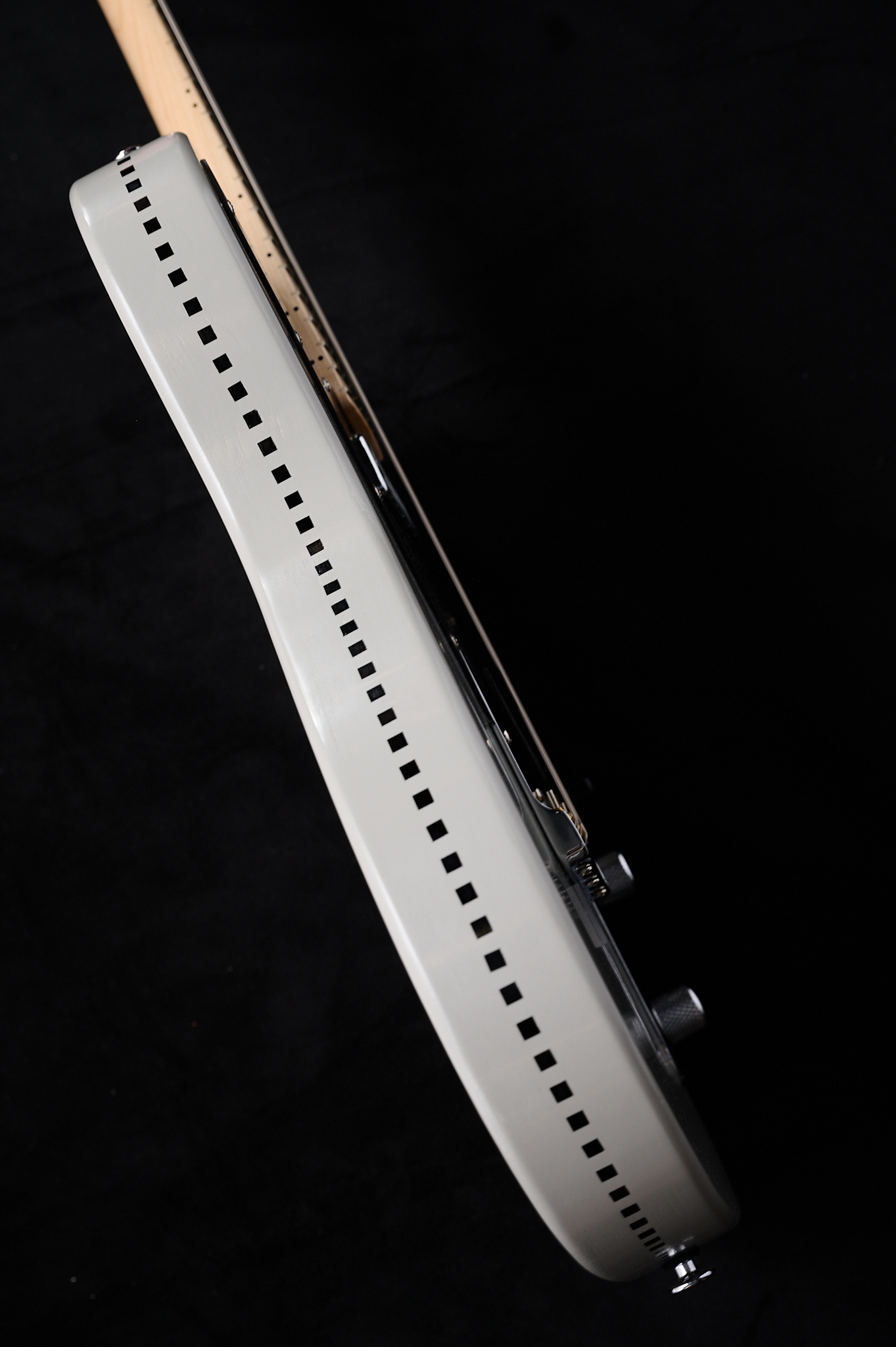 側面の中央にあるラインが魚の「側線」に似ていることから” Lateral Line”と名付けられ、こうした遊び心もCGKならではだ。この点線(チェッカードステッチ)はバインディングではなく、片田が独自で編み出した塗装法によるもの。1枚ずつマスキングテープを貼り付け、塗装し、1枚ずつ剥がしてゆくというとても手間暇のかかった作業。よく見ると四角が少しずれている所もあって、そこもハンドメイド感があって良い。全てニトロセルロースラッカー塗装というのもCGKのこだわりだ。