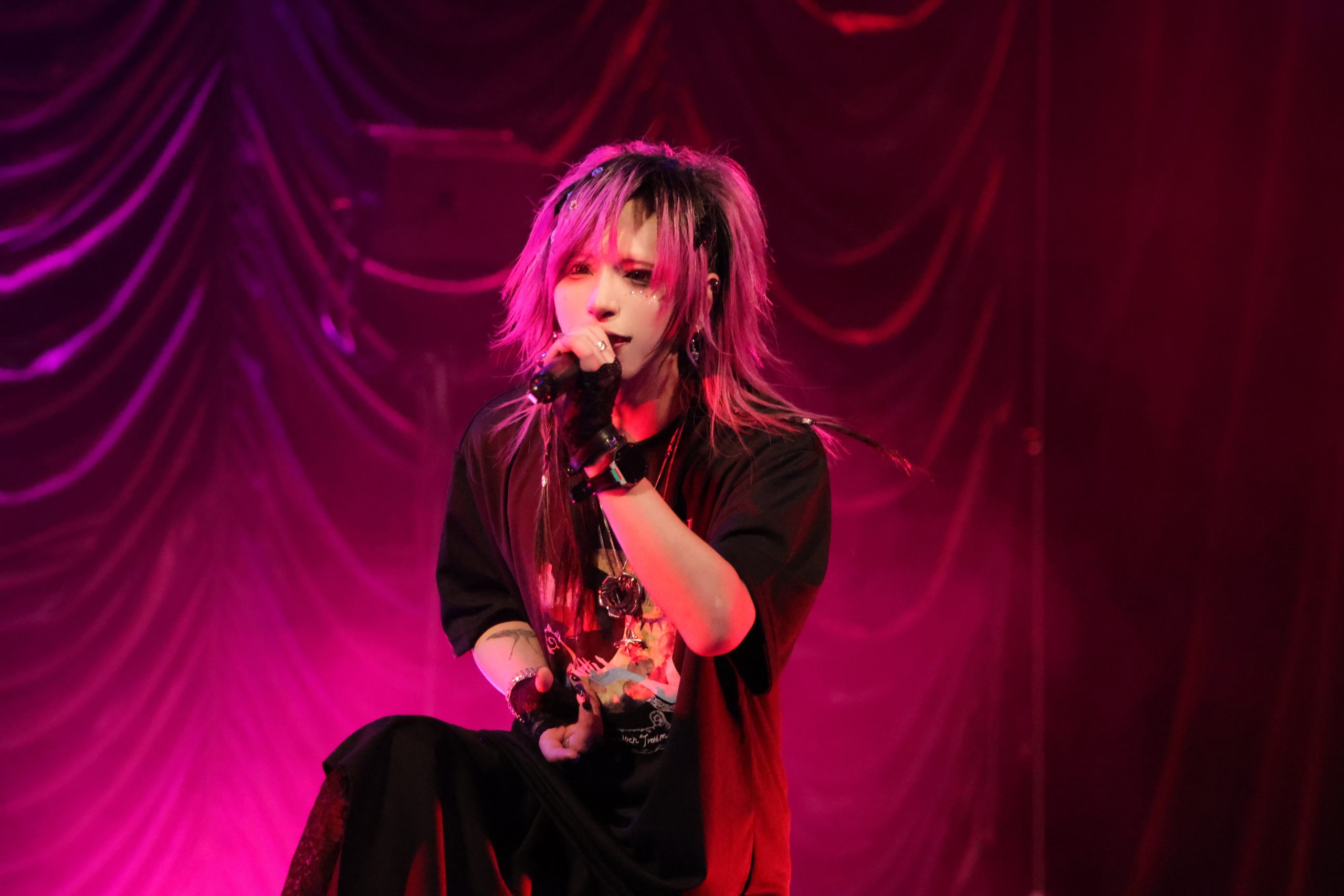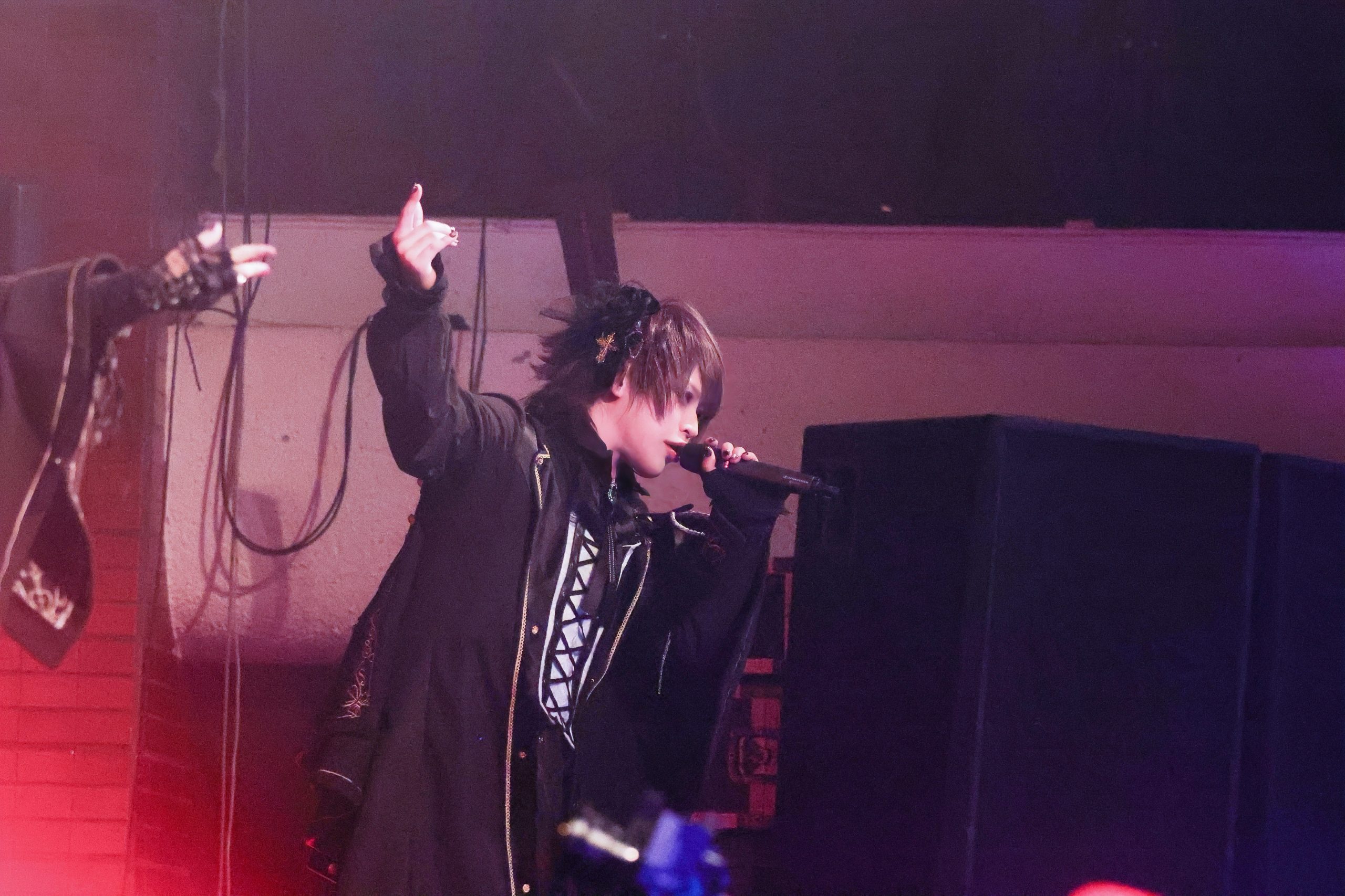 そしてりおんのアカペラからスタート。白い光に包まれながら、「こんな私辛いだけでしょう」と胸の内を零すように。でも、「壊したい こんな世界は」とも声だかに歌っていた。次第に感情が高ぶり、熱を抱く歌声。そこへ、破壊的な音を響かせるダークでマジカルな楽曲が流れだす、切なさに身悶える思いを歌った『欠陥少女メルル』だ。メンバーたちは曲に刻んだ痛い感情をみずからの心とシンクロしながら、胸の内をさらけ出すように歌っていた。この場へ悲しみを吐き出すように歌い、踊り狂う姿が印象的だ。煌めくレーザーの輝きも背に、ときにメンバーどうしで身を触れ合いながら、彼らは、胸の内に渦巻く痛みや悲しみを吹き飛ばし、光を求めるように張り上げた声で歌っていた。
