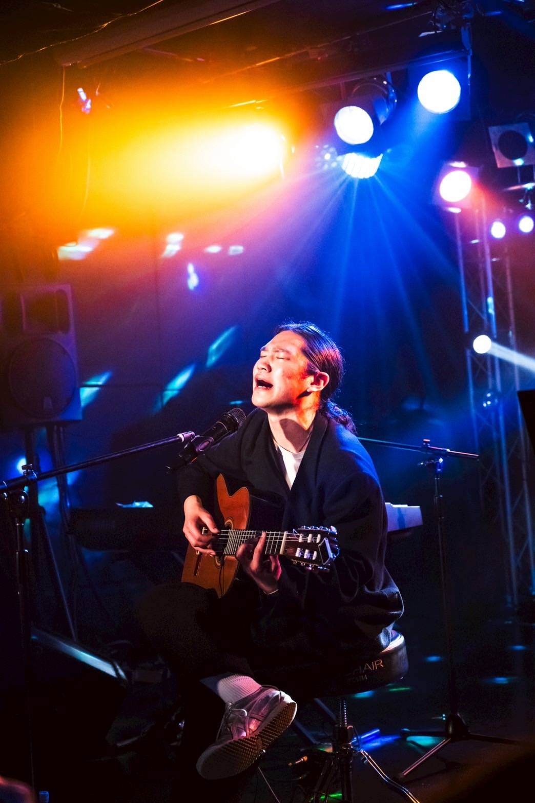 Okubo Mitsukiのライブは、椅子に座った弾き語りのスタイルで始まった。歌うのみならず、ギターの演奏でも心を揺さぶる表現者らしく、ブルーズな音色を刻んで始まった『あいわず』でもいなせな、でも、感情の揺れを大きく描きだす歌声を表情豊かに響かせ、この場に歌声でドラマを描き出してゆく。歌声とギターが感情豊かにシンクロし、目の前にいろんな表情豊かな色や物語を映し出す。なんて優しくて、秘めた情熱を抱いた歌い手だろう。温かい人肌の温もりを持った歌声と無骨でブルーズした演奏が重なりあうたびに、気持ちが揺さぶられる。何といっても彼の特徴はガットギターの音色。その音色と特徴あるハスキーな歌声が絡み合うパフォーマンスは唯一無二の絶妙さ。