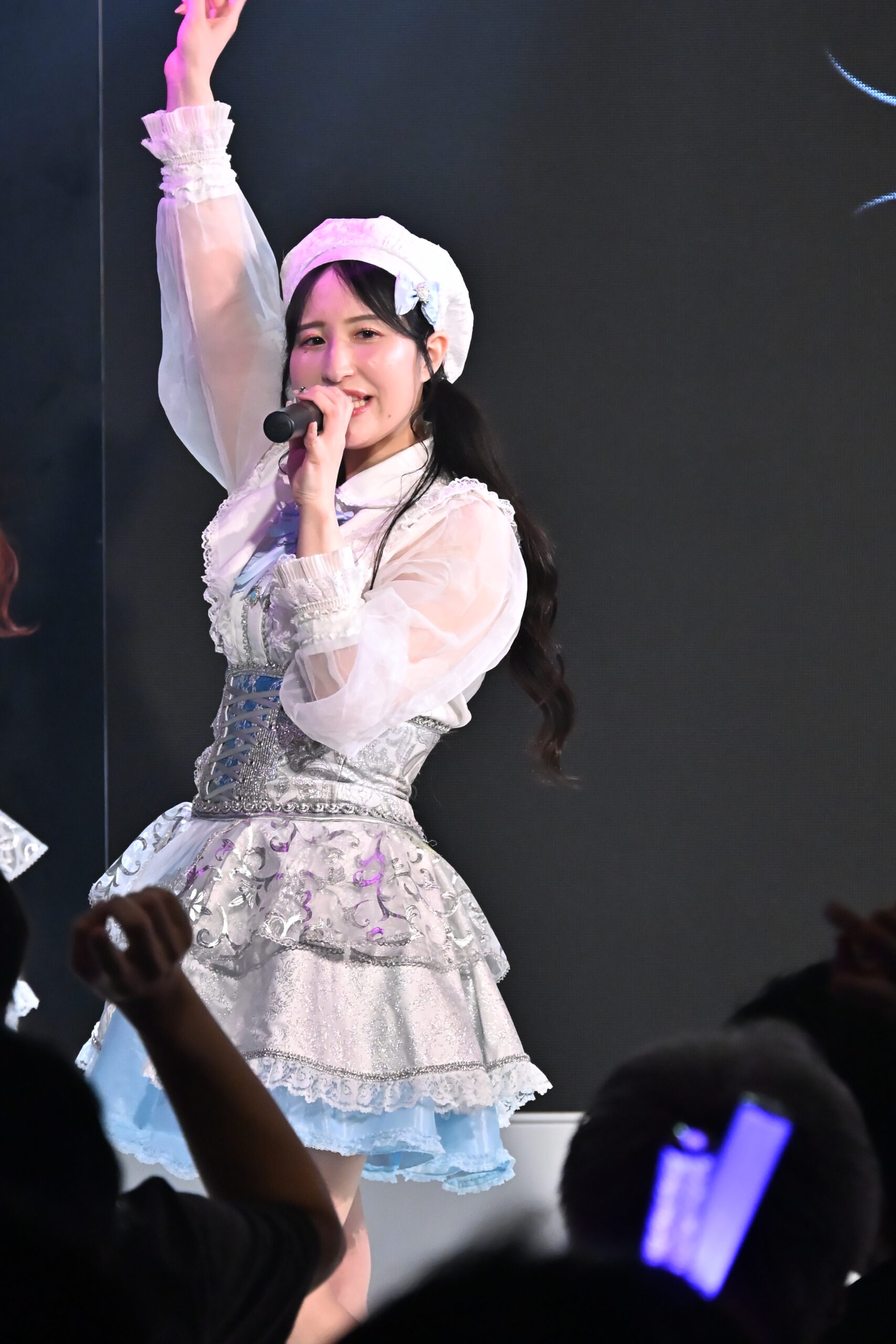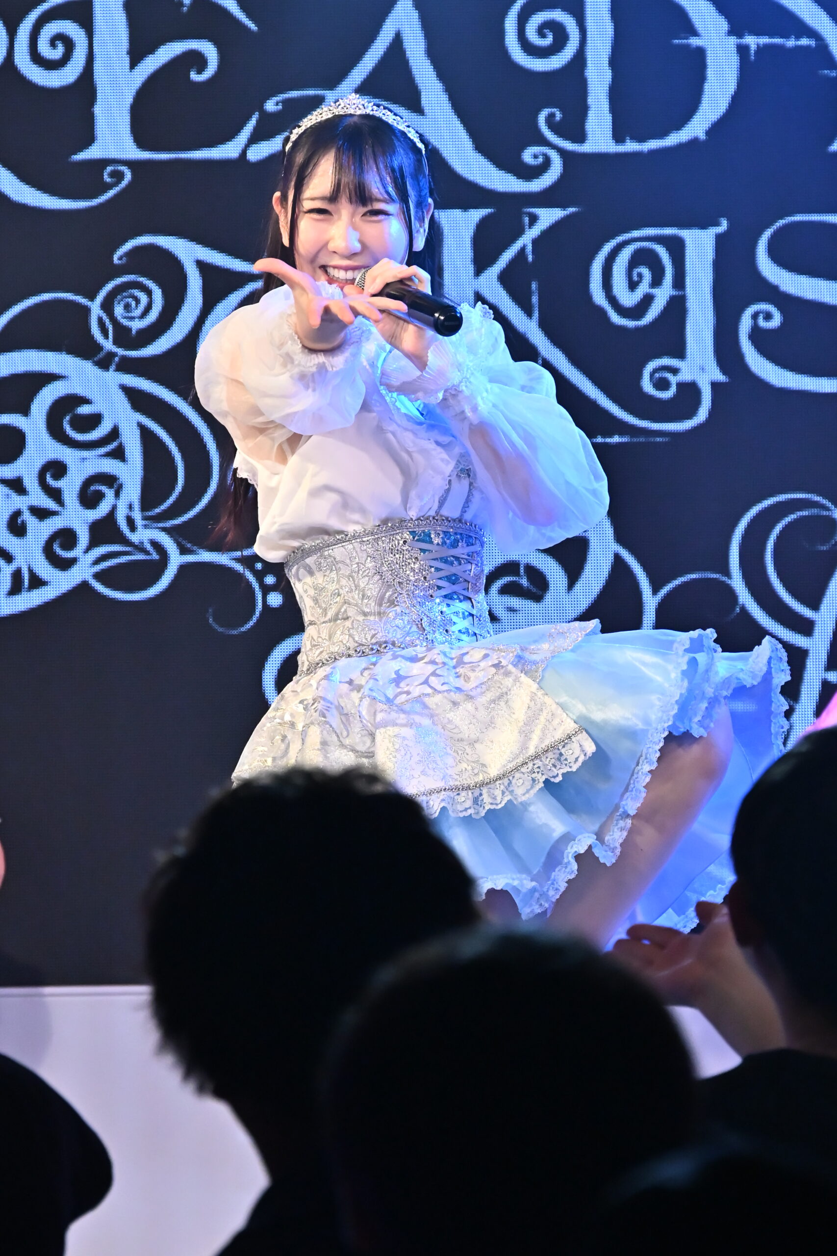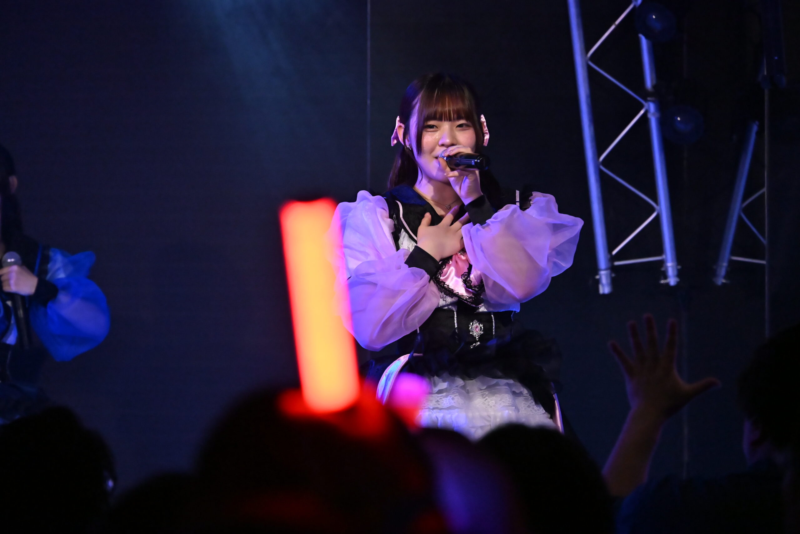 最後は、READY TO KISSとSAY-LAのメンバーをミックスしたシャッフルユニットのブロック。最初に登場したのが、SAY-LAの、咲山しほ・小椋妃奈乃・とわん・神崎セナ、READY TO KISSのもりしょうこ・瀬戸佳凛・小松かやの。このメンバーで歌ったのが、SAY-LAの『感情リバーシブル』。ちょっとセンチな乙女の恋心を、このメンバーは明るく元気に歌唱。途中、眩しい声で観客たちを巻き込んでゆくなど、終始、晴れた表情で彼女たちは歌を届けてくれた。「好き」の気持ちの中にある表と裏の感情を記したこの曲だが、このメンバーが歌うと、表と裏どっちも同じ感情のように見えてきた。