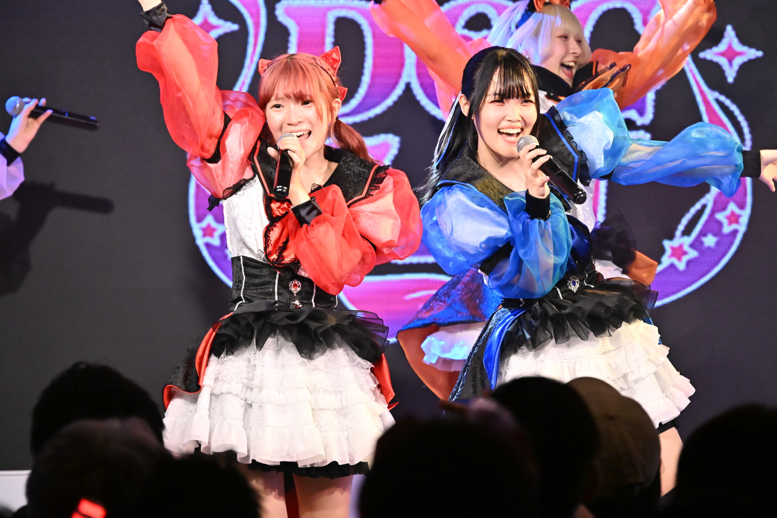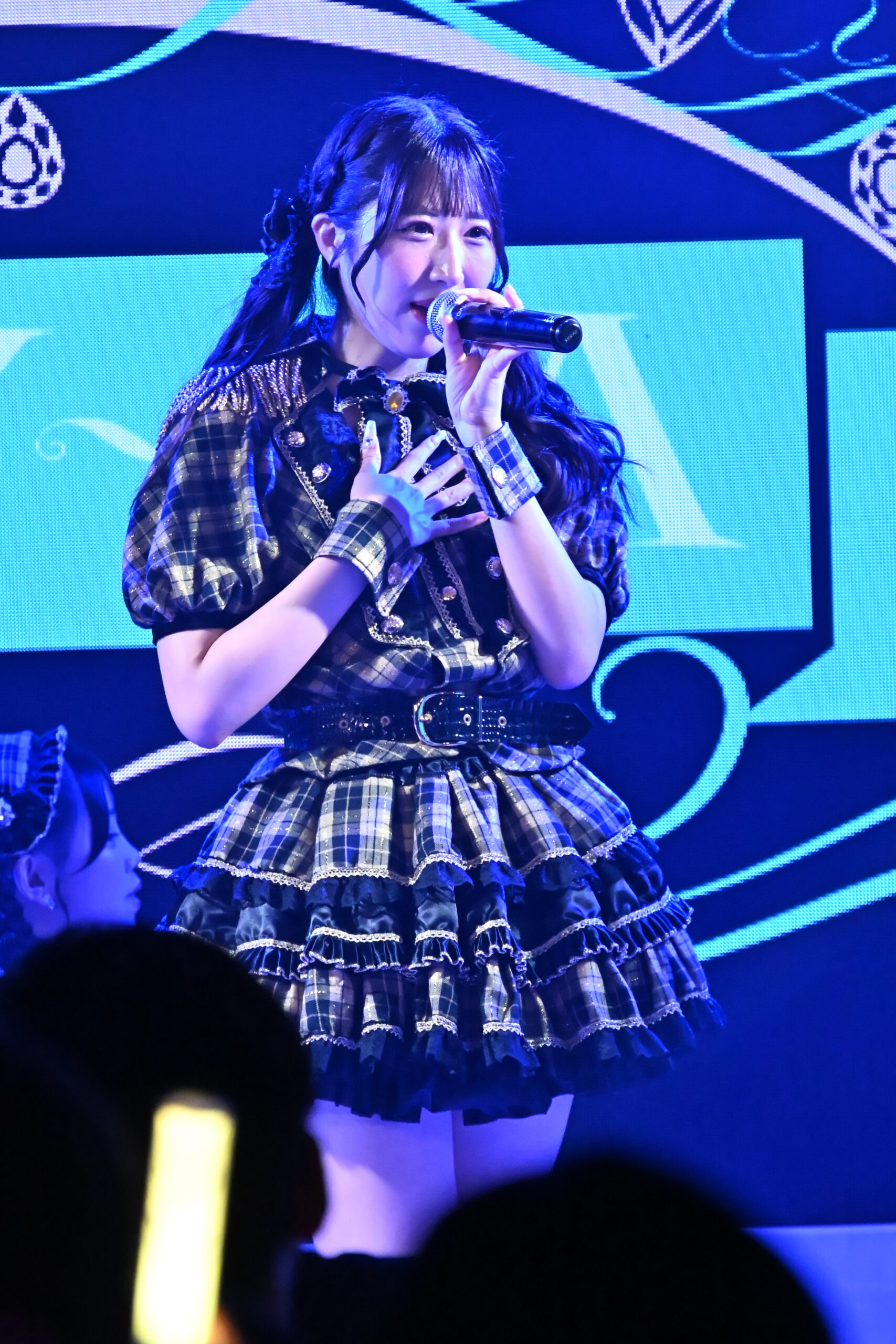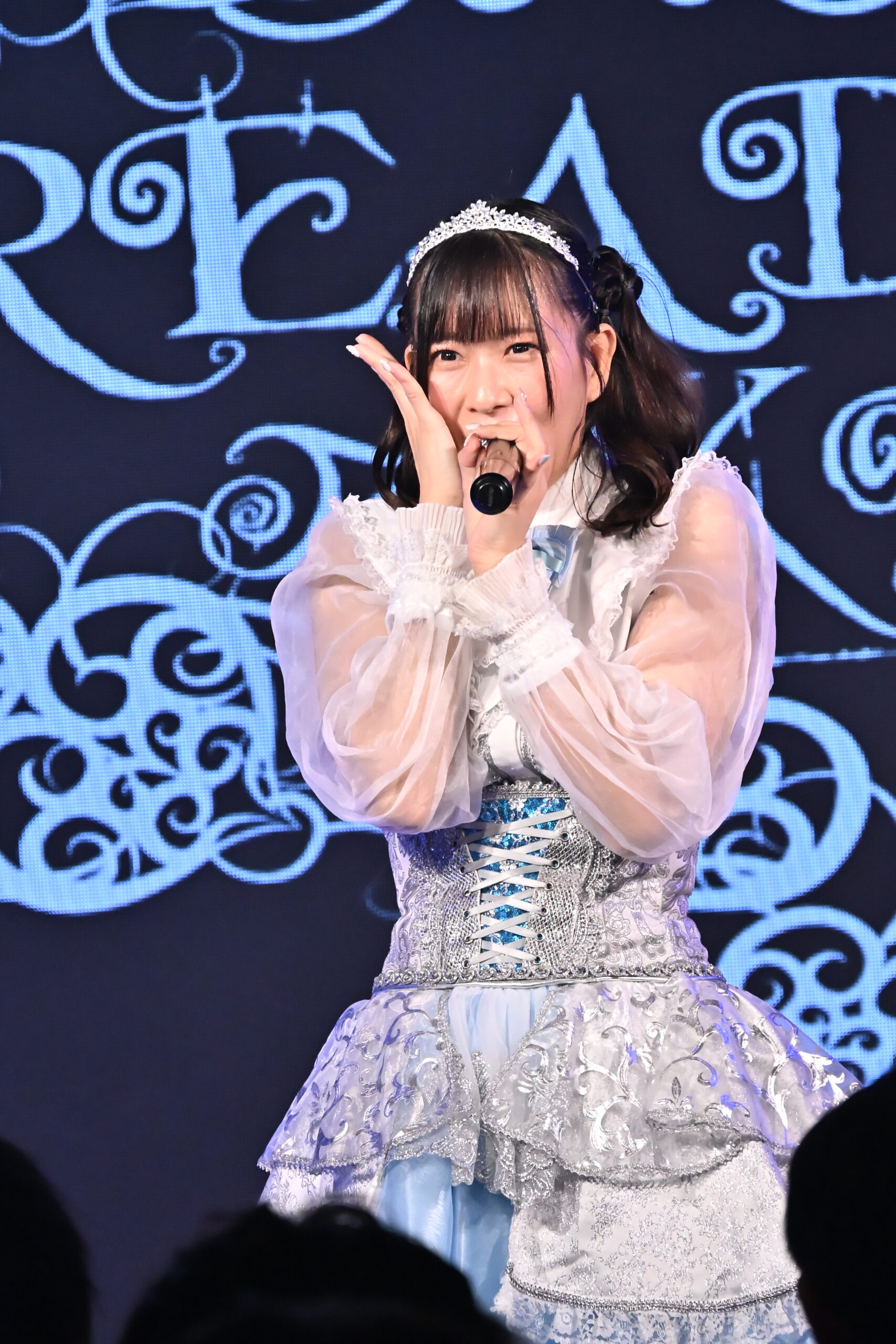 最後は、READY TO KISSとSAY-LAのメンバーをミックスしたシャッフルユニットのブロック。最初に登場したのが、SAY-LAの、咲山しほ・小椋妃奈乃・とわん・神崎セナ、READY TO KISSのもりしょうこ・瀬戸佳凛・小松かやの。このメンバーで歌ったのが、SAY-LAの『感情リバーシブル』。ちょっとセンチな乙女の恋心を、このメンバーは明るく元気に歌唱。途中、眩しい声で観客たちを巻き込んでゆくなど、終始、晴れた表情で彼女たちは歌を届けてくれた。「好き」の気持ちの中にある表と裏の感情を記したこの曲だが、このメンバーが歌うと、表と裏どっちも同じ感情のように見えてきた。