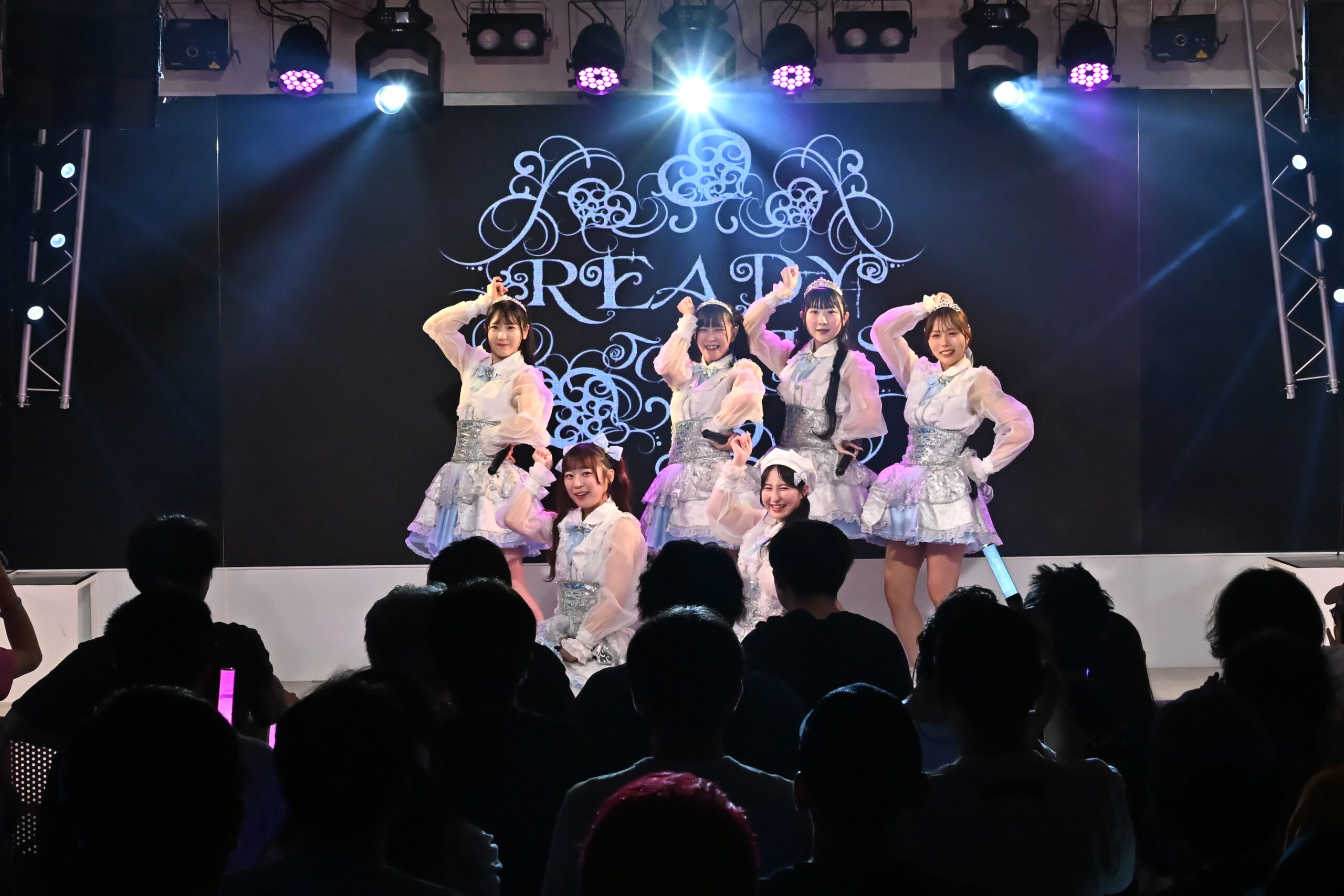 『READY TO KISS』から始まったREADY TO KISSのライブ。この日は、6人でパフォーマンス。永遠の愛らしさを魅力にしている今のメンバーらしい、眩しいチャーミングな姿がそこにはあった。甘えた素振りで歌う6人の姿も印象的だ。この日は、『I GET CRAZY』や『STAR LIGHT〜星色のこの気持ち、空に映れ〜』など、胸をときめかす曲をラインアップ。甘い声で歌う彼女たちの歌と声をかけあうたびに、一緒にドキドキした気持ちが膨らんでゆく。『I GET CRAZY』の中から飛び出す、「君が好きです」の声に「俺もー」と熱情した声を返すやりとりや、メンバーたちの甘えた声も印象的だ。『STAR LIGHT〜星色のこの気持ち、空に映れ〜』の歌唱中にずっと上がっていた、観客たちの熱情した声。フロアから「お前が一番」コールの飛び交った『限界DRIP』では、6人がさらに胸をときめかせ、積極的にアプローチ。最後に歌った『ムテキモード』まで、観客たちの「好き」というハートの鼓動を高めてゆくライブ姿を見せながら、フロアの熱を上げ続けていった。