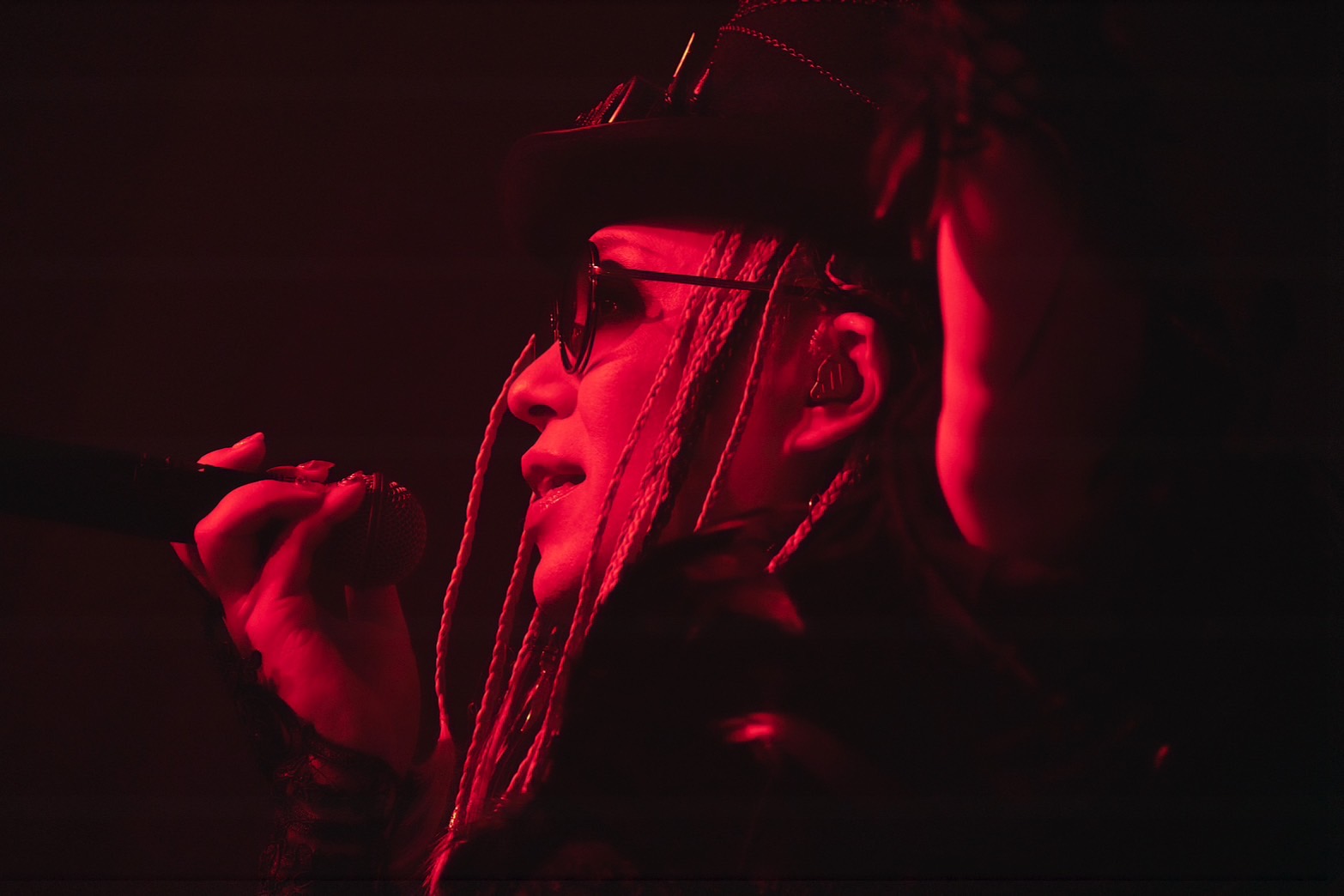 「彦星Day」のライブは、冒頭からA・O・Iのギターか唸りを上げて猛り狂えば、NIYのベースも攻撃的な音を次々と繰り出す。ワイルドかつスリリングな演奏の上で、クールな様でIZAMが『Magenta Story』を歌いだす。IZAMはサングラス姿のように、眼差しが見えないぶん、よりミステリアスさを醸しだしていた。突き刺すようなIZAMの声に、A・O・Iも少し妖艶さを持ったクールな声で彩りを添えてゆく。サビでは、凛々しいIZAMの歌声をA・O・IとNIYが雄々しい声でサポート。とてもスリリングでハードボイルドな演奏に触れ、場内中の人たちが胸を騒がせ、3人の姿に熱い視線を注いでいた。