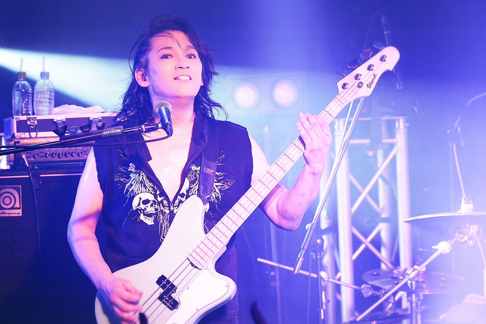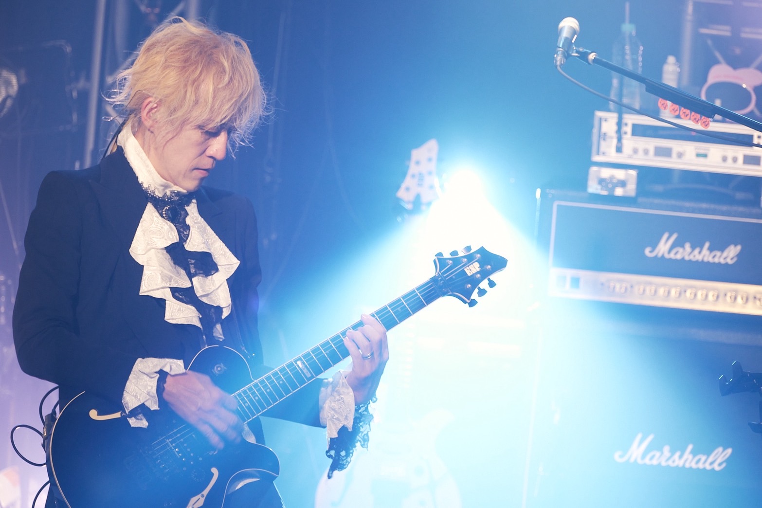 『愛咲ク糸』が始まったとたん、そこには美しくも雄大な音景色が広がった。この曲でもIZAMは、A・O・Iのギターの音色と寄り添いながら、言葉の一つ一つを大切に歌い紡ぎだす。サビで軽快に演奏が走り出すのにあわせ、IZAMを筆頭にメンバーらも感情のフェーダーをグッと上げてゆく。モニターに右足を乗せ、少し身体を前のめりに。でも、LOVERSを見つめながら温かな声で「君への思いが」と歌うIZAMの姿も印象的だ。このブロック、曲を重ねるごとに重厚さを増してゆく。続く『Nightmare』を通してSHAZNAは、観客たちを夢魔の世界へと誘いだした。彼らは、低音域の利いた歌声や演奏を次々と繰り出し、LOVERSを黒い微睡みの世界へ導いてゆく。3人がサビで雄々しく叫ぶ姿にあわせ、場内から無数の拳が突き上がる。さぁ、もっともっと悪夢の迷宮へどっぷりと堕ちていけ。