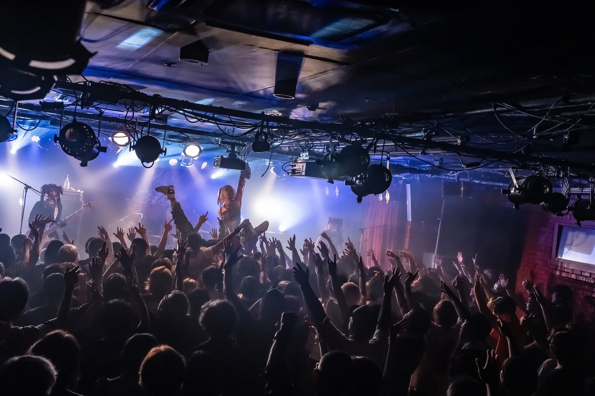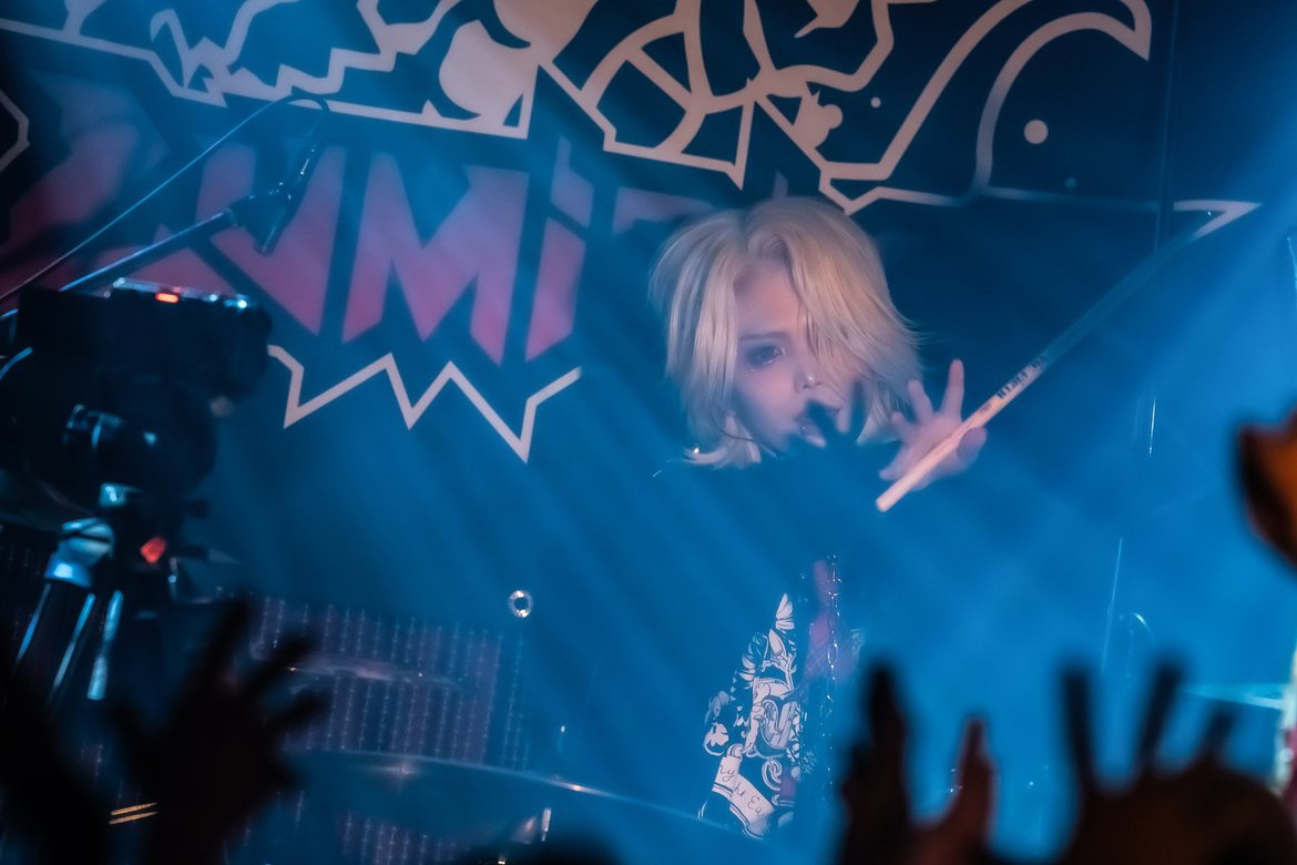 「ここからはLUMiRiSEの真骨頂。LUMiRiSEが演奏しているときくらいは頭の螺子外して、やりたいようにヤれ」。その言葉に続いて、LUMiRiSEは感情を爆裂させるように『SHOOTER』を殴りつけた。その途端、フロア中の人たちが一気に爆上がる。フロントの3人は台に上がり、今にも客席へ飛び下りそうな姿で戦いを挑んでいた。「おい、もっとこい」と煽る琴海。曲が進むごとに熱情してゆく演奏に刺激を受け、ダイブする観客も登場。雄々しく声を張り上げる琴海。滾るその感情を、3人の演奏陣が激しくさらに押してゆく。一心不乱にギターを掻き鳴らす来未。キリッと前を見て音を叩き出すMIZukI。おとは身体を心地好く揺らし、楽しげにベースを弾いていた。