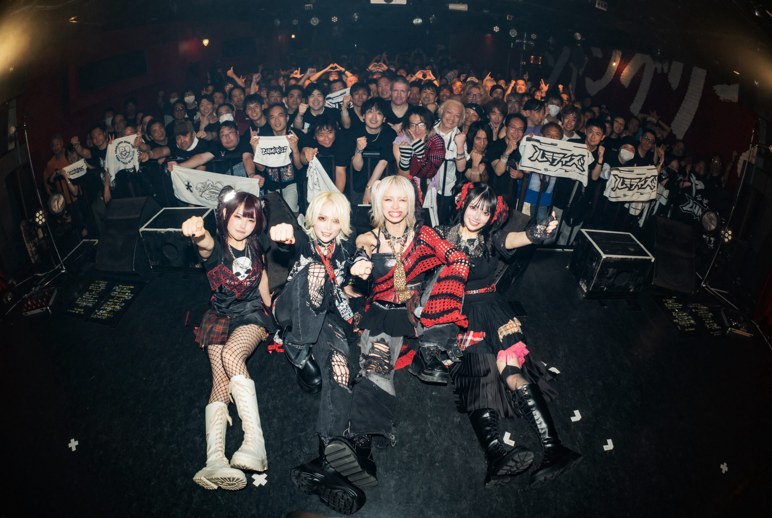 「やりたいようにヤれ」の声が嬉しい。その言葉に相応しい、超攻撃的かつハードエッジなデジタルラウドナンバーの『BATTINESS』が飛びだした。激しく唸り、うねるLUMiRiSE流のミクスチャーロックに乗せ、フロア中の人たちがその場で2ステを踏んで暴れれば、拳を突き上げ、声を張り上げる。理性??そんなもの、とっくにどっかへぶっ飛んじまったよ。4人が魂をすべて解き放ち、裸の感情で煽りたてるんだもの。一緒に騒ぎ狂わなきゃここにいる意味がない。フロア中の人たちがヘドバンや身体を折り畳む景色も圧巻だ。途中、琴海が観客たちへ背を向けてダイブ。フロアにいる人たちが彼女を神輿のように掲げてフロアを練り歩けば、琴海も、掲げられた姿で熱唱していた。「やりたいようにやればいいんだ」と叫んだ声のように、メンバー自身がやりたいように暴れながら、観客たちを煽り続けてゆく。