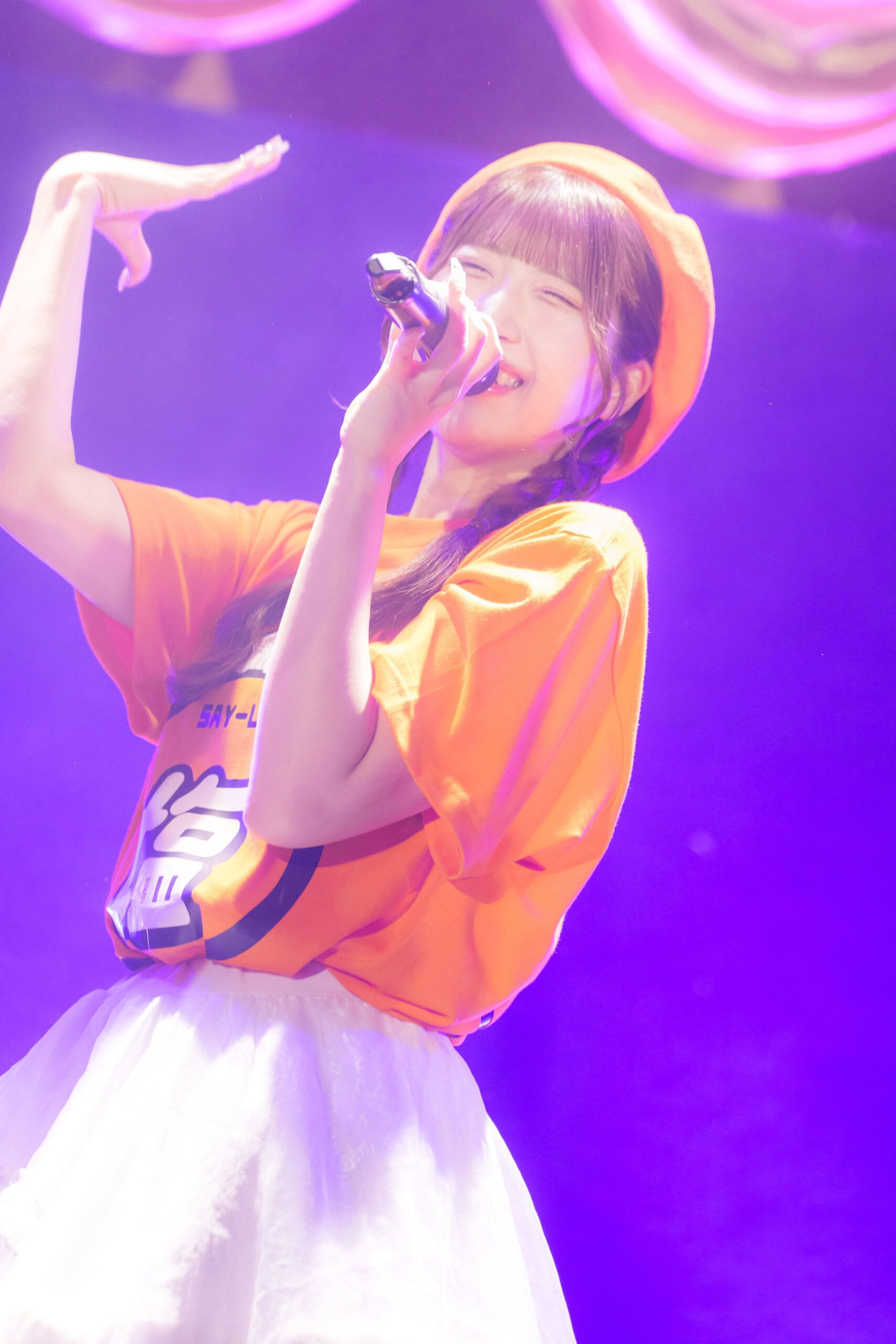 惹かれあう互いの関係を歌にして伝えようと、SAY-LAのライブは「好きだよ好きだよ 好きだ 絶対運命マグネット」と歌う『運命マグネット』から始まった。この日、生誕衣装を身につけた咲山しほ以外のメンバーもオレンジ色のしおまるTシャツ姿なのも生誕祭らしい。フロア中で大きく揺れるオレンジ色のペンライトの輝きも眩しければ、「絶対運命マグネット」と叫ぶ声も飛び交う。その声に向けて、咲山しほが「君が好き」と思いを返す。N極とS極になったファンとSAY-LAのメンバーが強く惹かれあう景色が、そこには生まれていた。早くも胸熱な気持ちだ。お互いの関係が奇跡ではなく、あるべき運命だと示すように、続く『胸熱アンドロメダ』でも、熱情した声と思いのやりとりが交わされる。ほんと、胸が熱いよ!!