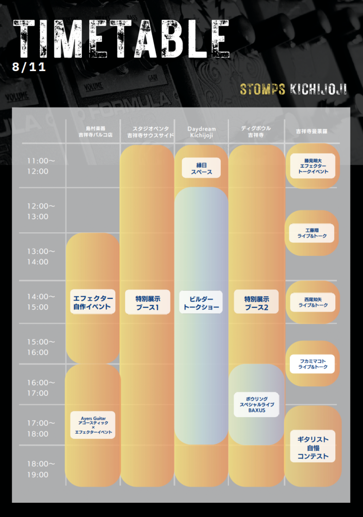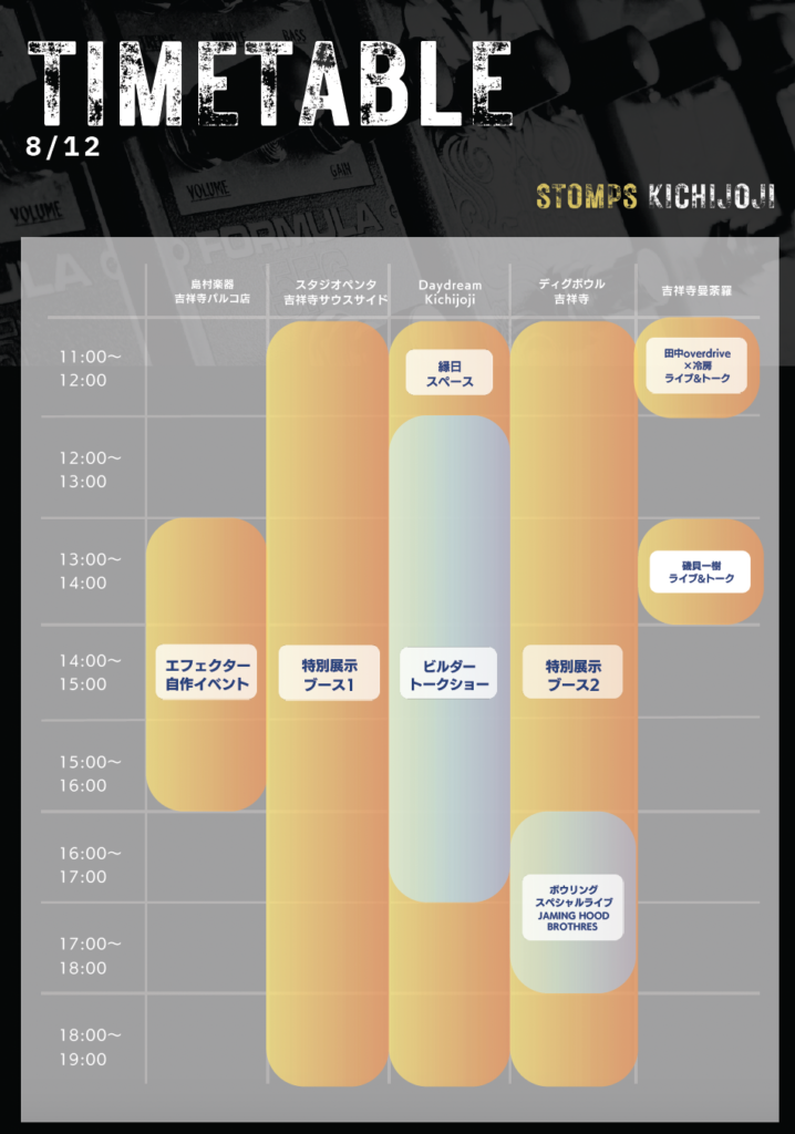GUITARS/Caramel’s Guitar Kitchen/Lee Custom Amplifier/Petla/RoShi Pedals/Sunfish Audio/TOKYO EFFECTOR/Umbrella Company/UNTAKE GUITARS/Vin-Antique/なとり音造/島村楽器吉祥寺パルコ店/勝見明大(Aki’s guitar shop)/新岡大(AYERS GUITAR)/SEIKO/BUXUS/JAMMING HOOD BROTHERS/工藤翔/西尾和矢/フカミマコト/田中Overdrive/冷房/磯貝一樹/他