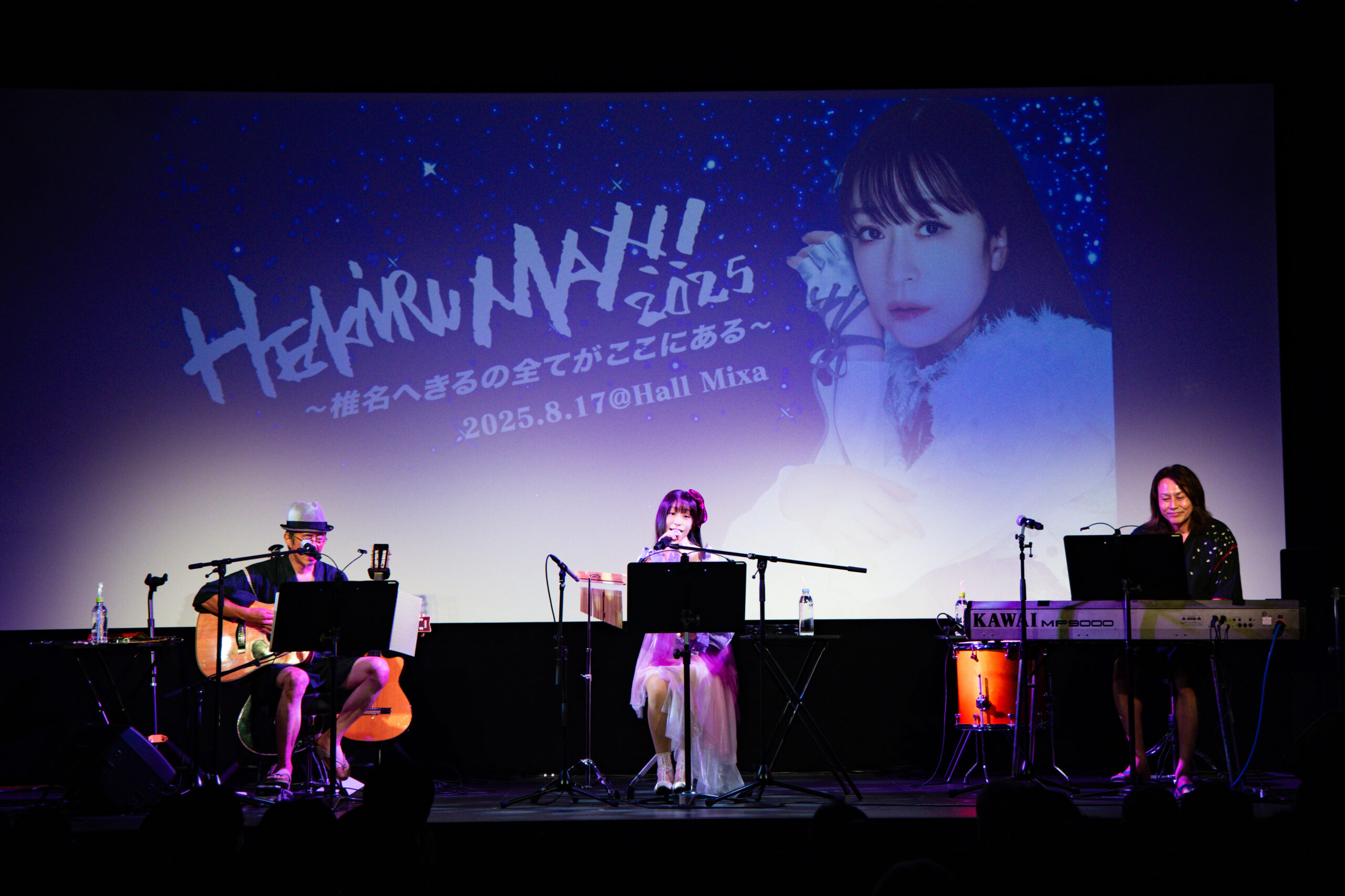 3日日となった8月17日(日)の公演では、「歴代ライブ上映会」を通して、「STARTING LEGEND 1999 Face to Face “Version 417″」「HEKIRU SHIINA 30th ANNIVERSARY LIVE~HARMONY STAR~」公演の模様を上映。「椎名へきるトーク&アコースティックライブ」では、トークゲストに、声優の冨永みーなを招聘。軽妙なトークを繰り広げたその後には、アコースティックライブが行われた。