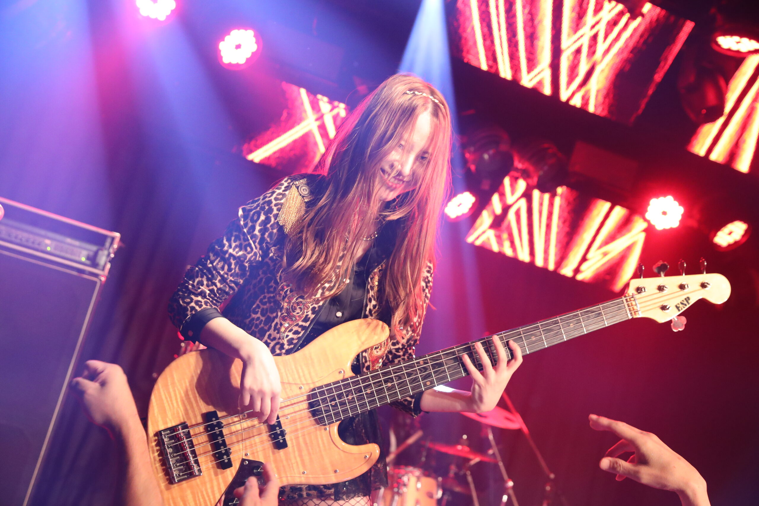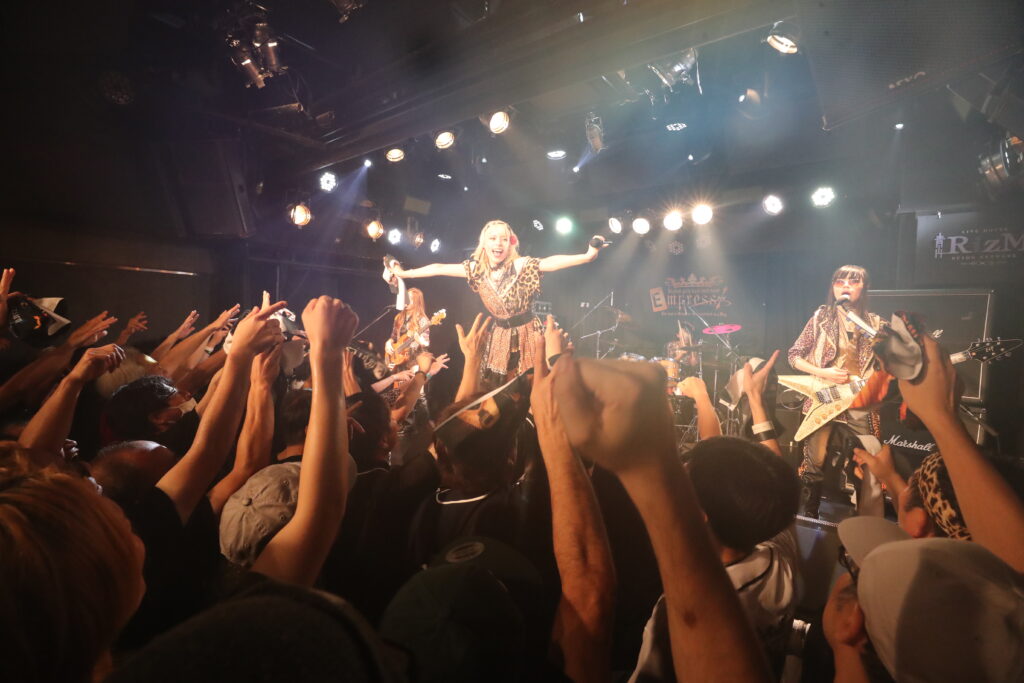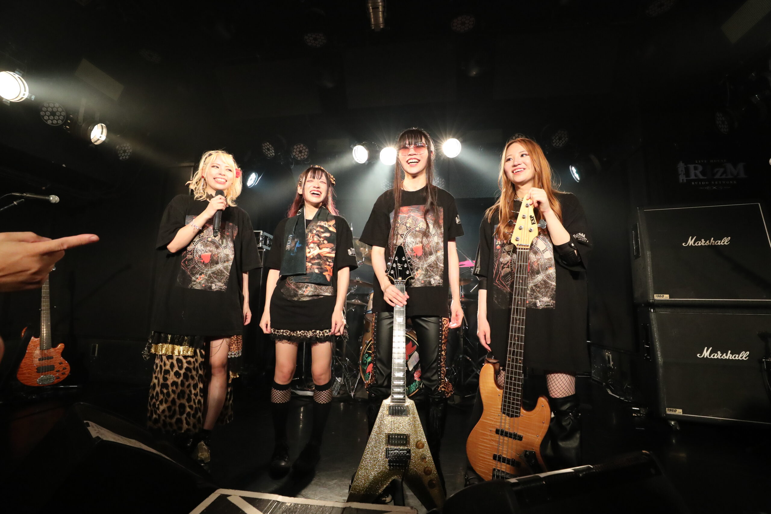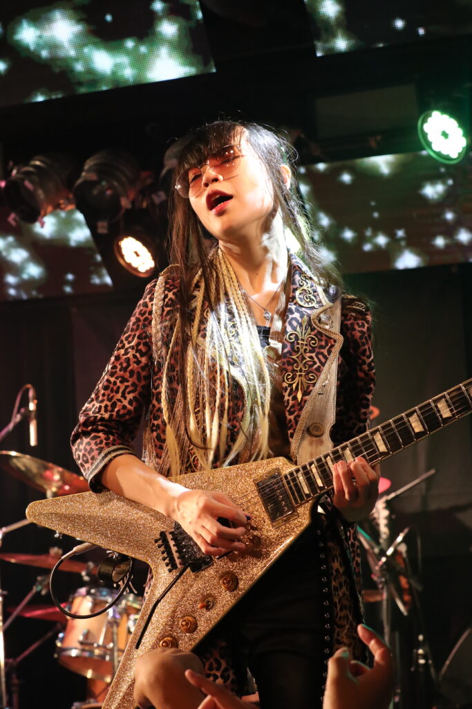 そこへノイズのように重く歪むギターの音を轟かせて、みつきが登場。そこからは、みつきの持ち味を生かした80年代ハードロック然とした演奏が炸裂。みつきのギターソロも、ときに天空を飛び交い、ときに地上を勢い良く駆けるように音を響かせ、疾走し続けていた。そして‥。