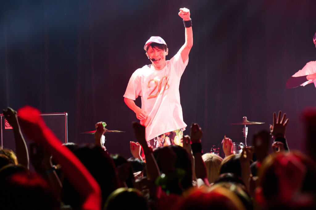 「これからまだまだもっとでっけぇ花火を一緒に打ち上げたいですね」。ドンドンタンッと打ち鳴らされるドラムのリズム。観客たちが、ドンドンのリズムにあわせて両手を高く掲げ、タンッのリズムを合図に尻を叩く動作を繰り返す。『花火』では、ぶうの打ち上がる花火を真似た奇天烈な動きと叫ぶ声に合わせて、フロア中の人たちも、みずからが花火になって打ち上っていた。3桁を越す人たちがえんそくの演奏を合図に打ち上げるたびに、その場に人力で作り上げた熱狂の花火が生まれる。両手を上げた観客たちが、ぶうの「ドーン」の声を合図に手の花を大きく咲かせる。楽曲に合わせた奇天烈な動きの一つ一つが、とても印象的だ。最後にみんなで「ドーン」と打ち上がった様も圧巻だった。