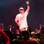 ぶうの「上まで飛んでいけるかー」の煽り声を合図に,えんそくは『イン・ザ・マリオワールド』を叩きつけた。観客たちがマリオのようにしゃがみこみ、演奏のタイミングに合わせて、大きく飛び跳ねる。ジャンプをするその姿が、ときに前から後ろへと流れるWAVEになって見えていたところにも、えんそくファンたちの強い団結力を感じる。熱を上げて爆走する楽曲に合わせて拳をずっと振り上げれば、メンバーらの「もっと」のかけ声に合わせて、観客たちがしゃがんでは大きく飛び跳ね続ける。えんそくも、この場に最初から熱狂したカオスな様を作りだしてゆく。