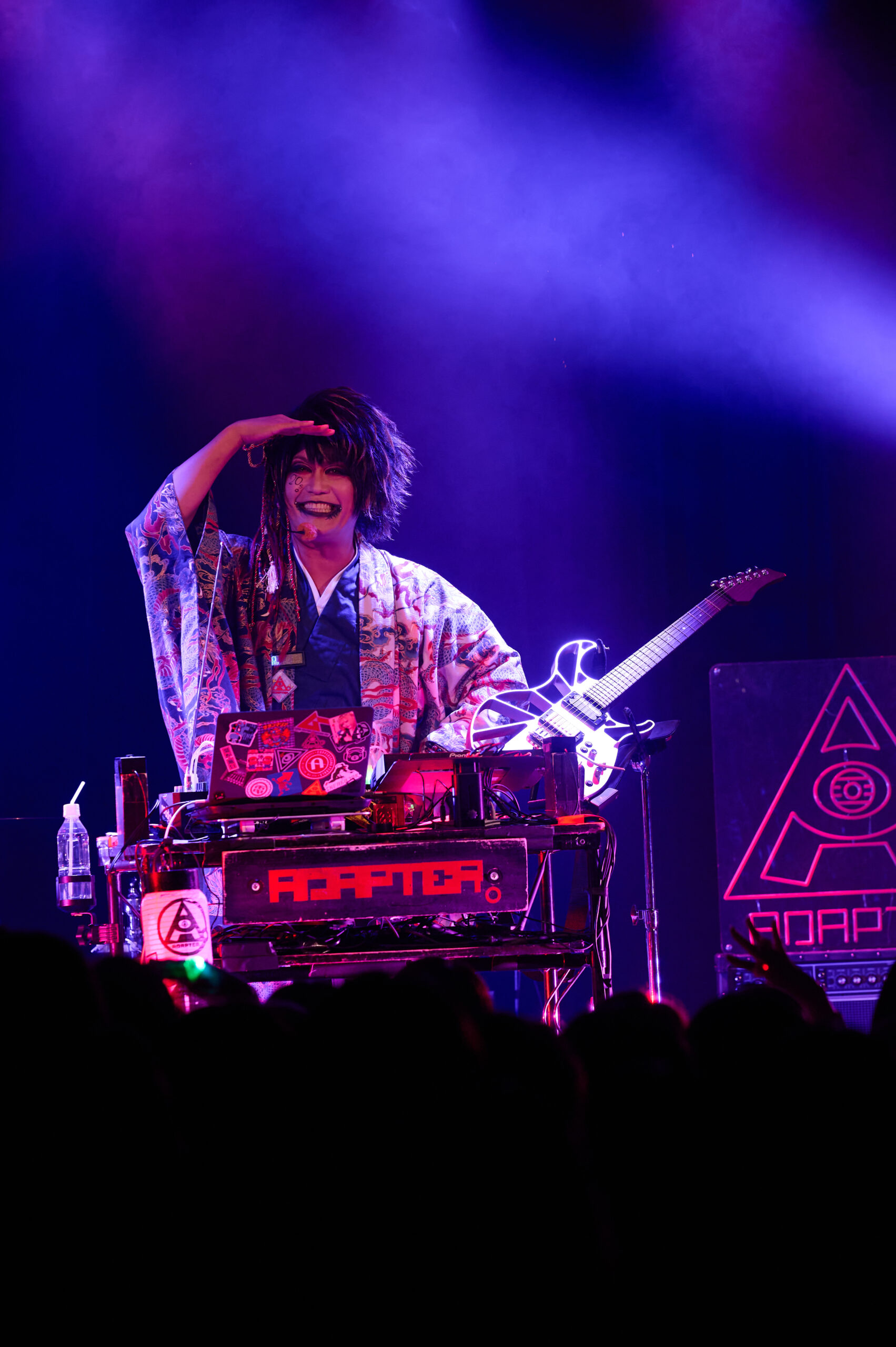 福助。の合図で、ピコピコとしたシークエンスな音が一気にバーストした。『僕と君の幸せ』でADAPTER。は、カラフルなのに破壊的なテクノサウンドを叩きつけ、場内の人たちを、気持ちが動くままに祭り上がる輩たちに染めあげた。甘さを隠し持った福助。の歌声と激しくもけばけばしいテクノサウンドがクロスオーバーしながら、この場にダンサブルでカオスな空間を作りあげる。そして…。