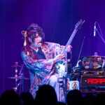 ギターを手にした福助。が次に繰り出したのが、激しく、華やかで、雅でダンサブルな『枯れ尾花』。一つ一つの音が刺激的でフリークなビートになって観客たちの心や身体を揺らす。雅で絢爛華美な演奏の上で、福助。が煽るように歌っていた。巧みに転調をしながら、ADAPTER。は観客たちを踊らせ、ときに頭を揺さぶるなど、終始華やかな。でも、どこか螺子の壊れた演奏の渦へと巻き込み、一人ひとりの頭の中から現実という景色を次々と消し去っていく。だから、ステージの上から派手に流れだす音の刺激にずっと溺れていたかった。