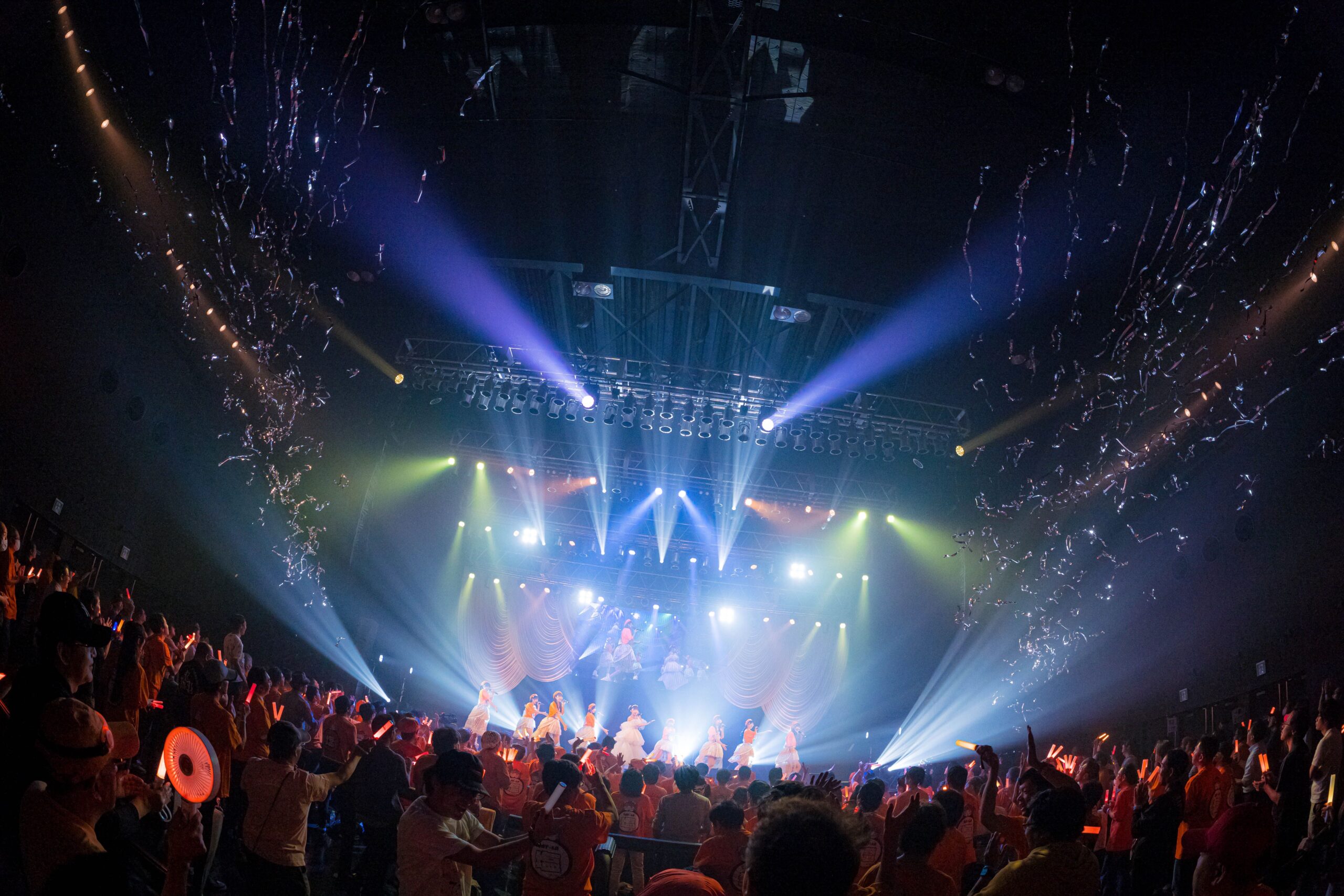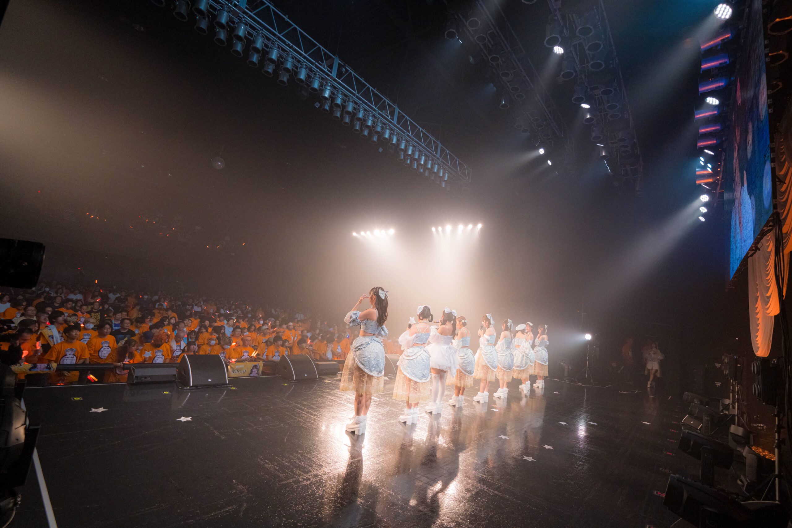 この日のフロアには、たくさんのオレンジ色の星空が広がっていた。その輝きに向かって9人は『星空シャンデリア』を歌っていた。咲山しほが歌う「星空シャンデリア 伸ばした手の先には 無限の星輝いてる」と歌う声が、この日もキラキラと煌めいていた。ステージの上で9つの星(スター)が眩しい輝きを放てば、場内中でも、野太い声の流星群と一緒にたくさんのオレンジの星が大きく、大きく揺れていた。フロア中に輝く星空に向けて、咲山しほのサイン入りのウィングスターがたくさん飛び交っていたのも印象的だった。