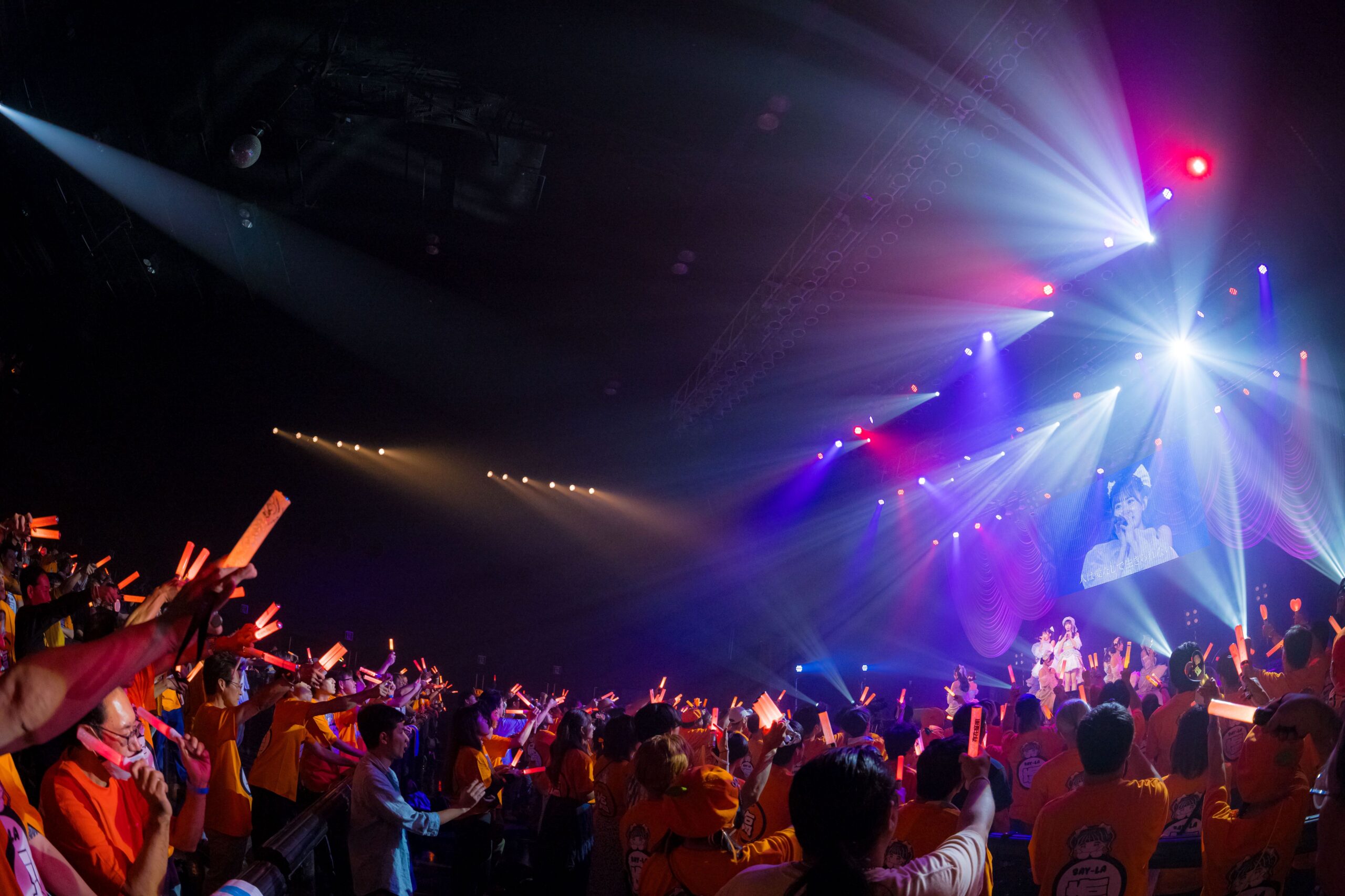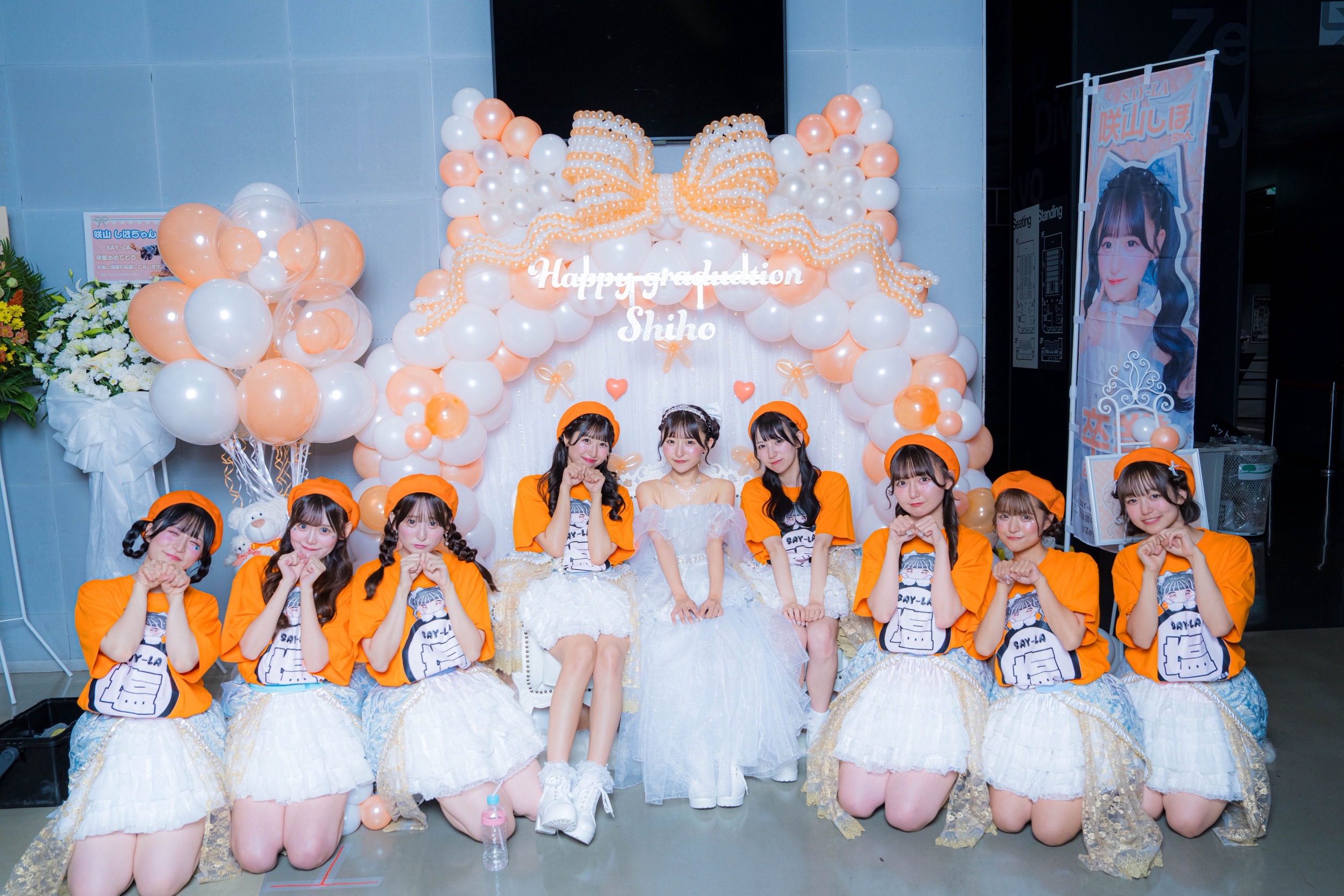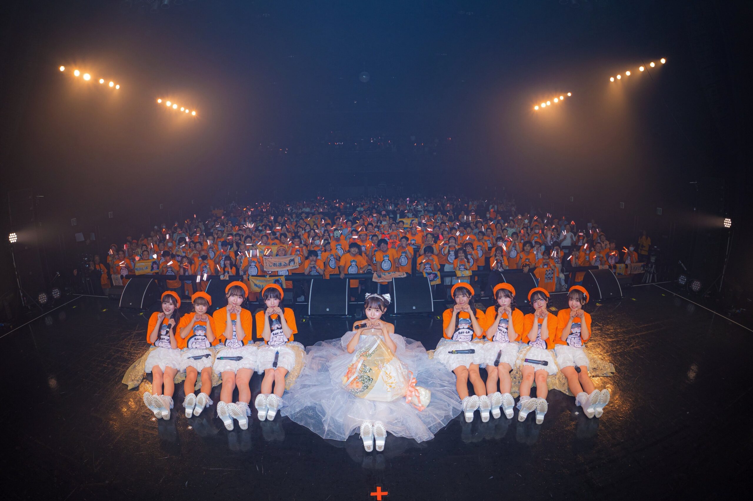 場内へと向かう階段には、これまでに咲山しほが身につけてきた歴代の衣装がズラッと飾ってあった。思い出のタイムトンネルを超えて場内に入ったら、そこには咲山しほのメンバーカラーと同じオレンジ色の塩○Tシャツを着た、彼女にこじらせ片思いをした人たちがたくさん集まっていた。SAY-LAのライブらしい光景だ。でも、この景色を見るのも、咲山しほを心の中で独り占めするのも今日で最後と思うと、やはり淋しくなる。