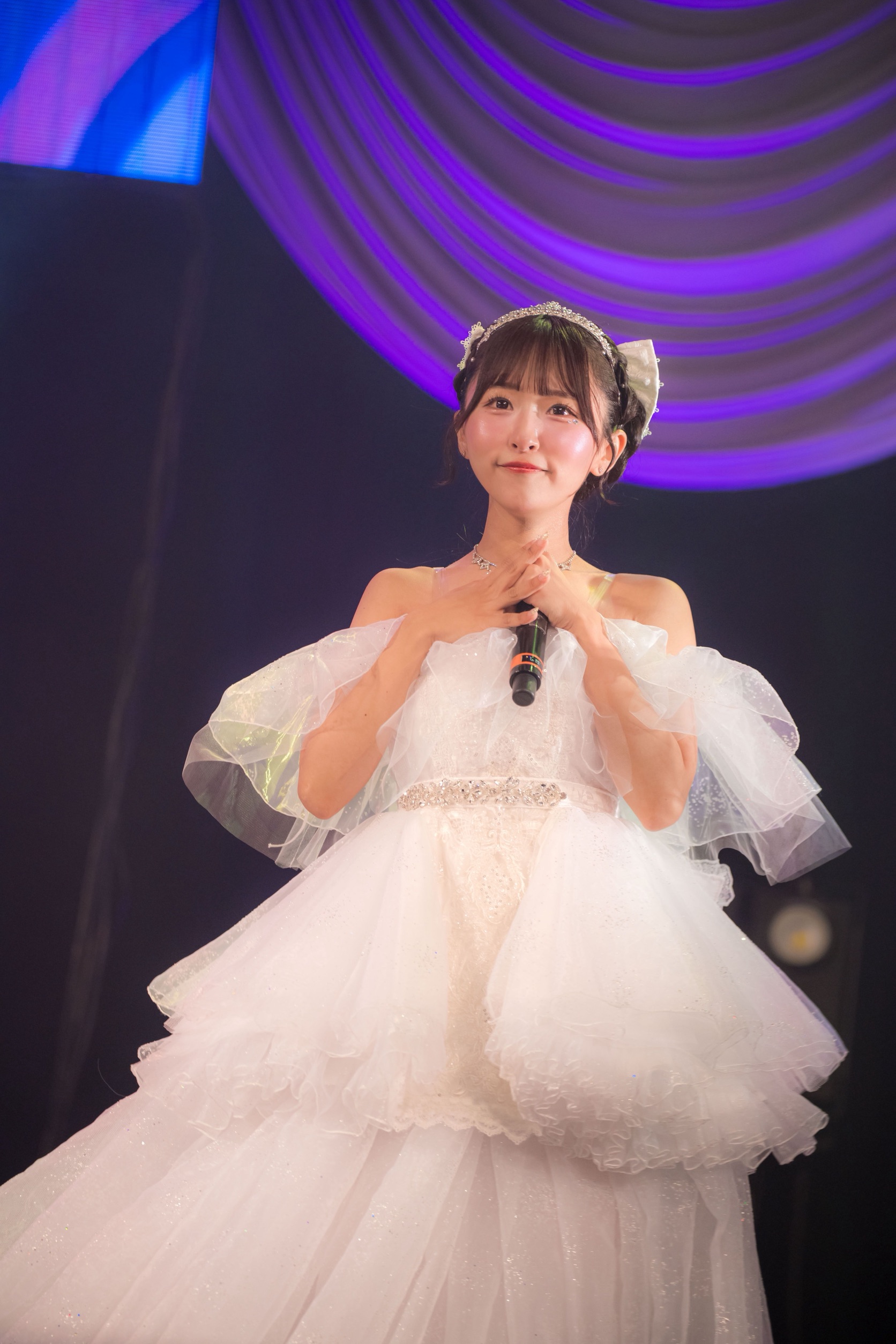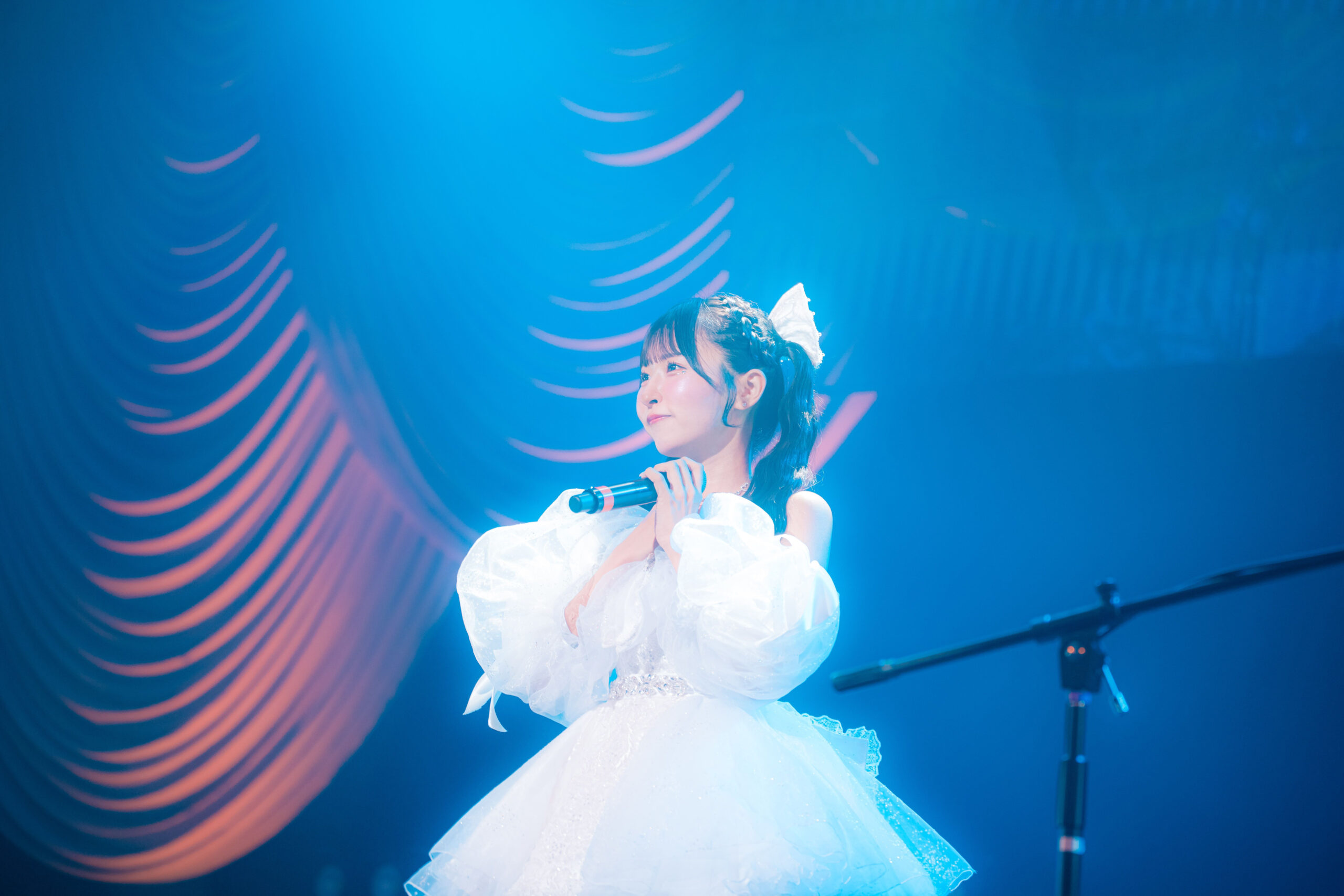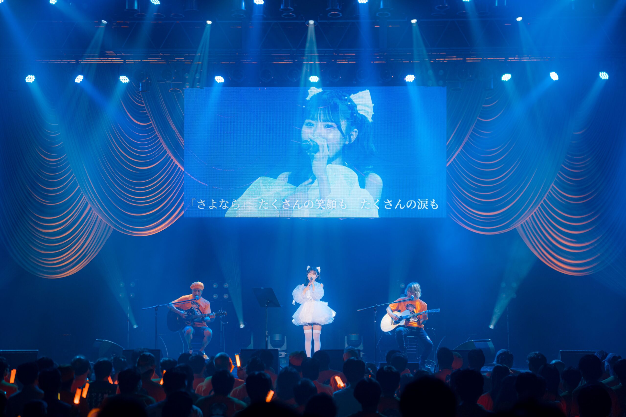 ここからは、咲山しほのソロ・コーナーへ。一つ目の卒業衣装に着替えた咲山しほは、SAY-LAの全楽曲を手がけるサウンド・プロデューサー/ミュージシャンの石谷光と、彼のパーマネントなバンドACMAのメンバーであり、石谷光の盟友でもあるKENJIをパートナーに、アコースティックなスタイルで歌唱。披露したのが、咲山しほバージョンで配信にもなった、卒業ソングの『さよなら』。