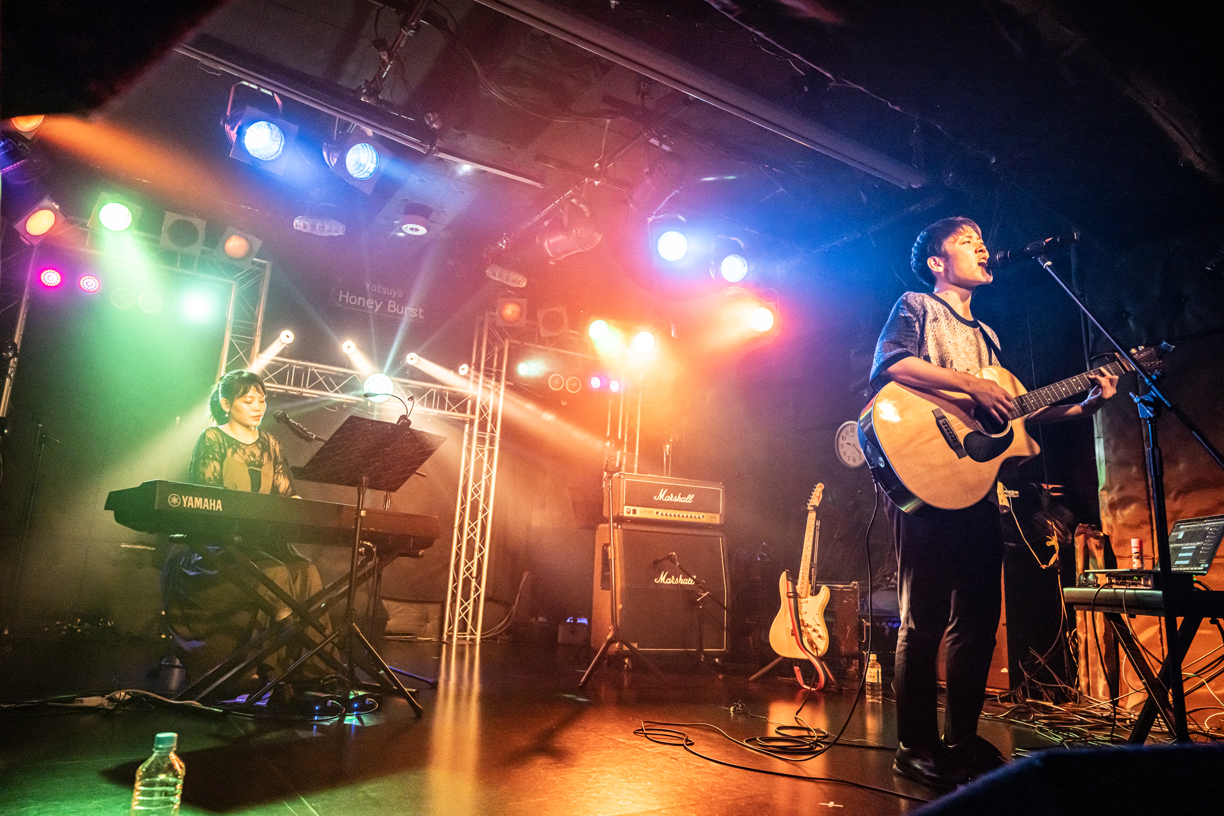 最後にのしげまつは、切ない片思いの恋心を歌った『コイノオト』を演奏。のしげまつには、もどかしい恋心を歌った曲が似合う。誰かを強く思う楽曲ほど、2人の歌声に感情の揺れがしっかりと描きだされてゆく。この曲は、響香が歌い、奏多がハーモニーと野太い音を響かせてギターを演奏する形を軸にしている。かつての、のしげまつのスタイルを示したこの曲を通して、改めて響香の歌声の魅力や、奏多のハーモニーワークと卓越したギター演奏の高さを実感。ほんと、聴けば聴くほど胸がキュッと締めつけられる楽曲だ。