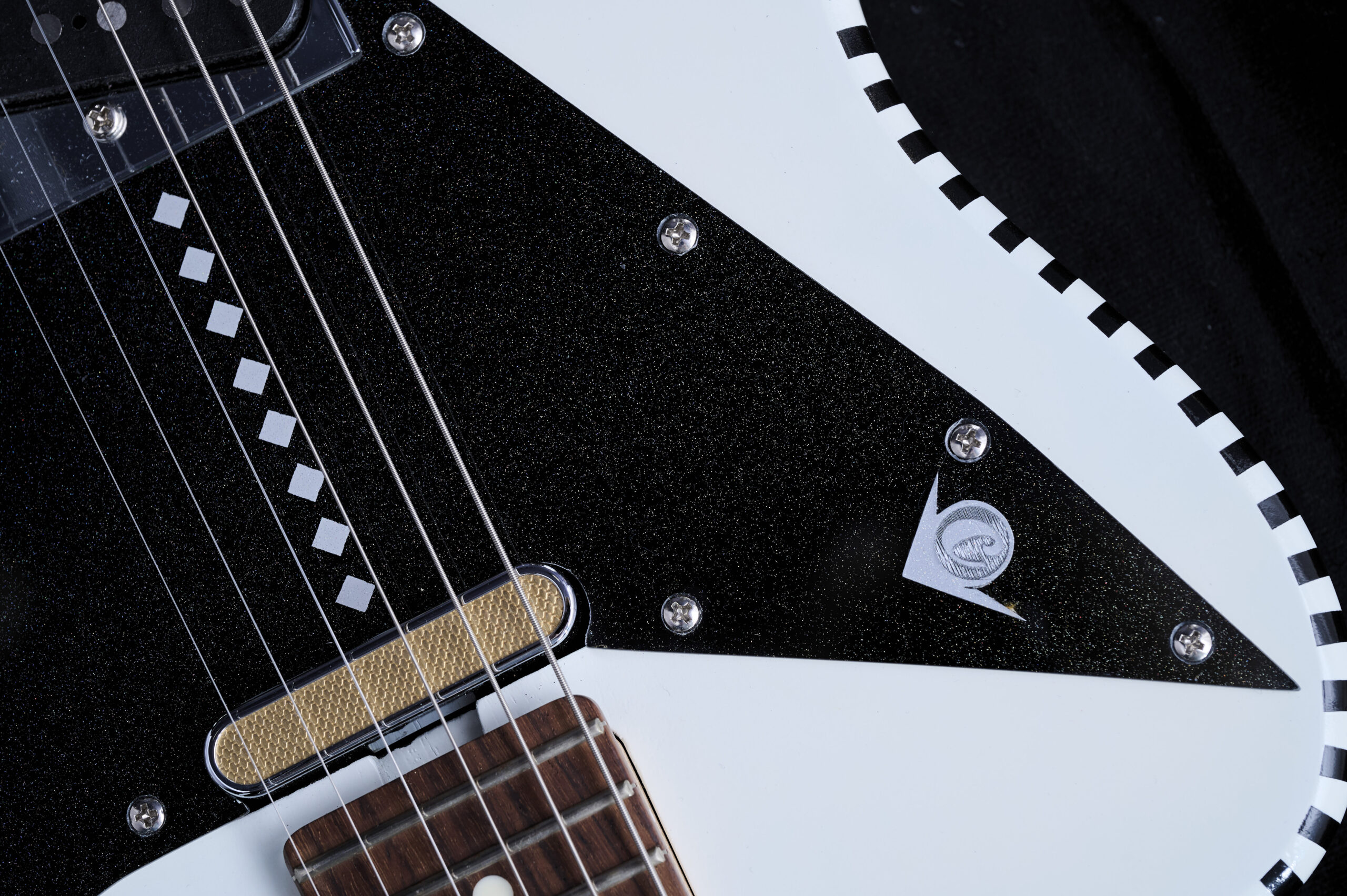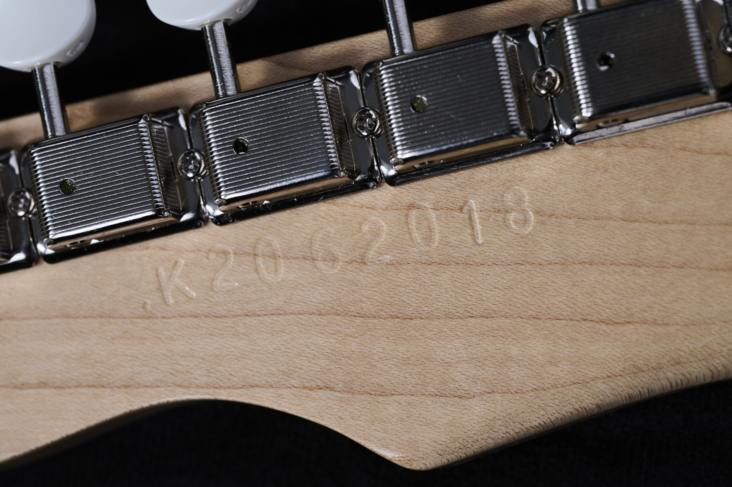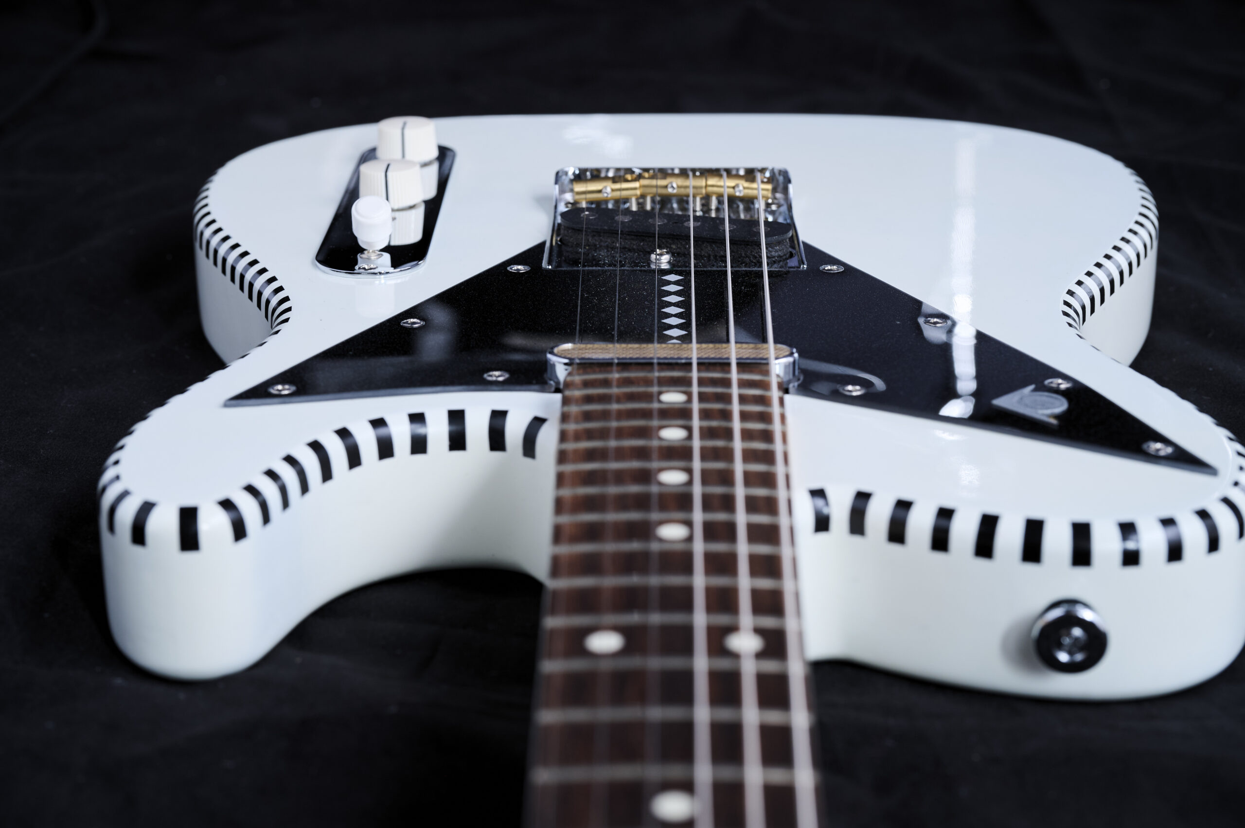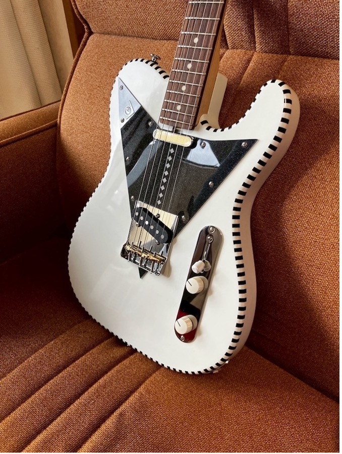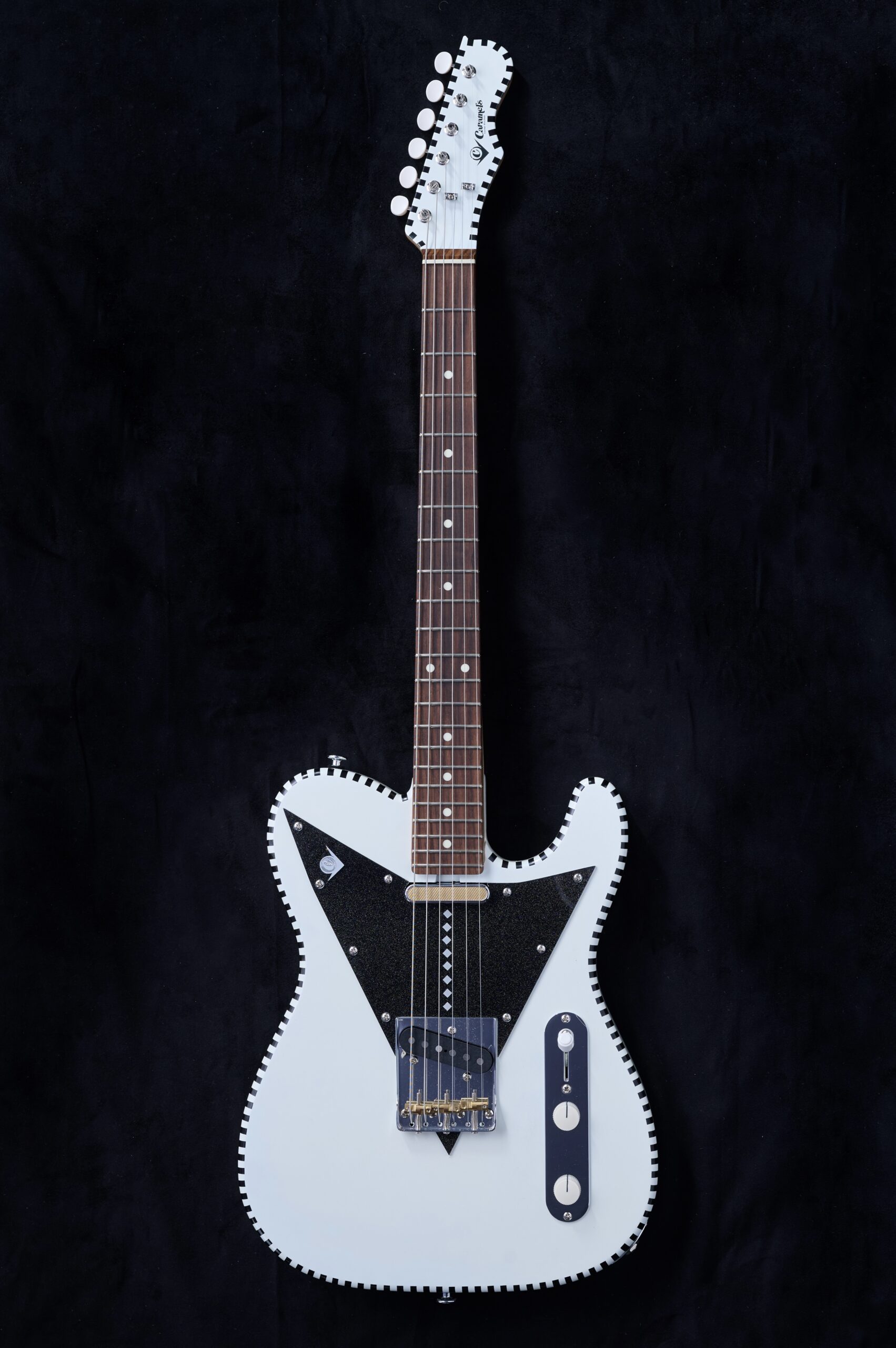 今回のギターはCGKの人気機種V3シリーズのNEWカラーバージョンで、ホワイトのボディーにブラックのチェッカードステッチのコントラストが引き立つデザイン。既存のV3モデルは磨きの塗装工程を省いたサテンフィニッシュだが、今回のギターはニトロセルロースラッカー塗装で丹念に仕上げられている。