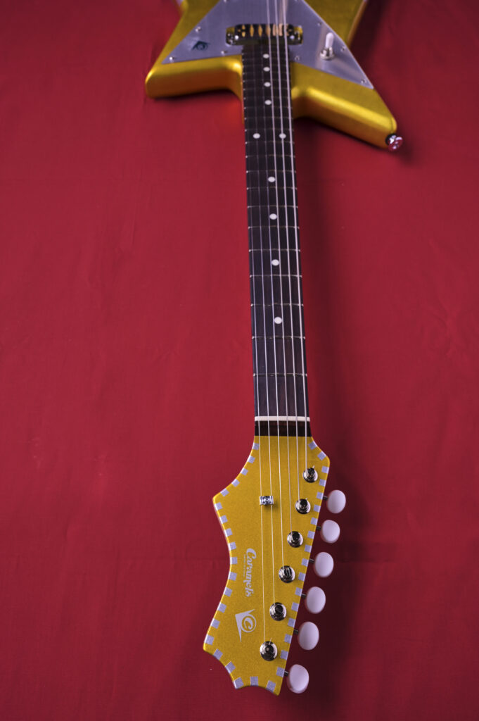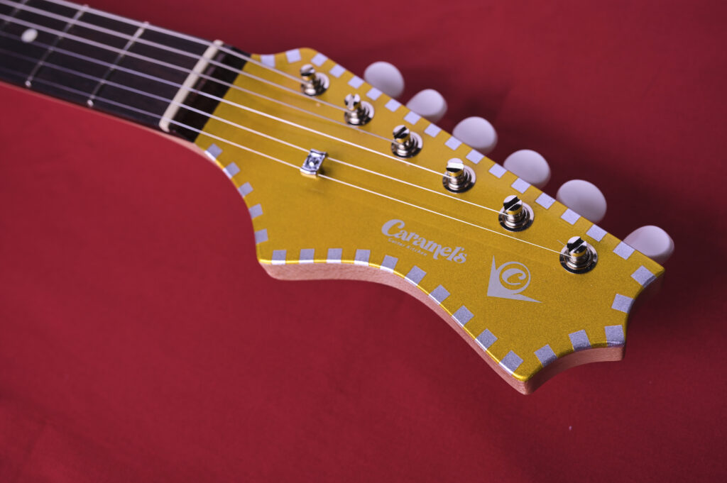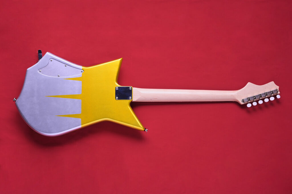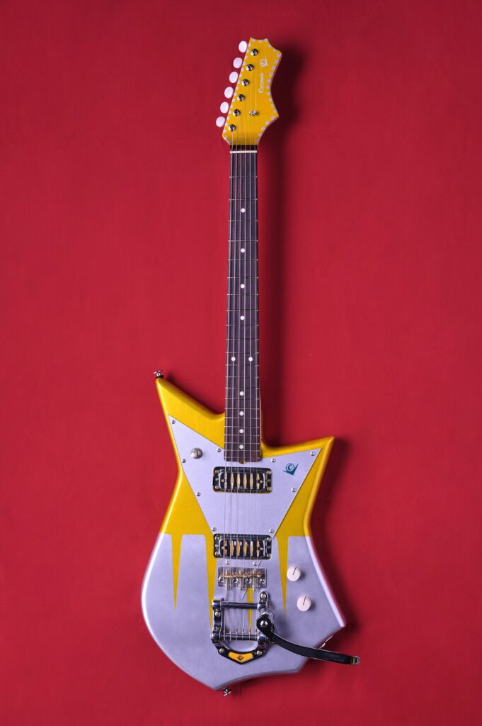 今回のギターは、上半期にリリースされた”コンペイトーシリーズ”が“横浜ミュージックスタイル2025”や先日開催された”島村楽器2025福岡GUITAR SHOW”に展示したところ、すべて即完するほど好評だったため、同シリーズのNEWカラーとしてとして制作された。前回同様、1950〜60年代のビザールギターを彷彿とさせていながら、しっかりとマテリアルにこだわり、斬新かつ現代の実用性を備えた1本だ。フリーハンドでデザインされたというボディは、まさに自由で奇抜なCGKオリジナルシェイプである。