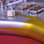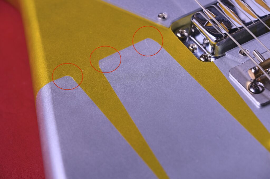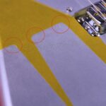 このデザインは、実はクラフトマンが元のデザインに納得がいかず、塗り直しをして完成している。この試行錯誤があったからこそ生まれたデザインである。そのためボディにいくつかのカッター跡があるが、プロトタイプのリアルな痕跡としてご了承いただきたい。その分、価格が本来よりかなり下げられているが、機能的にもサウンド的にもまったく問題はないのでお得だろう。