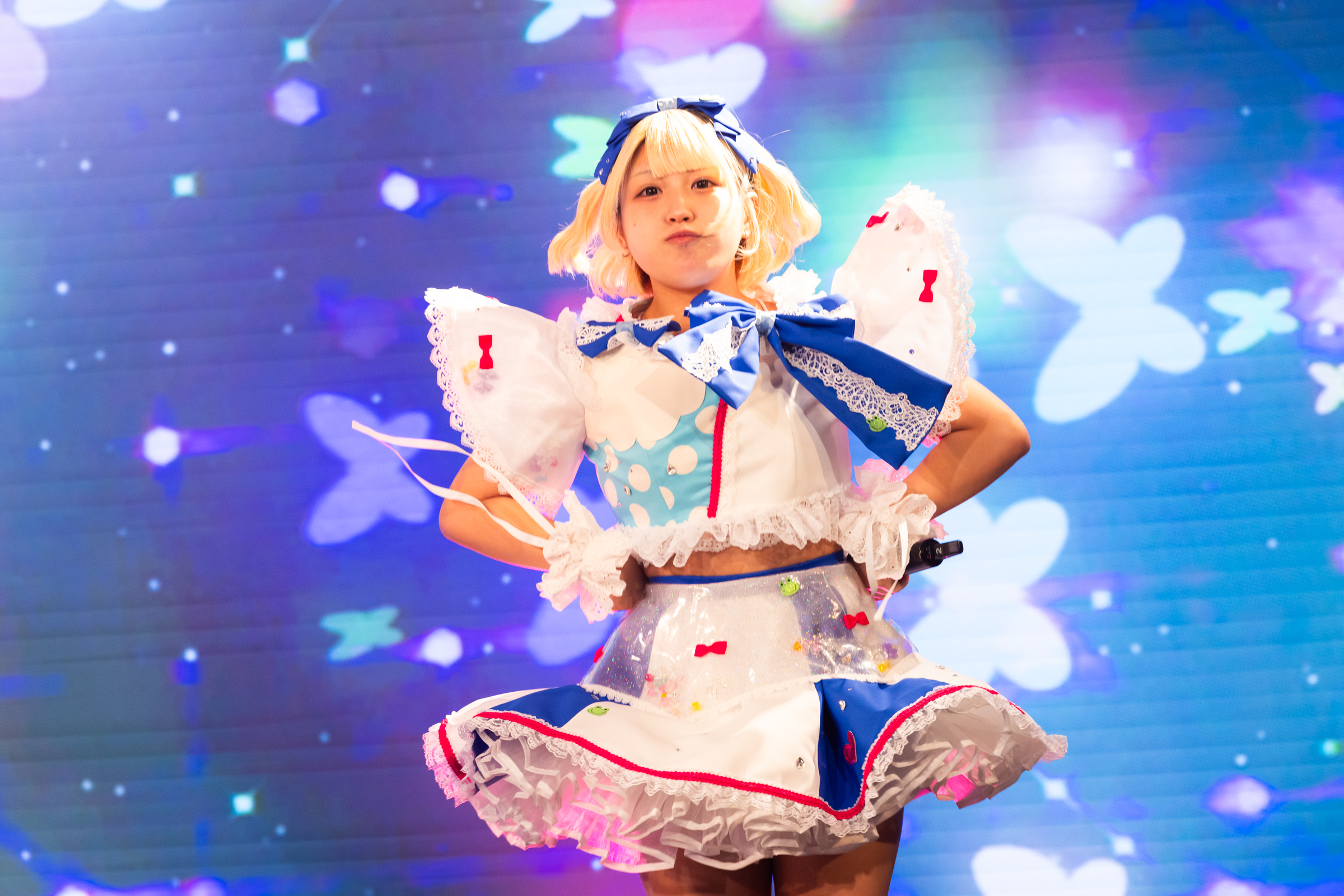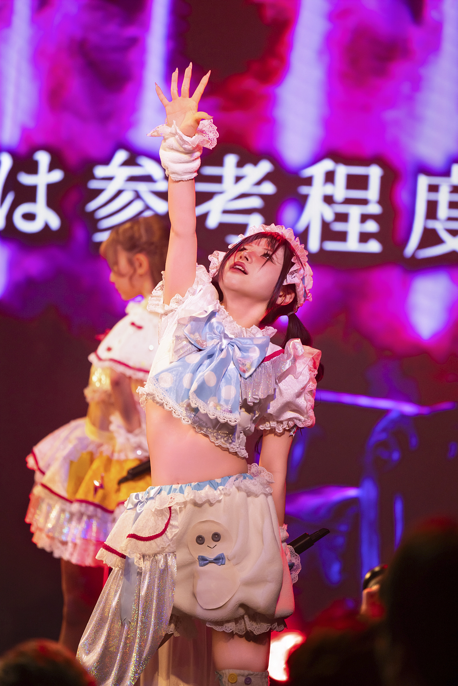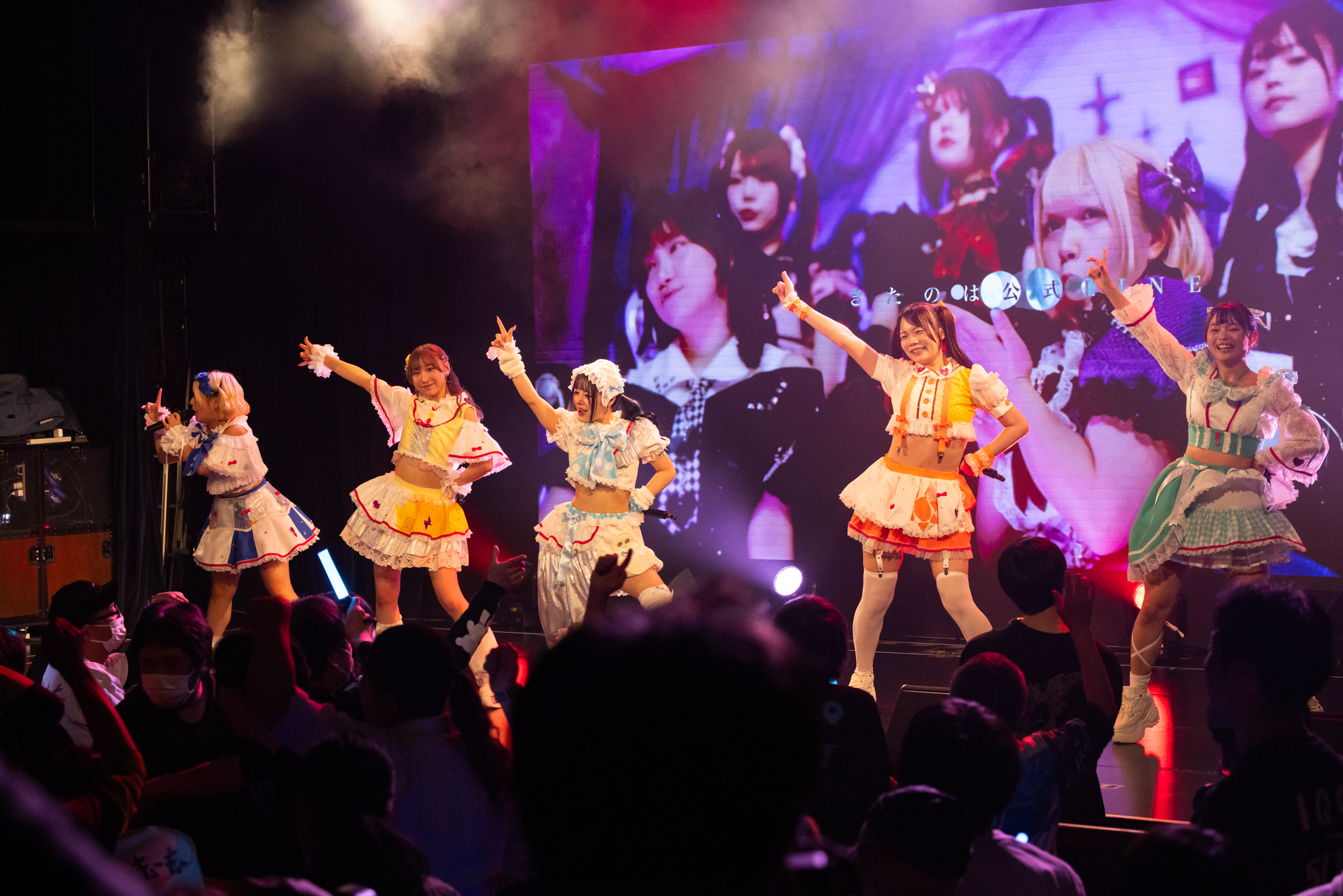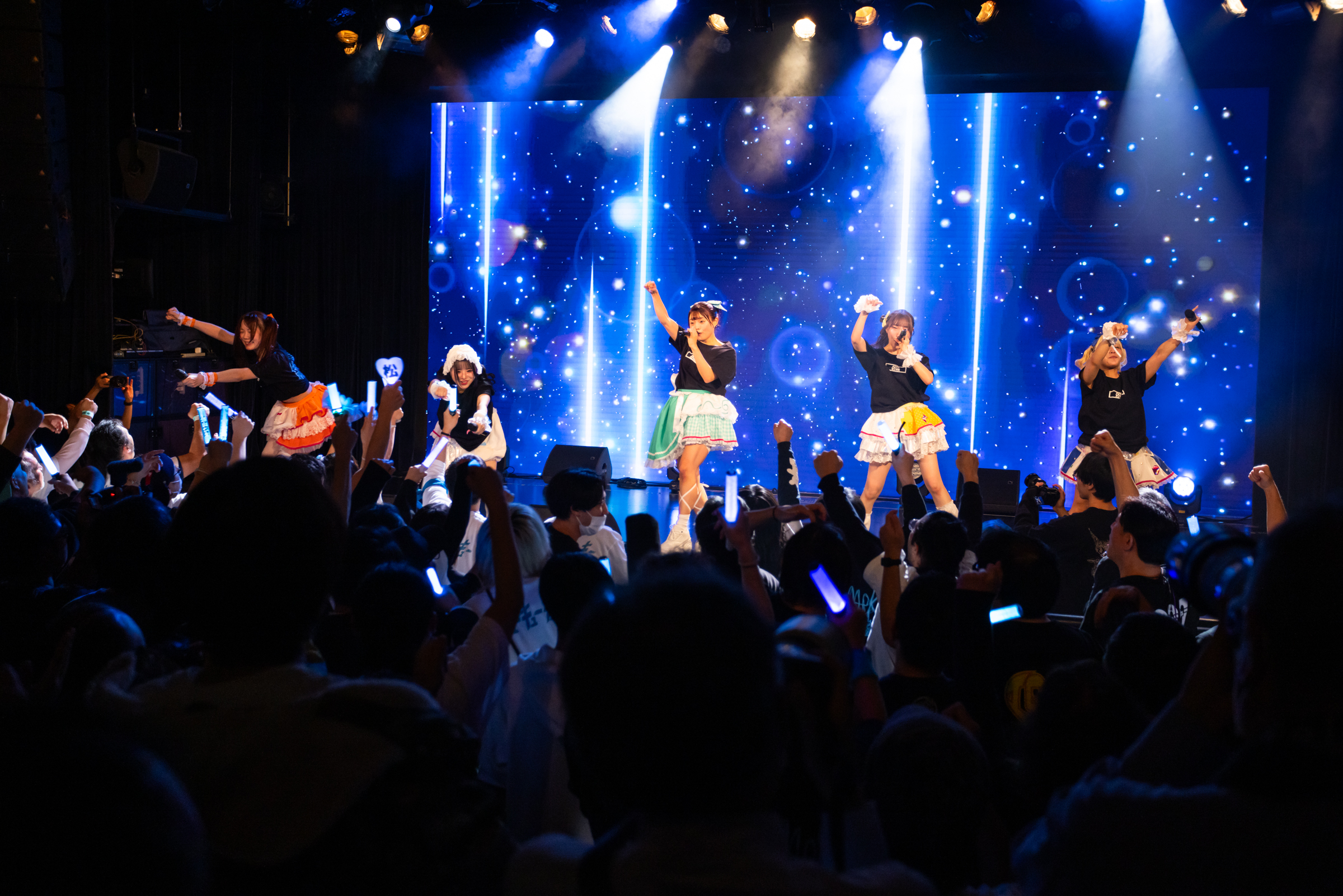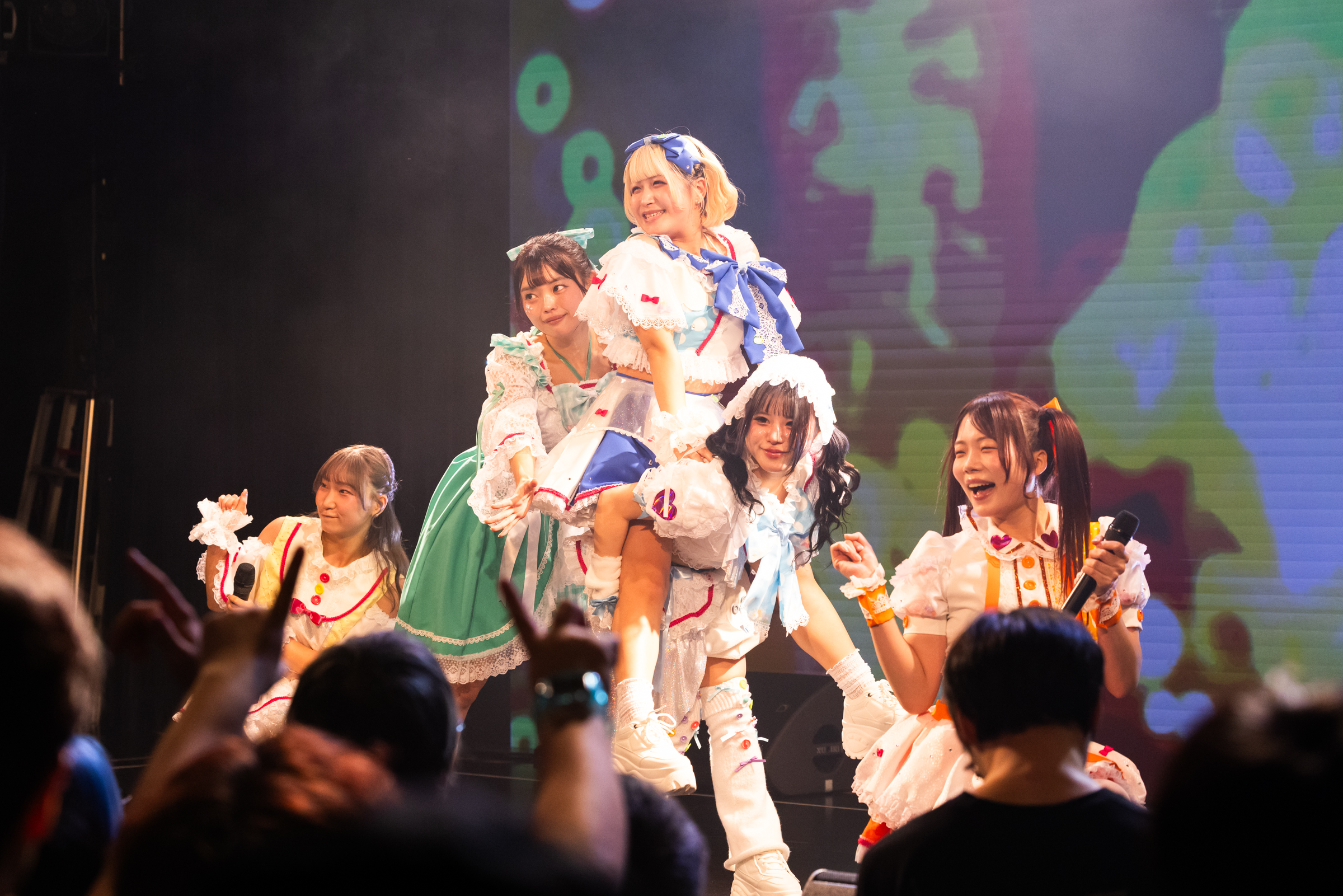 ライブでお馴染みの『ナカザワールドカオス』が飛びだしたとたん、場内のあちこちから、彼女らに向けて熱いかけ声が張り上がる。風を切って駆ける楽曲に乗せ、小ばぁびゐが自転車になって愛妹みいを乗せて走る場面も登場。5人のポジティブでハイテンションなパワーが、この会場を熱狂したカオスな空間に染め上げていった。