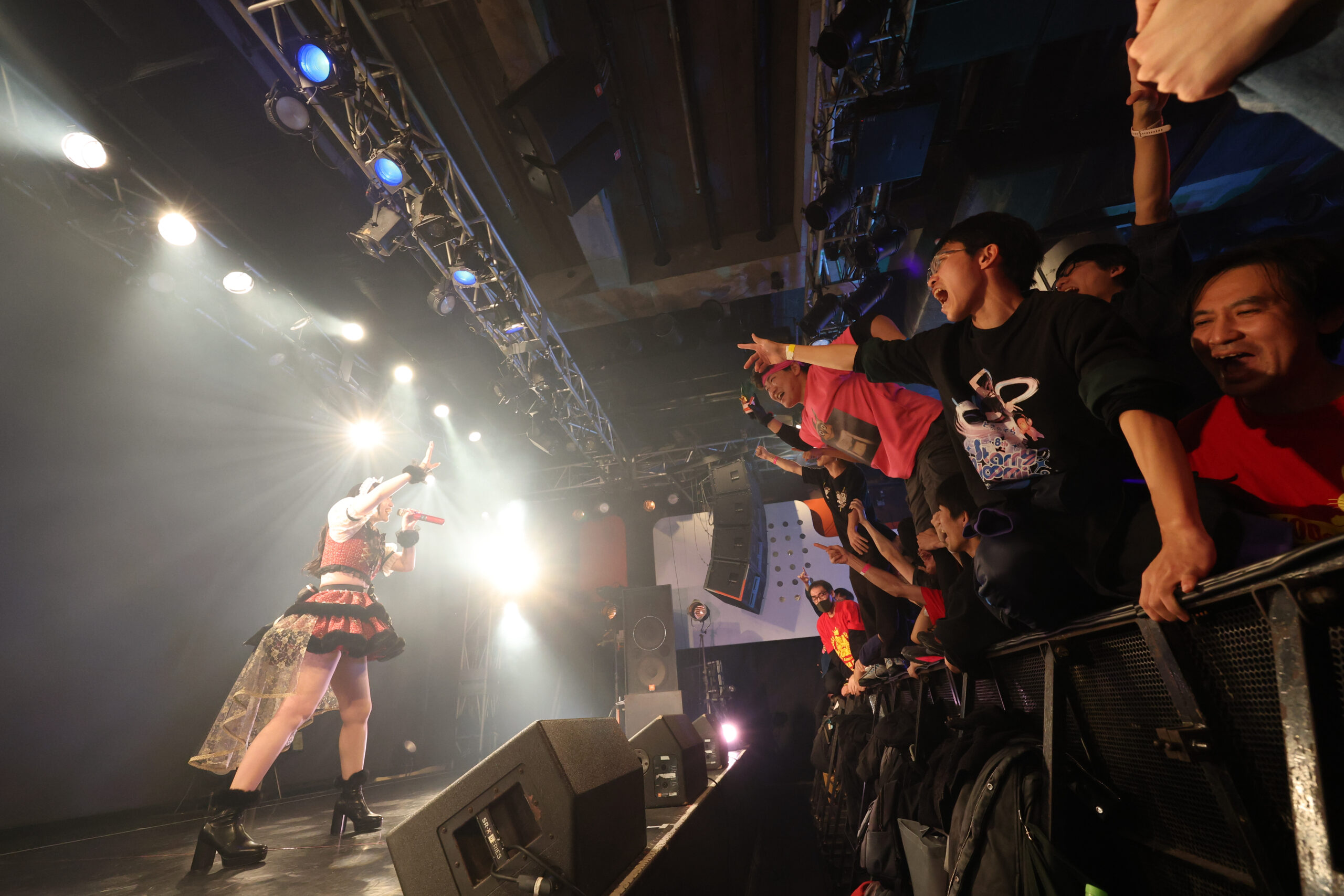 「ハッハッハッハッハッイヤ」と、上月せれなと観客たちが声を上げてはしゃいだのが、『回レ!雪月花』。サビで「回レ回レ回レ回レ」と煽る声に合わせて、フロアに、両隣の人と肩を組んでくるくると回るサークルも誕生。「ハッハッハッハッハッイヤ」と声を上げ、一緒に高く手を上げてはしゃぐ姿や、「回レ回レ回レ回レ」と歌うたびに、フロアに大きなサークルモッシュが生まれる景色が最強だ。