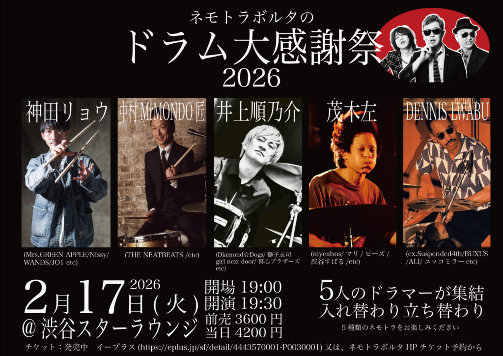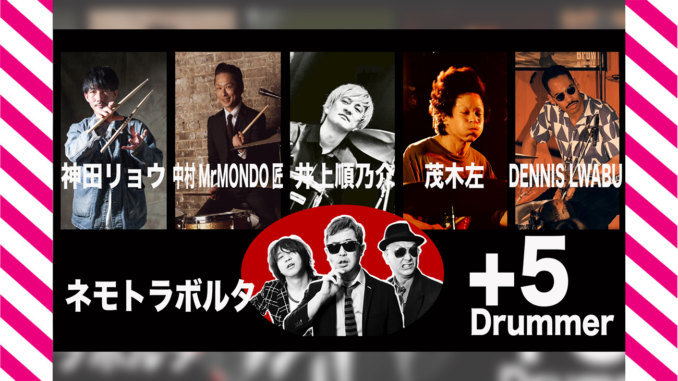 5人の凄腕ドラマーが一堂に会する『ドラム大感謝祭』 フーテンブルースロックバンド、ネモトラボルタ18周年! 2/17(火)渋谷スターラウンジにてワンマン開催!!