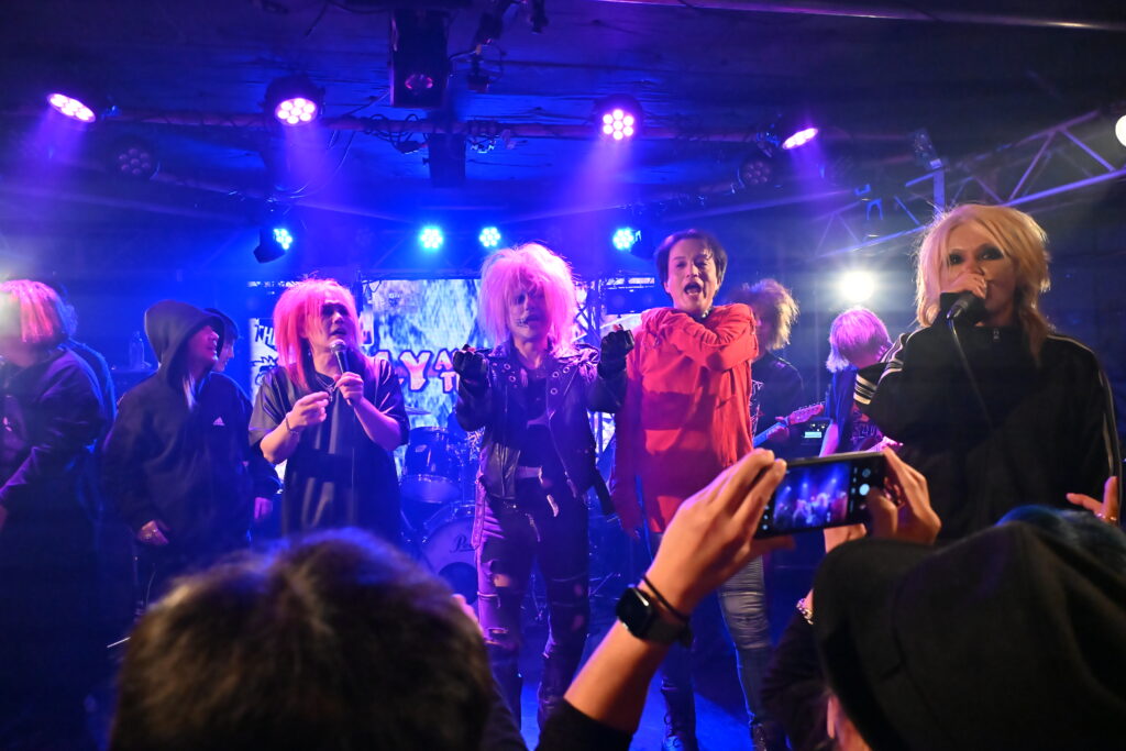 最後にSAMMYは、ステージにKEN石川(STEPPEN THE BLUE)、Hiofumi(Eins:Vier)、子レッズ(AURA)を呼び入れた。演奏をしたのが、パンクナンバーの『電撃BOP』(RAMONES)。数多くの歌い手たちが、演奏に乗せて、次々とマイクをリレー。ステージ上から高らかに響く「Hey Ho Let’s Go!!」のかけ声が、とにかく熱い。この手のセッションでは、フロア以上にステージ上がぐちゃぐちゃになるのがお馴染みの光景。この日も、ステージの上がカオスな状態になりながら、BILLY AND THE SLUTSの誕生日と、SAMMYの還暦を、はちゃめちゃな姿になって祝っていた。