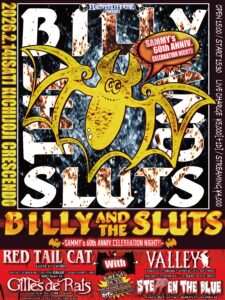 2月14日は、BILLY AND THE SLUTSの結成日。ヴォーカルのSAMMYの還暦(60歳)を迎える誕生日が近いこともあって、ひと足早くSAMMYの誕生日を祝おうと、結成日に当たる2月14日に吉祥寺Crescendoでイベント「〜HAUNTED HOUSE PRESENTS〜BILLY AND THE SLUTS~SAMMY’s 60th ANNIV.CELEBRATION NIGHT~」を行った。この日は、BILLY AND THE SLUTSを筆頭に、90年代から同じ時代を駆け続けてきたバンド仲間たちも、当時のバンドを復活したり、セッションバンドを組む形で大勢参加した(本文後を参照)。ここからは、BILLY AND THE SLUTSのライブの模様をお伝えしよう。