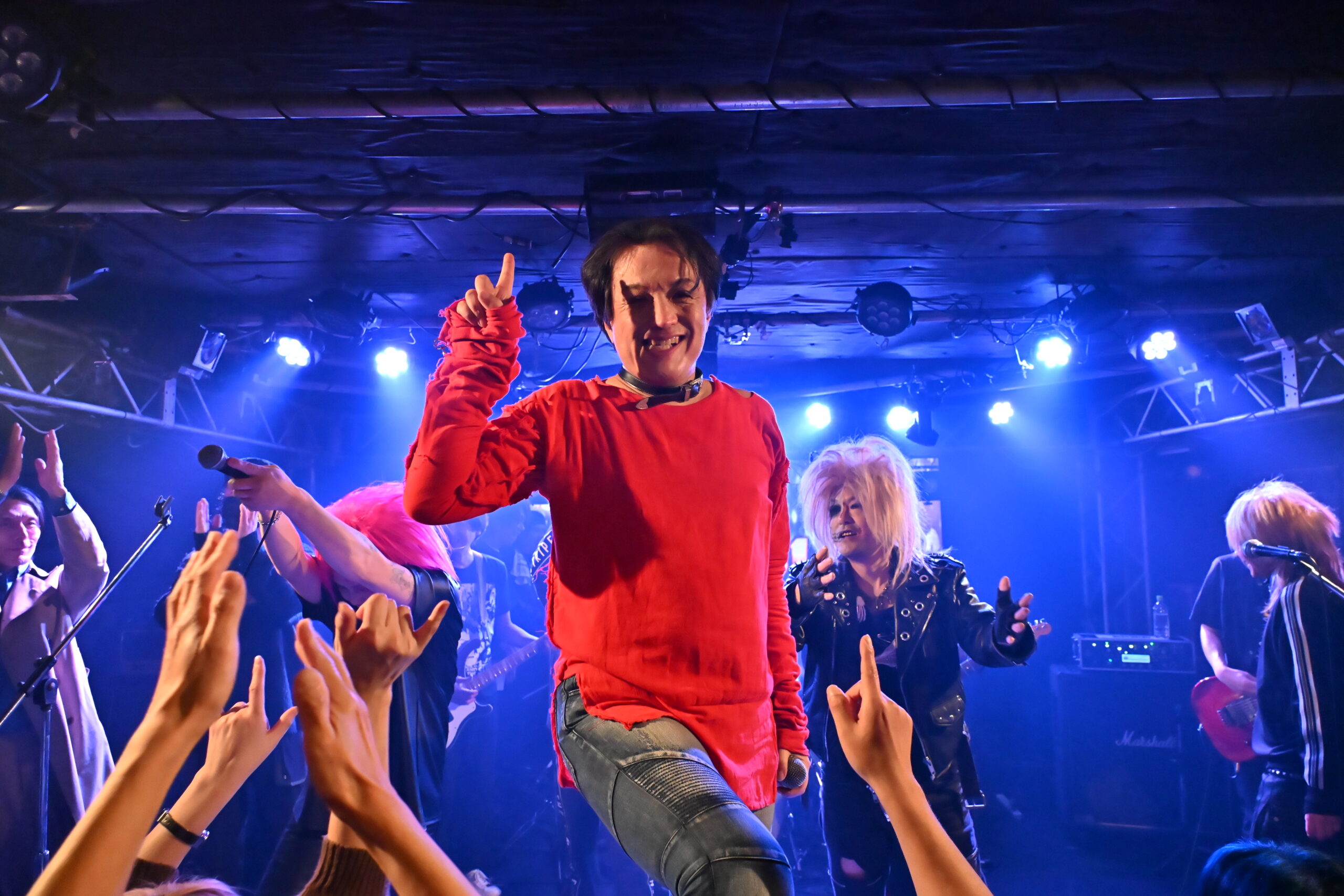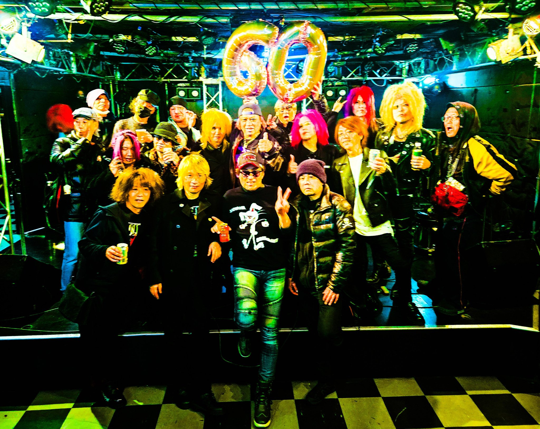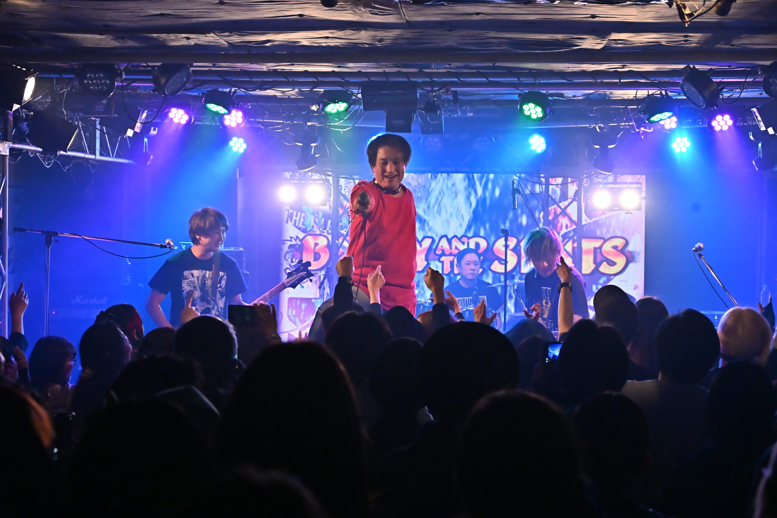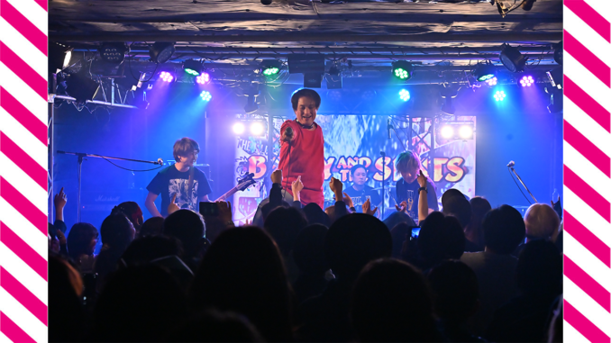 最後にSAMMYは、ステージにKEN石川(STEPPEN THE BLUE)、Hiofumi(Eins:Vier)、子レッズ(AURA)を呼び入れた。演奏をしたのが、パンクナンバーの『電撃BOP』(RAMONES)。数多くの歌い手たちが、演奏に乗せて、次々とマイクをリレー。ステージ上から高らかに響く「Hey Ho Let’s Go!!」のかけ声が、とにかく熱い。この手のセッションでは、フロア以上にステージ上がぐちゃぐちゃになるのがお馴染みの光景。この日も、ステージの上がカオスな状態になりながら、BILLY AND THE SLUTSの誕生日と、SAMMYの還暦を、はちゃめちゃな姿になって祝っていた。
