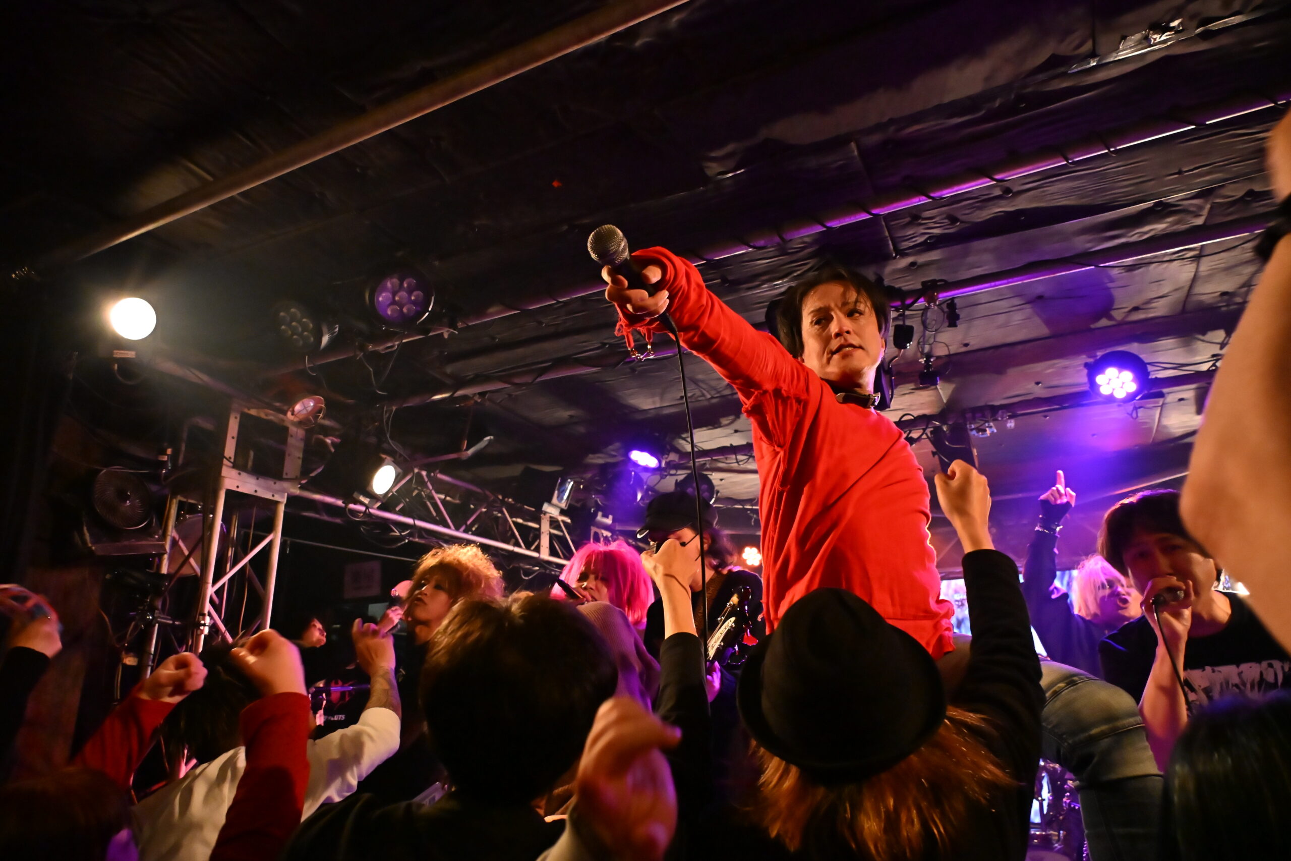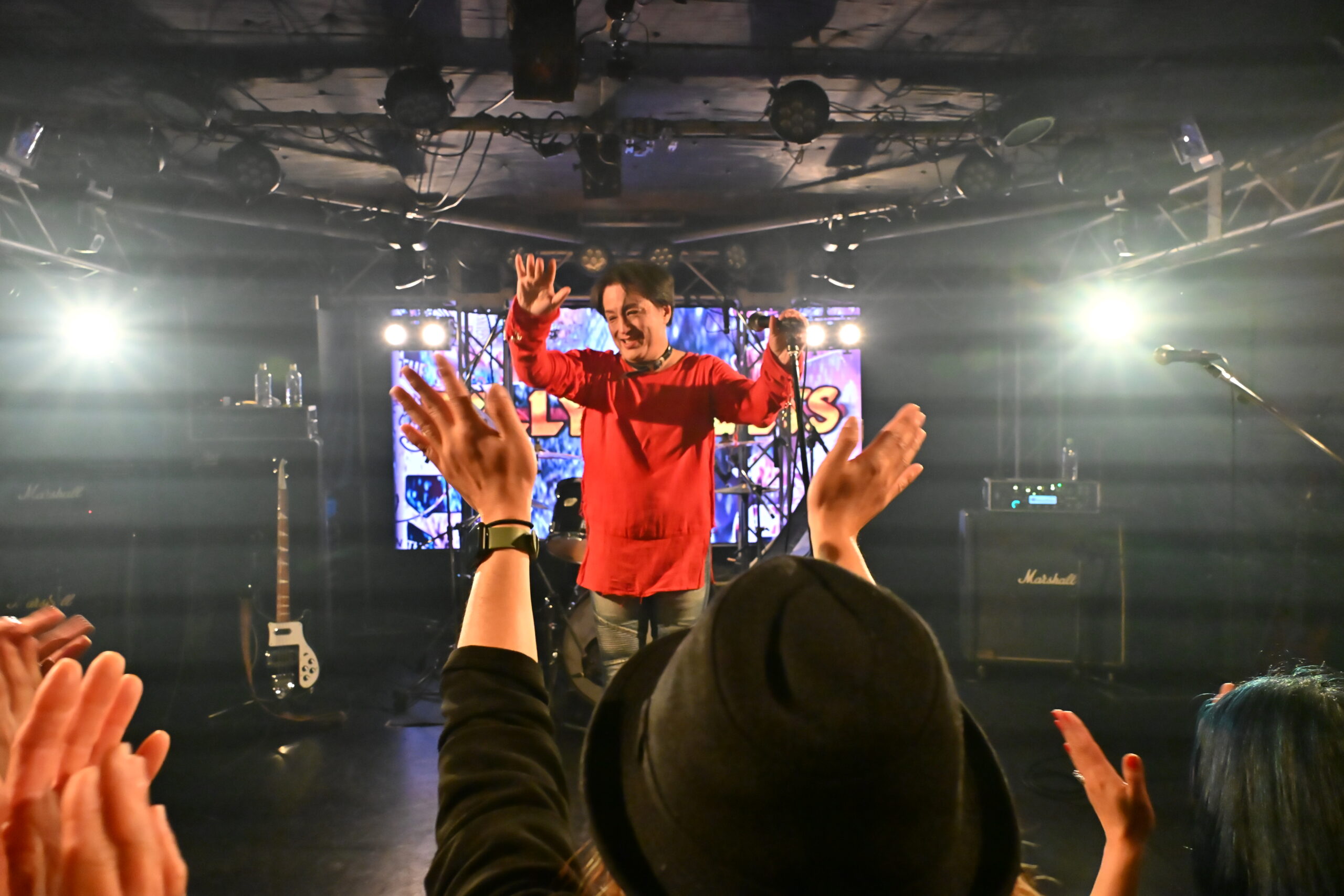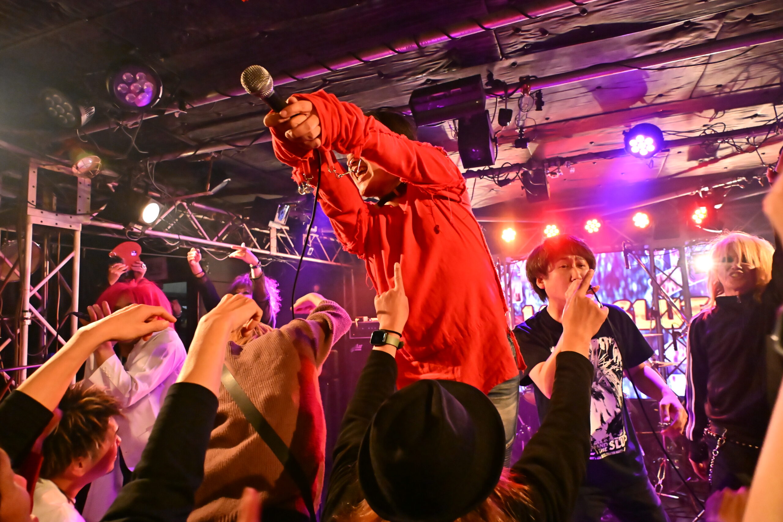 最後にSAMMYは、ステージにKEN石川(STEPPEN THE BLUE)、Hiofumi(Eins:Vier)、子レッズ(AURA)を呼び入れた。演奏をしたのが、パンクナンバーの『電撃BOP』(RAMONES)。数多くの歌い手たちが、演奏に乗せて、次々とマイクをリレー。ステージ上から高らかに響く「Hey Ho Let’s Go!!」のかけ声が、とにかく熱い。この手のセッションでは、フロア以上にステージ上がぐちゃぐちゃになるのがお馴染みの光景。この日も、ステージの上がカオスな状態になりながら、BILLY AND THE SLUTSの誕生日と、SAMMYの還暦を、はちゃめちゃな姿になって祝っていた。
