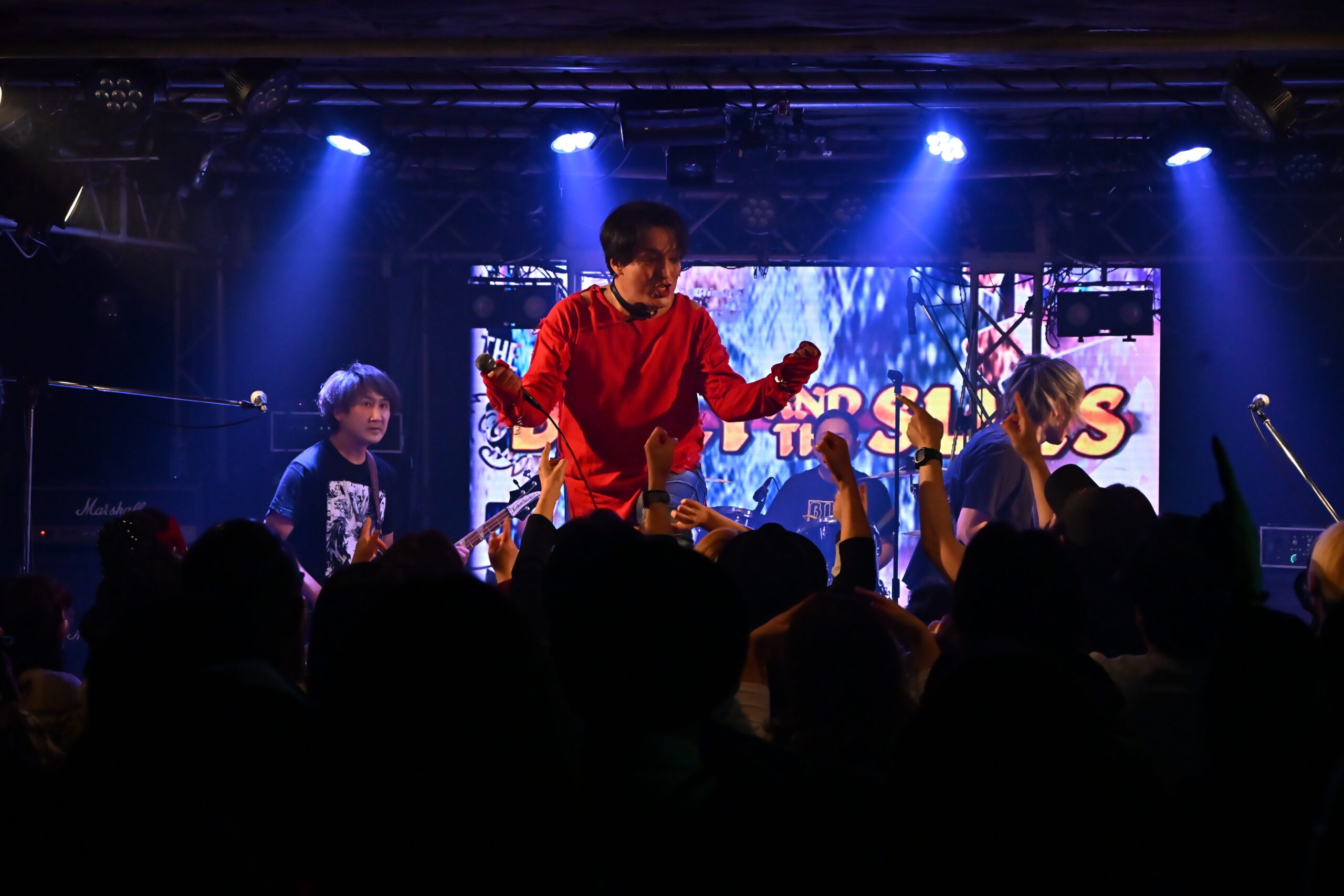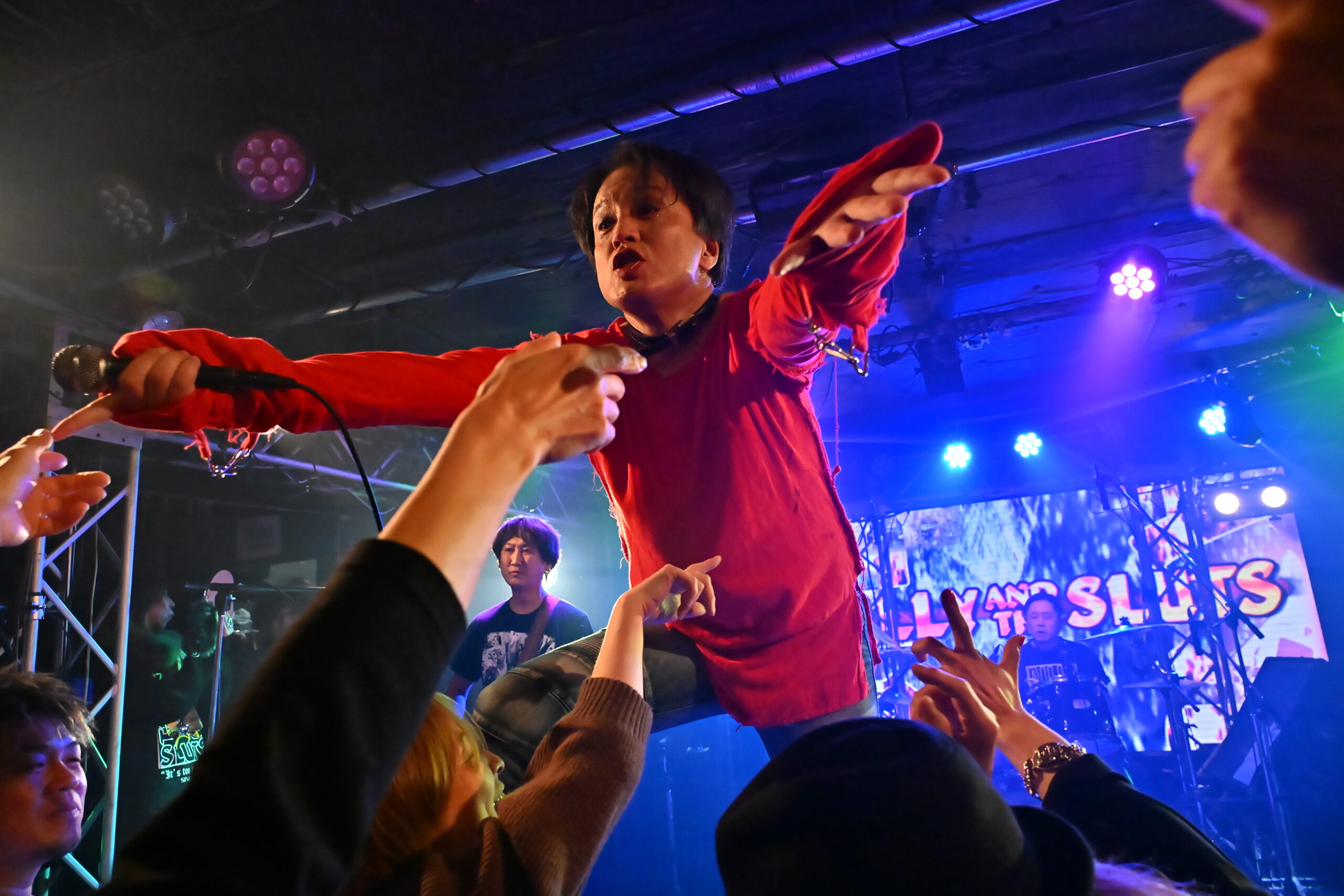 攻撃的なのに胸をくすぐるキャッチーなギターのリフが、騒ぎたい気持ちのスイッチを力強く押す。SAMMYがモニターに足を乗せて『イツモノヨウニ』を歌いだしたとたん、フロア中でも騒ぐ人たちが大勢生まれだす。ギターのHIKARIは現在、アイドルグループのプロデュースも手がけている。彼が完全サウンド・プロデュースを担うグループの一つHOT DOG CATがカバーしていることで、今やアイドルシーンでも、この曲のファンが多いし、『イツモノヨウニ』を通してBILLY AND THE SLUTSのことを知るという逆転現象も起きている。この日も、SAMMYが「いつものように いつものままで いつものように 笑顔のままで」と歌う声に合わせて、笑顔で手遊びをする人たちがあちこちに誕生していた。途中でSAMMYが、客席で騒いでいたLUCY(Red Tail Cat)にマイクを渡して歌わせる場面も登場。名曲は時代を駆け抜けるというが、まさに令和の今でも、この曲は多くの信者を生み出している。