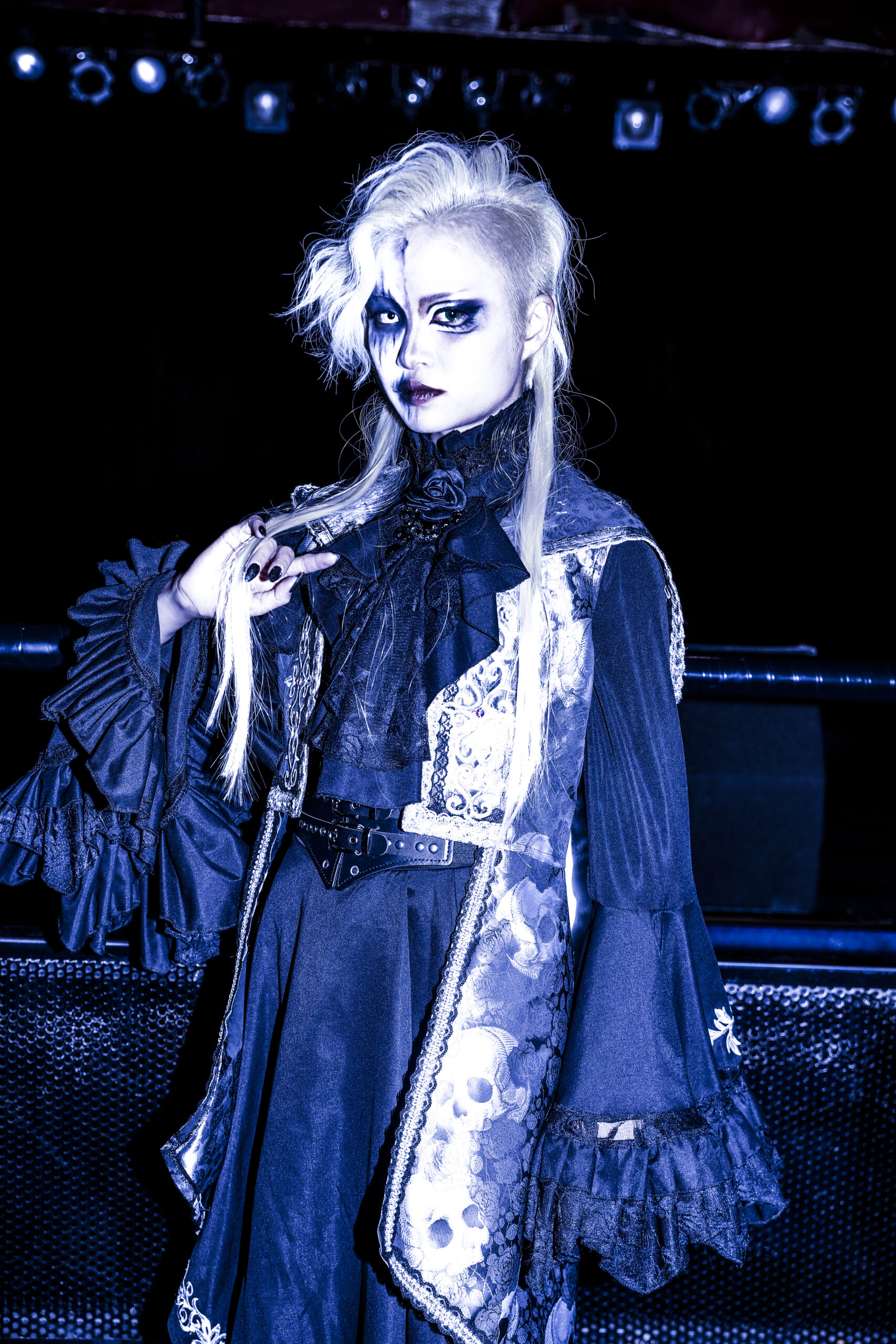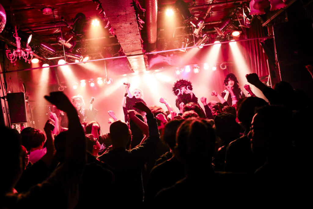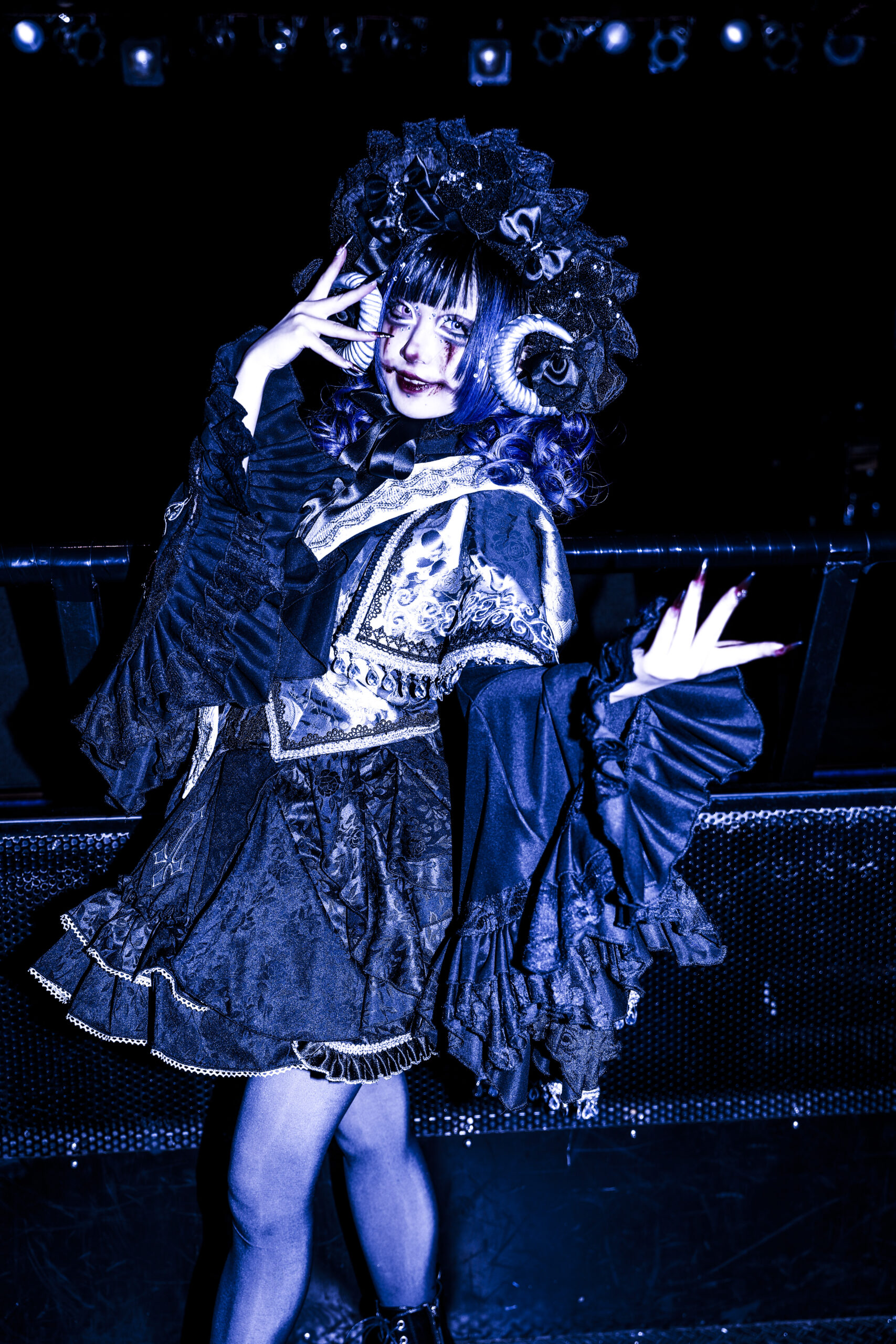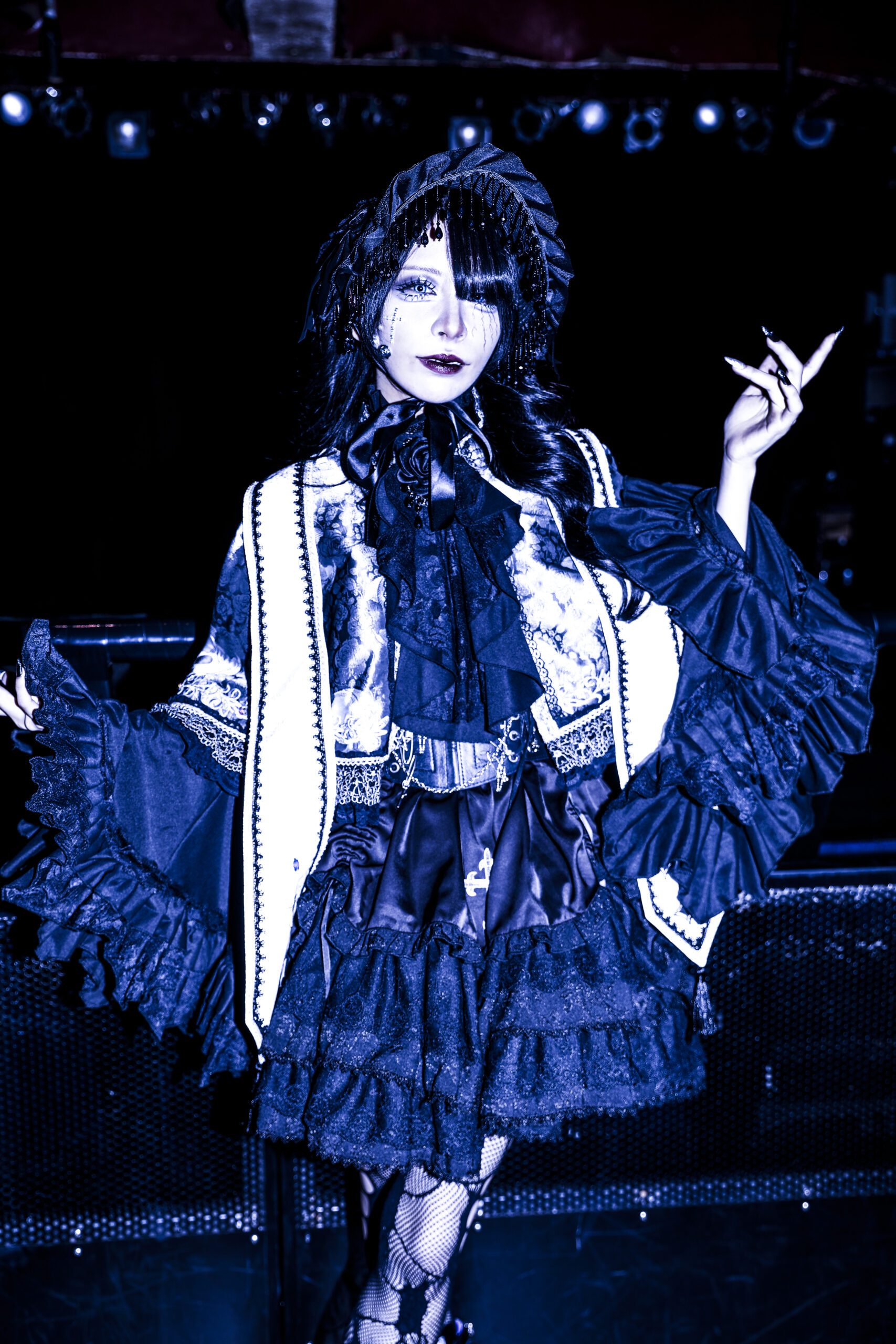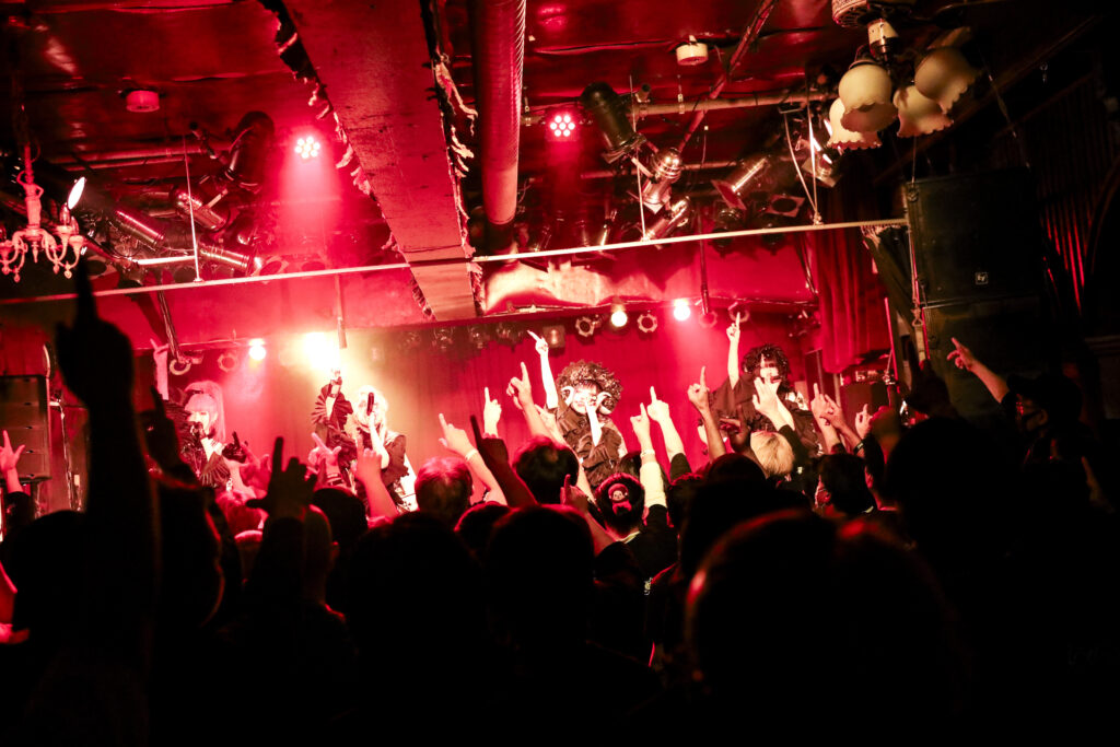 重厚で激しいシンフォニックな音色が響きだした。その上でメンバーらが叫ぶのを合図に、楽曲は一気に荒れ狂いだす。maleficiumのライブに黒い熱狂の景色を作りあげる『Distopia』だ。美しくもエモい歌声の調べに心を踊らせながらも、轟音シンフォニックでゴシックな音の洗礼に触れ、身体を大きく折り畳み、拳を振り上げずにはいられなかった。まるで黒い洗礼を受けた人たちを漆黒のユートピアへと導くように、彼女たちは世紀末をつかさどる破壊の女神となり、甘美な歌声の調べで観客たちの理性の螺子をどんどん歪ませ、狂わせていく。さらに美しくも狂熱の世界へと連れ出すように、maleficiumは『月は無慈悲な夜の女王』を歌いだした。CHIHO FUKUDAと夜縋らるむの絡み合う歌声に導かれ、アルカード・アリスとセシルの煽りにひれ伏すように、ノイズのような黒い轟音の中、美しくも甘美に響く彼女たちの歌声に、心が嬉しく奮えていた。だから、彼女たちが誘うままに「Oi!Oi!」と声を荒らげ、魂を奮い立てるように拳を振り上げ、叫び続けていた。4人の感情と観客たちの気持ちが一つに重なり、この場を黒い熱狂の景色に染めあげていく。そのうえで…。