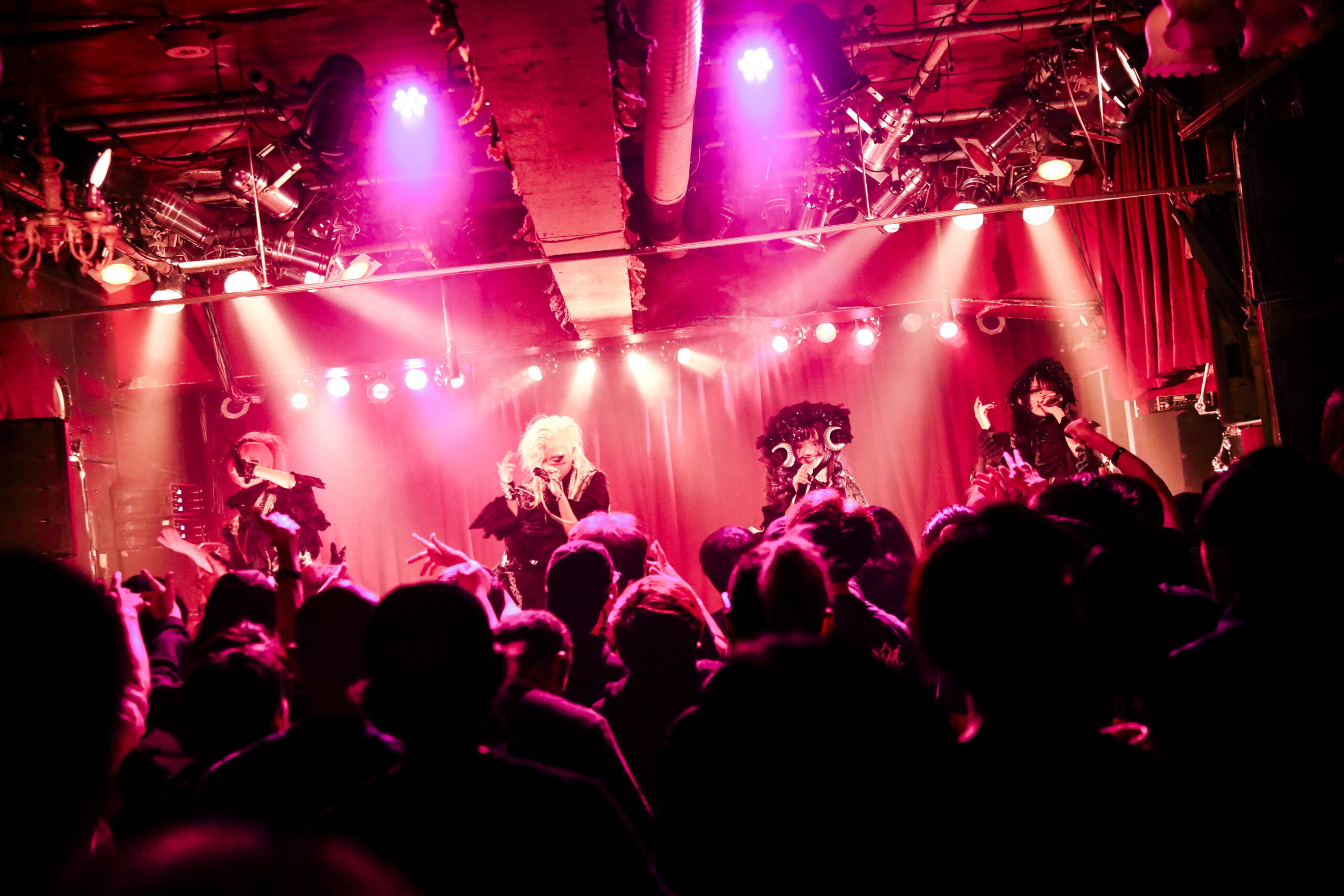 彼女たちは、「今が最強であり、最狂のメンバー」と口にしてきた。maleficiumの創設メンバー、夜縋らるむとCHIHO FUKUDA。maleficiumに赤い衝撃を降り注いだ、アルカード・アリス。新加入のセシルは、maleficiumに新しい化学反応を引き起こした。そんな4人だからこそ生まれたのが、最新配信シングル『Noir〜ノワール〜』だった。同曲を発表してからのmaleficiumは、より攻撃性を際立たせた楽曲に乗せて感情を剥きだしたライブ姿を毎回見せてきた。進化や変化を貪欲に求める彼女たちが、今ある一つの進化の形を示すべく、4月6日に渋谷チェルシーホテルでワンマン公演「Noir~赤と黒が交差する背徳の晩餐~」を行った。新衣装のお披露目公演にもなった、満員の観客たちを前にしたこの日の模様を、ここにお伝えしたい。